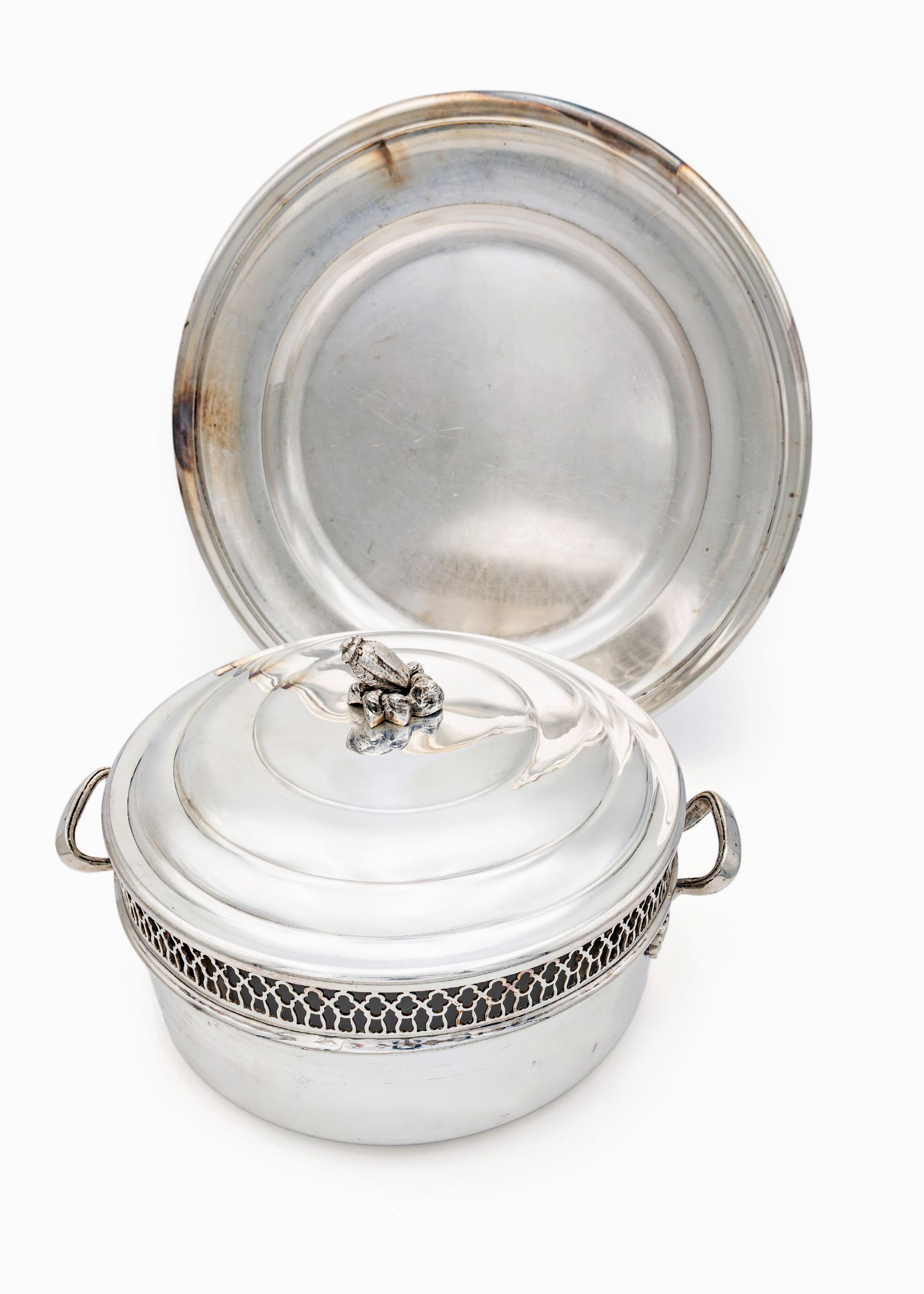 Porta pirofila circolare in metallo argentato con coperchio e vassoio
