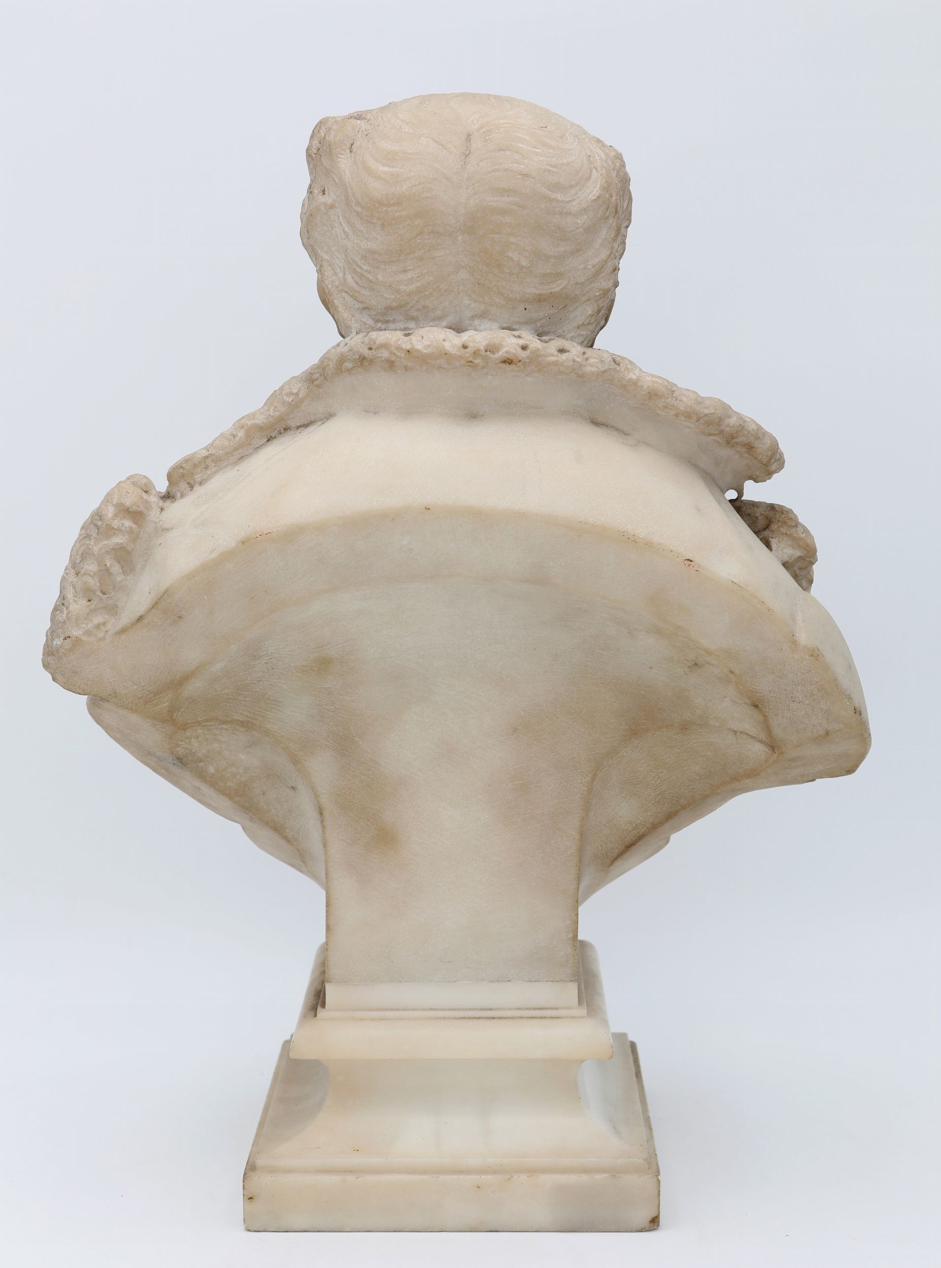 busto in marmo, altezza cm 38 rappresentato a mezzo busto, con i caratteristici lunghi baffi piegati verso l’alto e la barba; la fronte lievemente stempiata. Al collo pende il collare dell’ordine della Santissima Annunziata. Sul petto, in alto alla sua sinistra, sono appuntate una serie di medaglie non riconoscibili. Sulle spalle appoggia un cappotto bordato di pelliccia. Piedistallo squadrato
