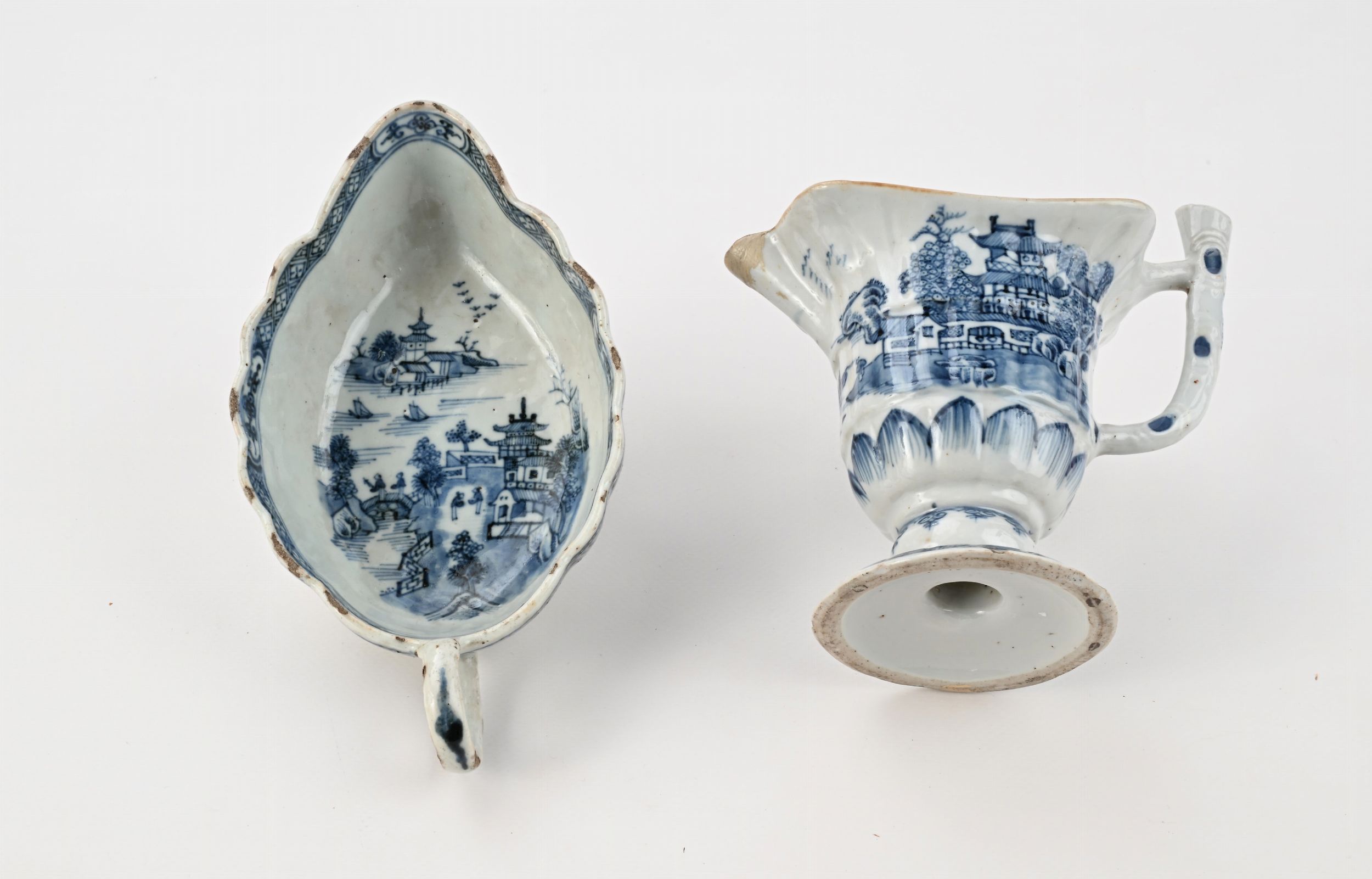 Salsiera a navicella e brocchetta in porcellana bianca e blu, Compagnia delle Indie, [..]