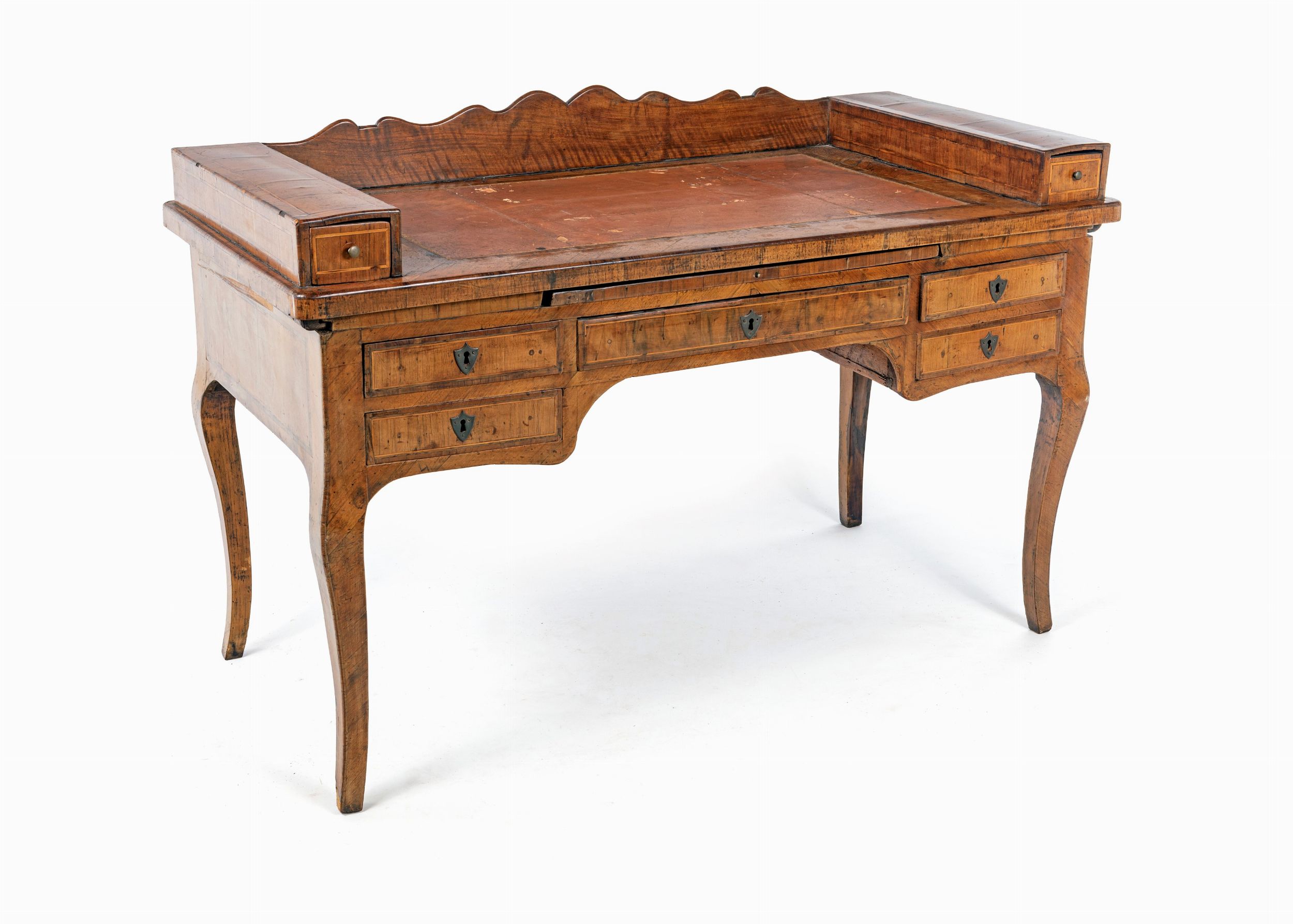 cm 92x145x73 piano scorrevole ad angoli arrotondati rivestito in pelle con tablette estraibile sottostante, sormontato da lunghi cassetti disposti ai lati riuniti da una traversa posteriore con profilo sagomato; un cassetto al centro della fascia affiancato da due in colonna disposti ai lati, gambe mosse