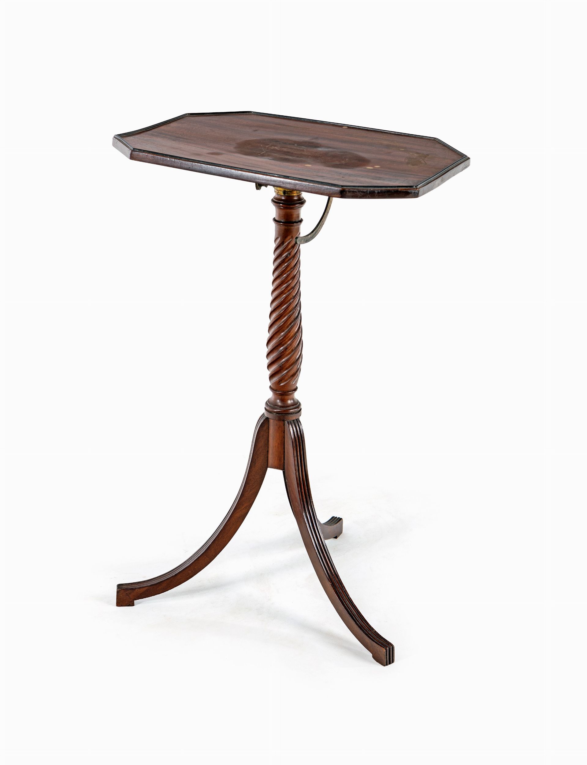 piano rettangolare a vela con spigoli tronchi, sostegno a tortiglione, tripode a sciabola