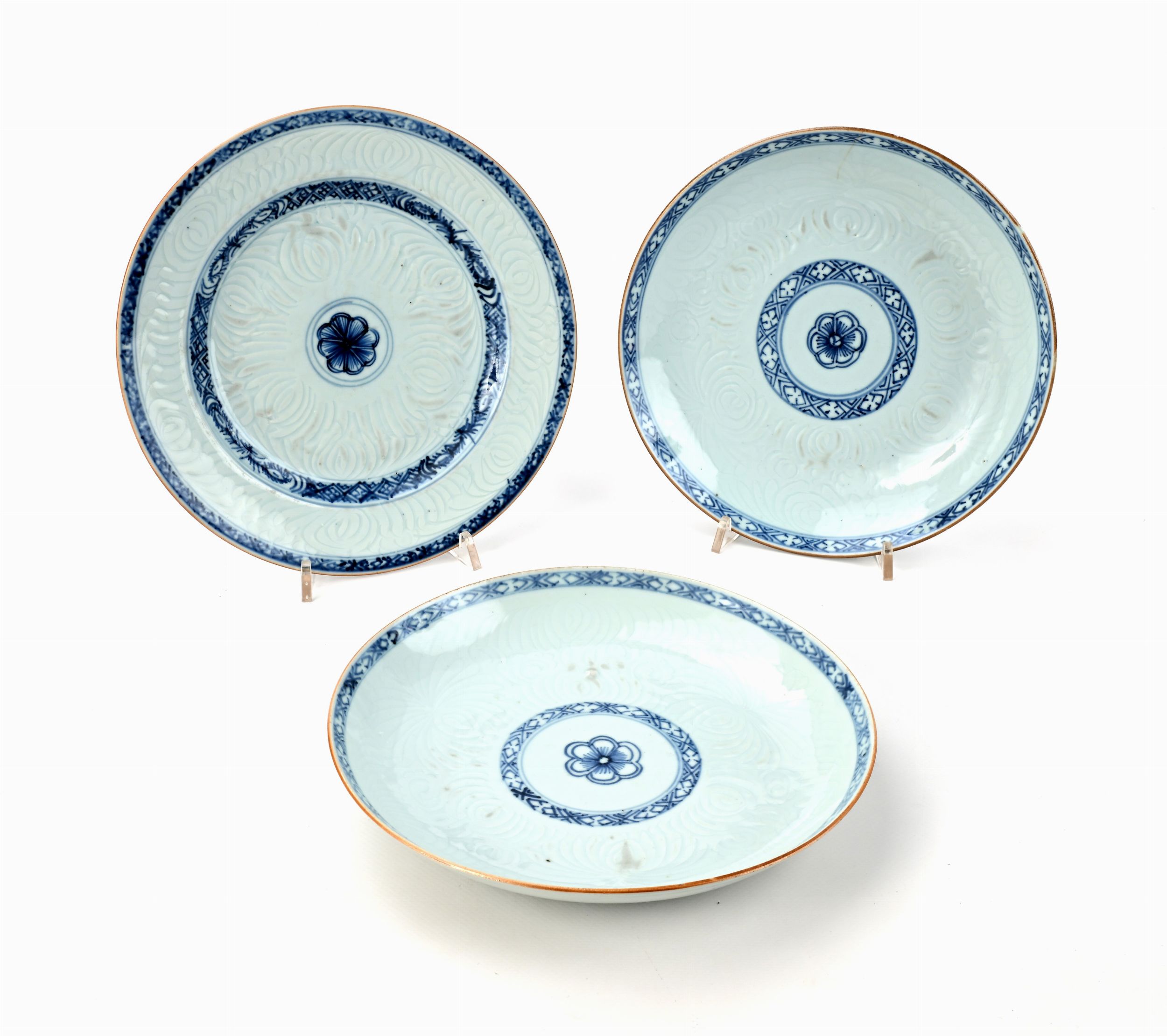 Tre piatti simili in porcellana bianca e blu, Cina, XVIII secolo