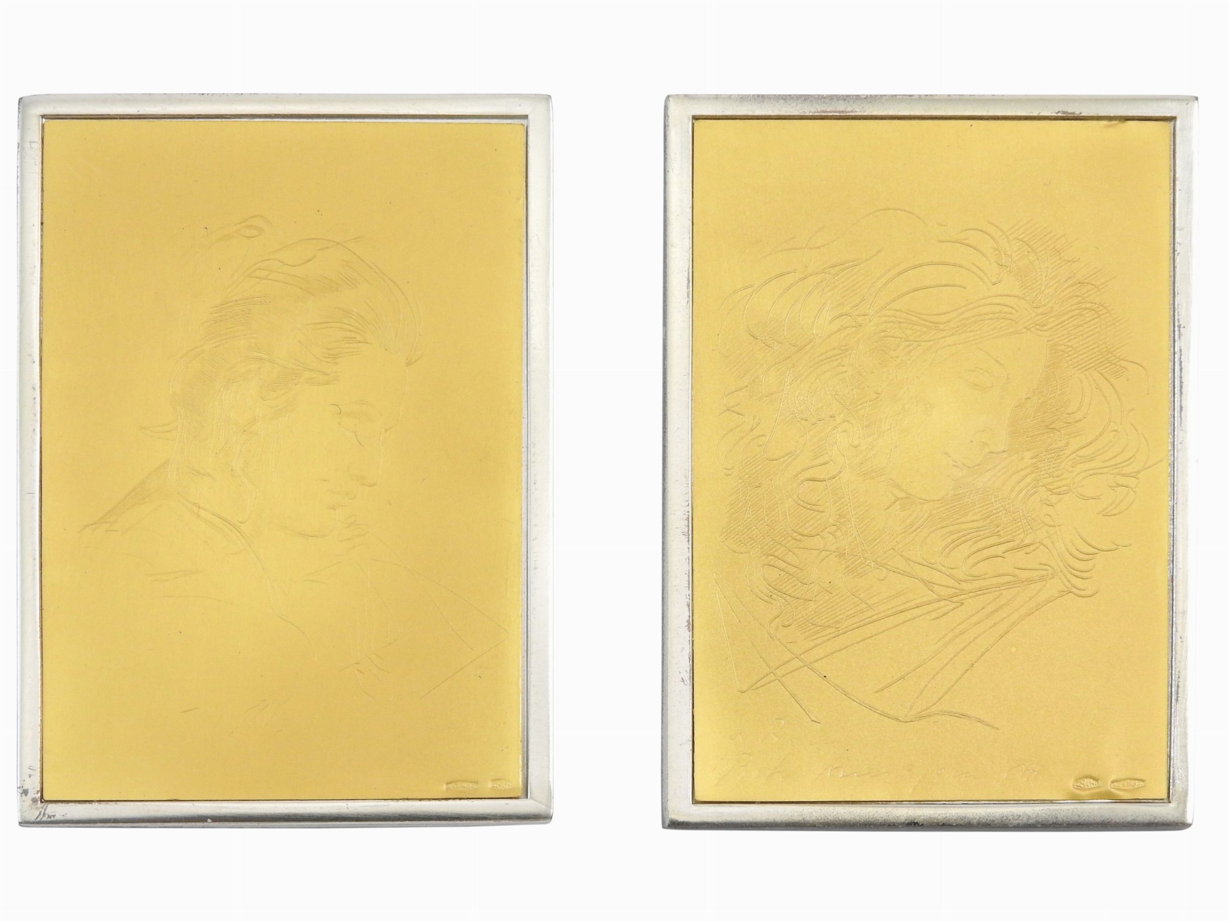 Coppia di incisioni su lastra in oro 998/1000 con supporto in argento 925/1000
