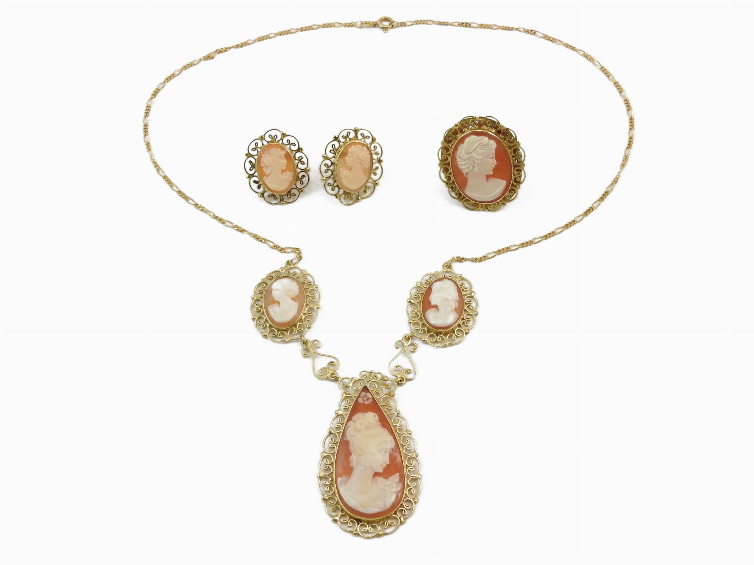 Demi-parure collana, anello e orecchini in oro giallo con cammei in conchiglia