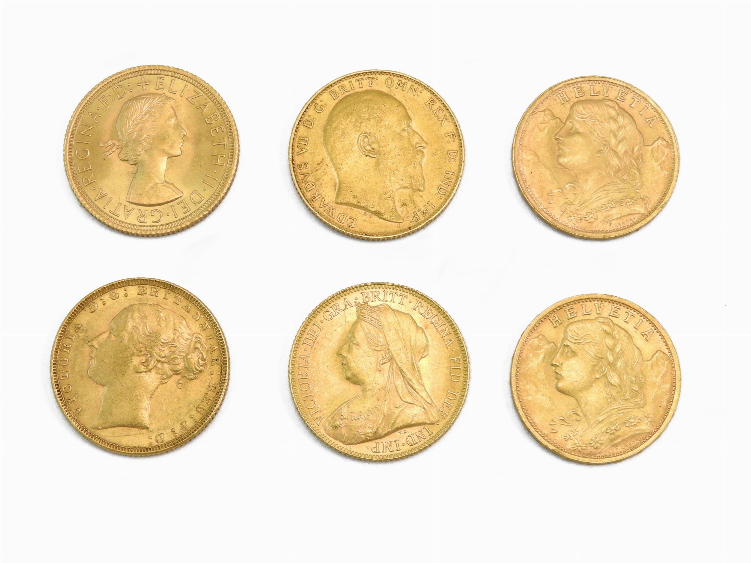 Quattro Sterline e due 20 Franchi Svizzeri in oro