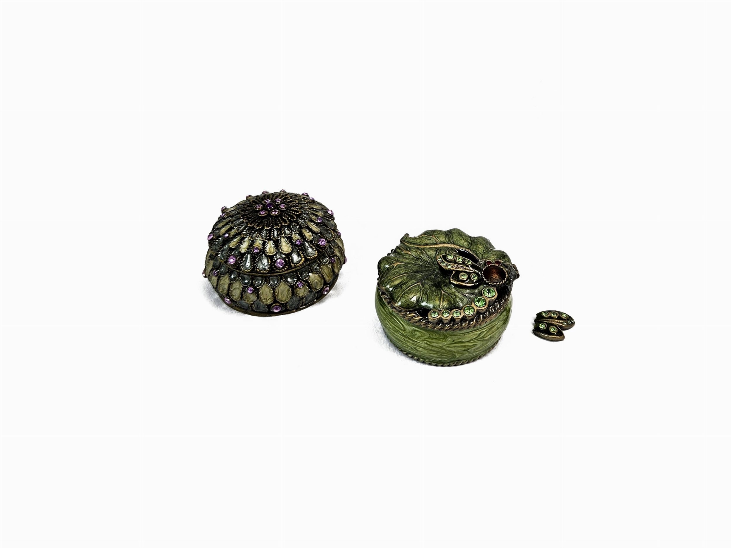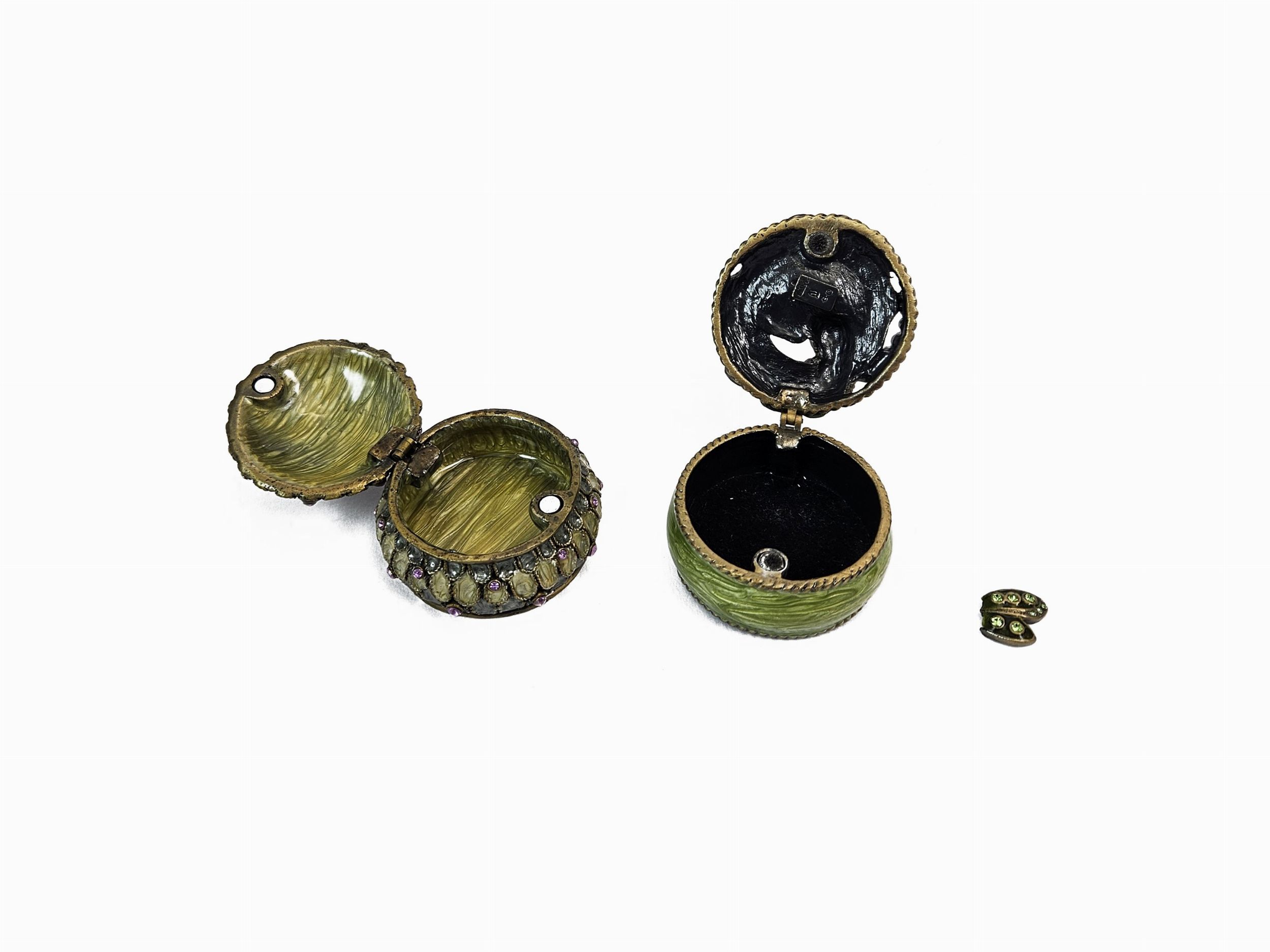 in metallo brunito, una con smalti e strass rosa, l'altra in smalto verde con difetti