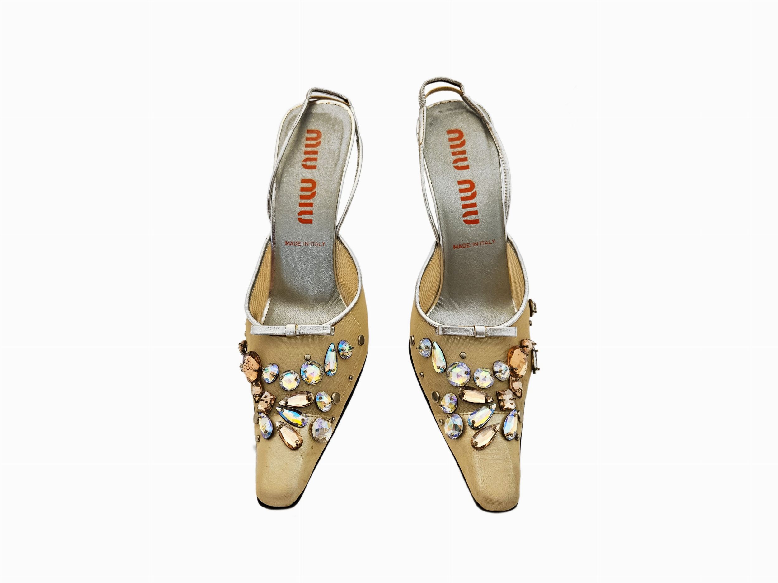 Miu Miu - Decolleté in pelle color argento e rete dorata con strass