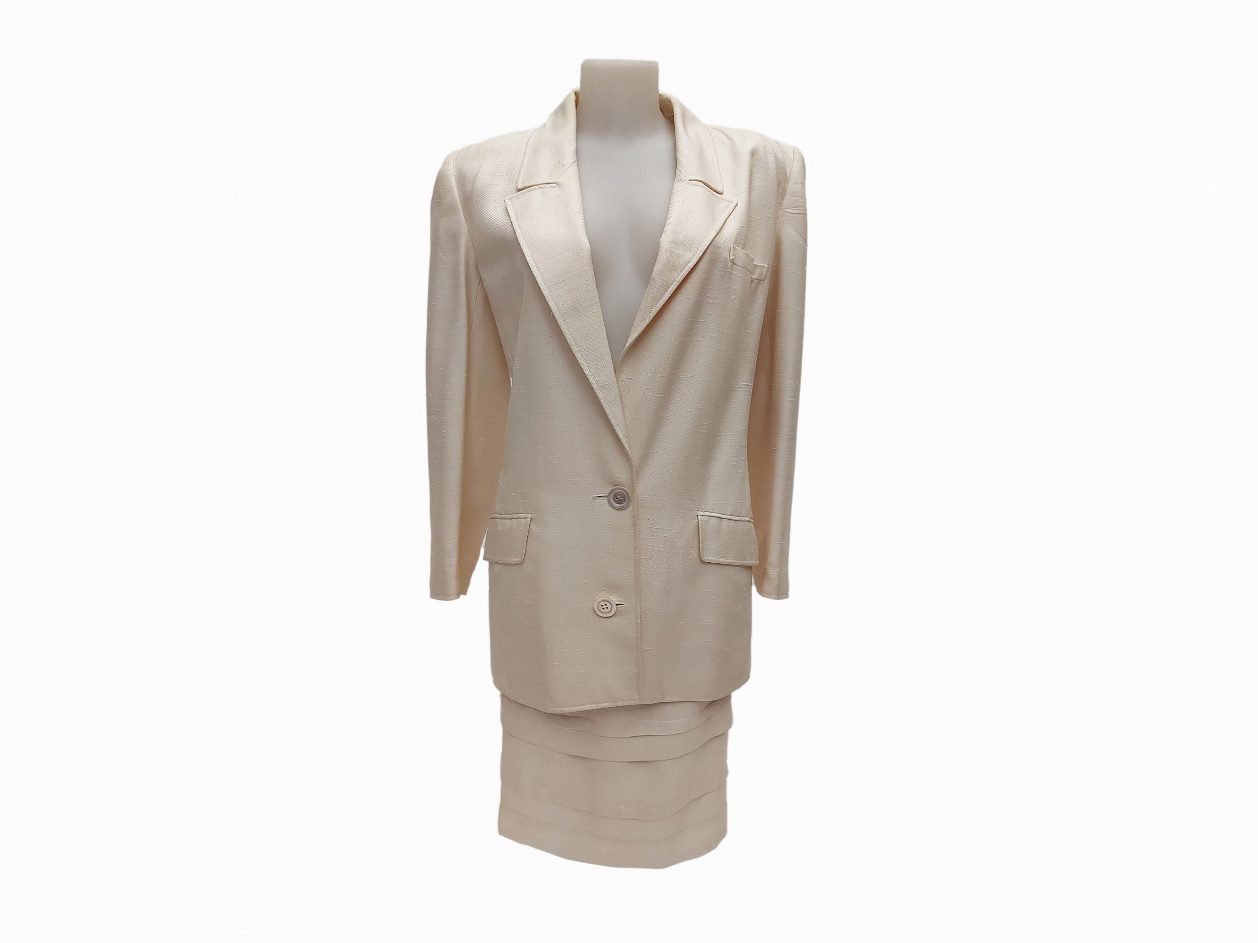Anni Ottanta composto da giacca sahariana, gonna e pantaloni, lievi segni d'uso, cartellini tagliati ma attribuibile a Valentino