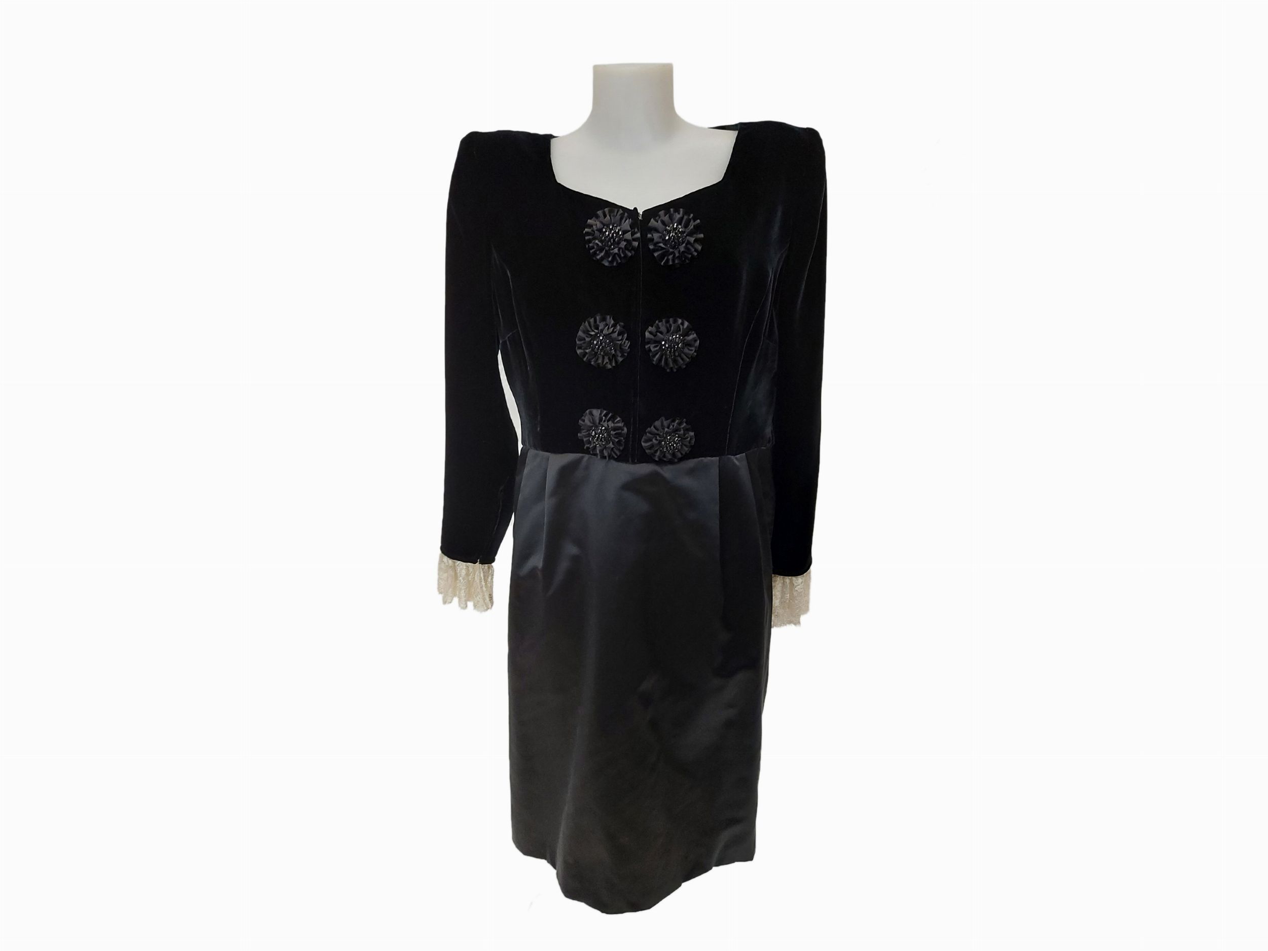 Anni Sessanta/Settanta con polsini in pizzo e coccarde applicate al corpetto, lievi difetti