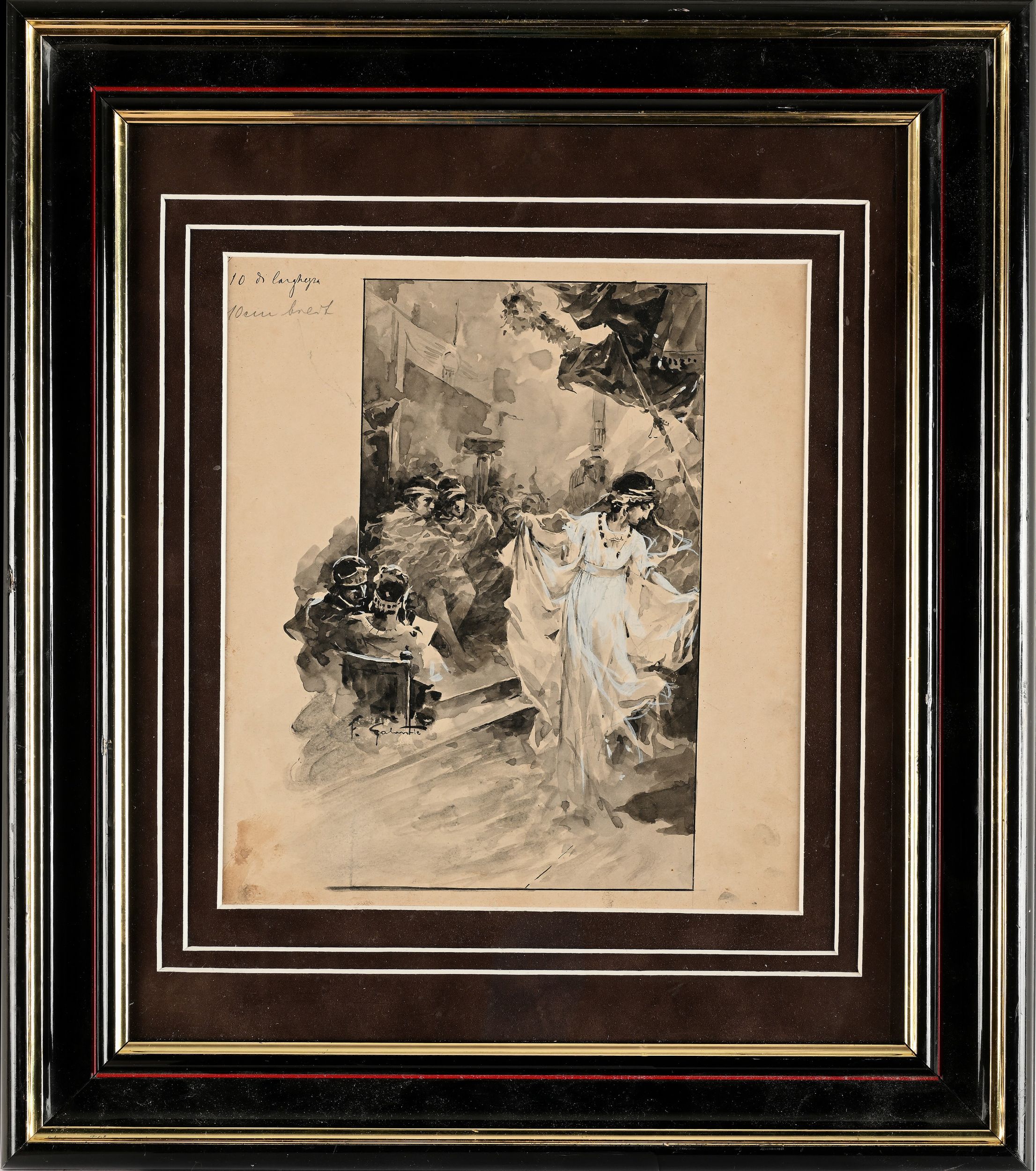 Acquerello e biacca su cartoncino, cm 23 x 26 - in cornice cm 42 x 47 1907 Firmato in basso verso sinistra: 'F. Galante'. Si tratta di una tavola per la versione illustrata italiana della ‘Salomè’ di Oscar Wilde, edita dalla Libreria Editrice Bideri di Napoli nel 1907.