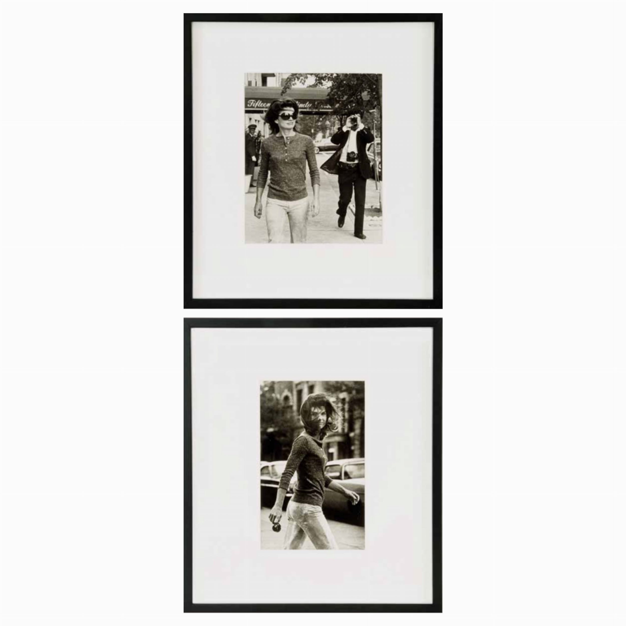 NYC, 7 October 1971 (Diptych, photo 1 by Joe Smith) 2 Vintage gelatin silver prints Photo 1 cm 24, 5 x 15 - Photo 2 cm 24 x 19,5 Each signed, titled, dated and stamped on verso Each framed (black wood) size cm 42 x 37 Original provenance: The artist, Montville, USA It was late in the afternoon around 4.30 PM. I finished photographing a model, Joe Smith, who needed pictures for her portfolio. I wasn’t getting payed for it so I thought I might as well shoot in Central Park across from Jackie’s apartment in case I get lucky, and I did! Upon leaving the park I saw Jackie leave her apartment on 85th Street and head towards Madison Avenue. Joy could not believe it was Jackie! We were behind her at 85th street and Madison Avenue. Jackie made a left going north. I decided not to run in front of her, if I did she would have put on those dark glasses. So we hopped a cab to get in front of her so she couldn’t see me. “Follow that woman!” I told the cab driver. For once, Jackie’s instincts were all wrong; instead of turning away she turned right towards ma after hearing the first two clicks of the camera from the cab window. After getting out of the cab she spotted me and immediately put on sungalsses. I then handed Joy one of my cameras with a wide angle lens and prefocused to 15 feet. I told her to get the two of us together. Both Joy and I were clicking and laughing until Jackie furious turned and said “Are you pleased with yourself?” Well I knew then to stop and said “Thank you !” This is my favorite photo because it captures the qualities of paparazzi style; offguard, unrehearsed, spontaneous; the dramatic soft backlighting and the over-the-shoulder composition show her at her sexiest. She was casually dressed, wore no make-up and her hair was windblown which all added up to natural beauty. This is in contrast to the usual studio style picture. All the natural elements worked for me, including a little luck! Da Vinci had his “Mona Lisa” and I have my “Windblown Jackie”, my favorite, the most famous photo of Jackie. Ron Galella © 2004 Photology Editions Ron Galella Esxclusive Diary