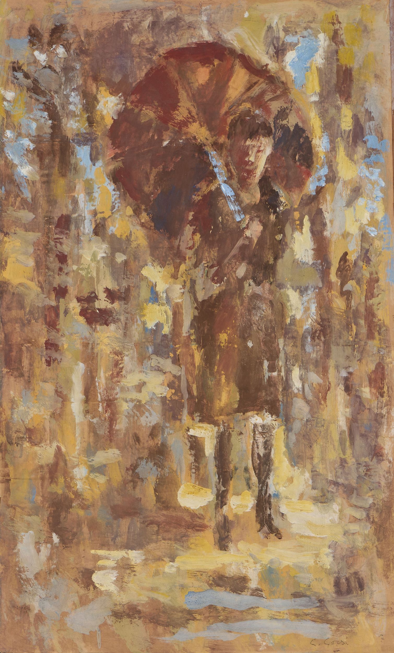Gouache e tempera su carta applicata su cartoncino, cm 98x60 Firma in basso a destra: C. Corsi. Al verso del cartoncino: cartiglio con firma e titolo: C. Corsi / All'aperto: etichetta parzialmente abrasa [Biennale] Internazionale d'Arte / [Vene]zia - 1954.