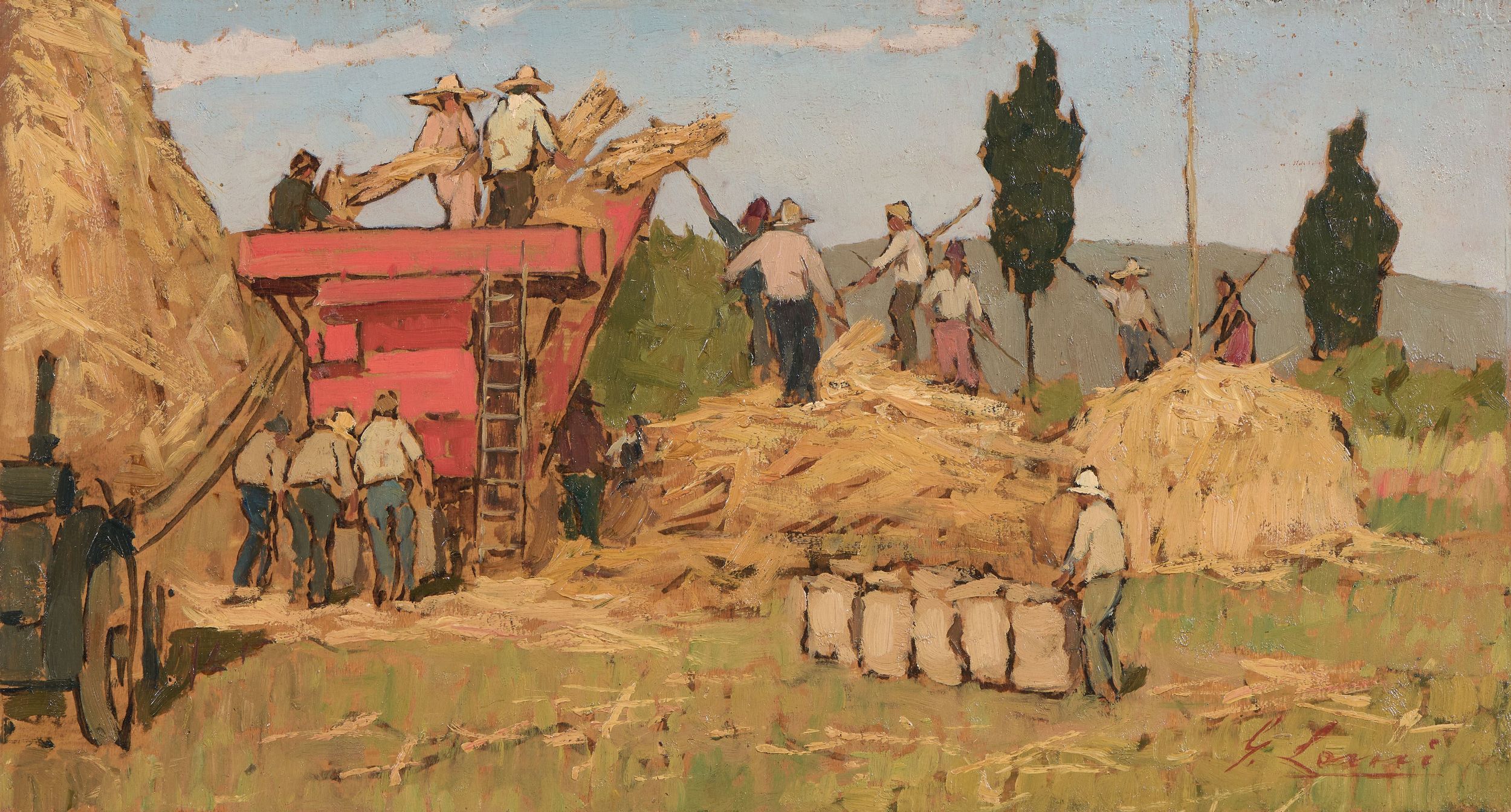 Firma in basso a destra: G. Lomi. Al verso: cartiglio con scritta 44 / Trebbiatura.