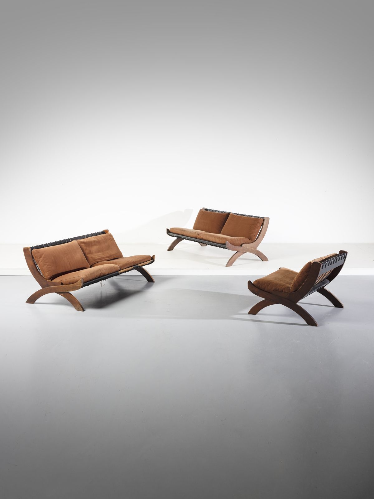 Dimensioni: divano 66 x 166 x 82 cm. poltrona 65 x 82 x 82 cmBibliografia: G. Gramigna, Repertorio del design italiano 1950-2000 per l'arredamento domestico, Allemandi, Torino 2021, p. 117