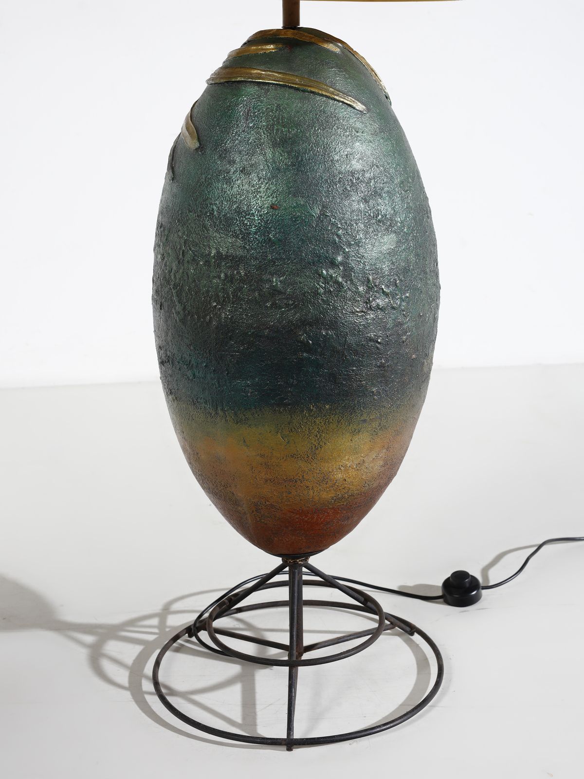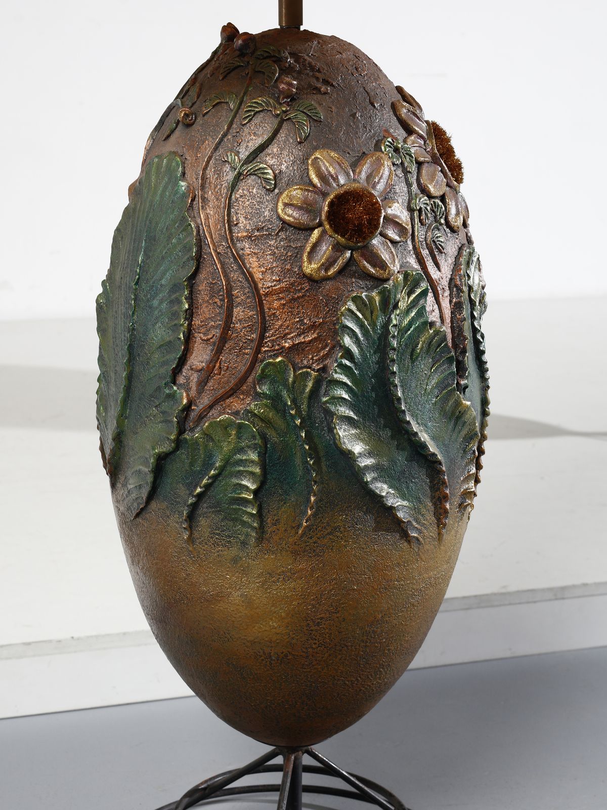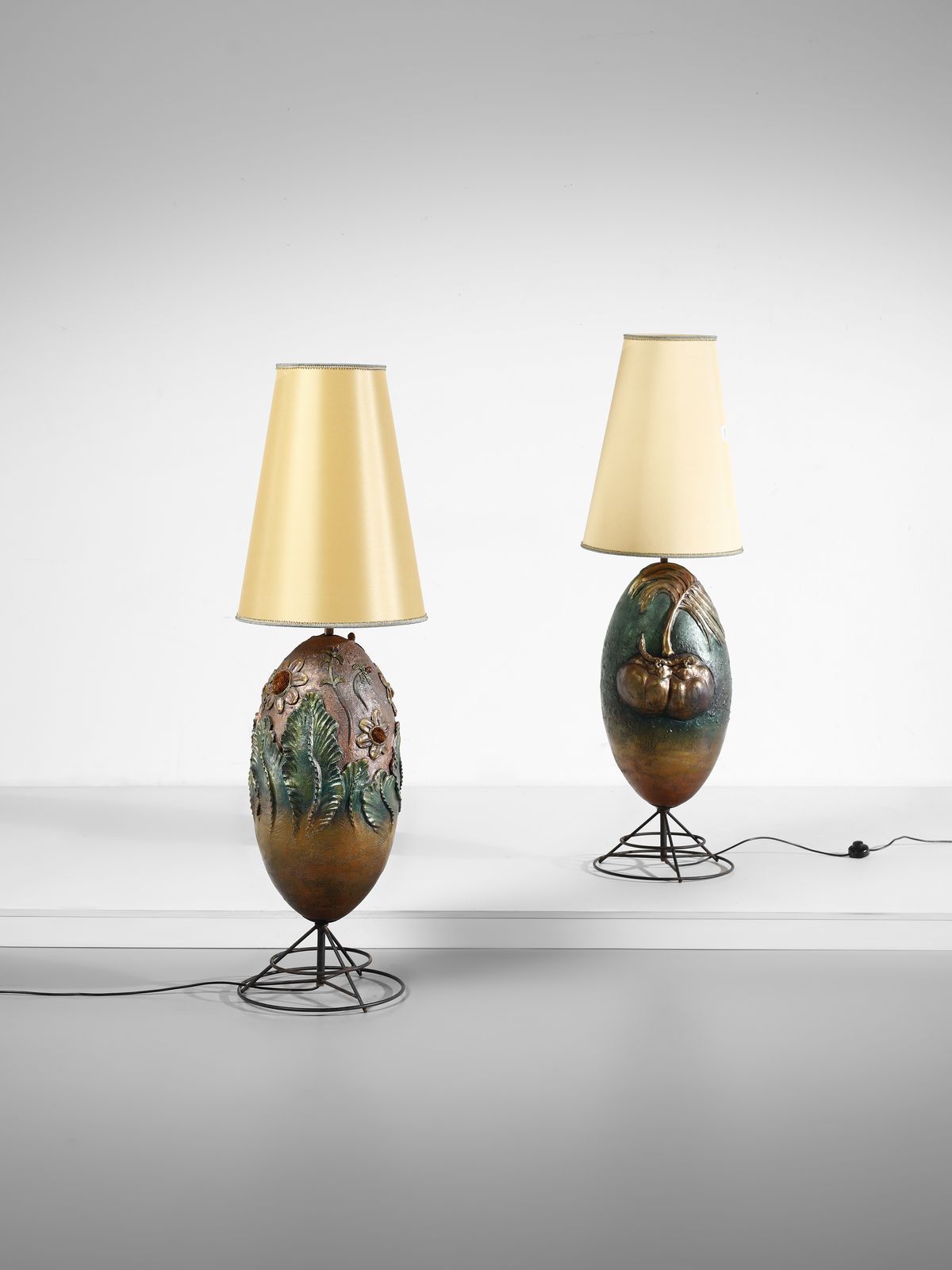 Coppia di grandi lampade da terra decorate con fiori, frutti e foglie