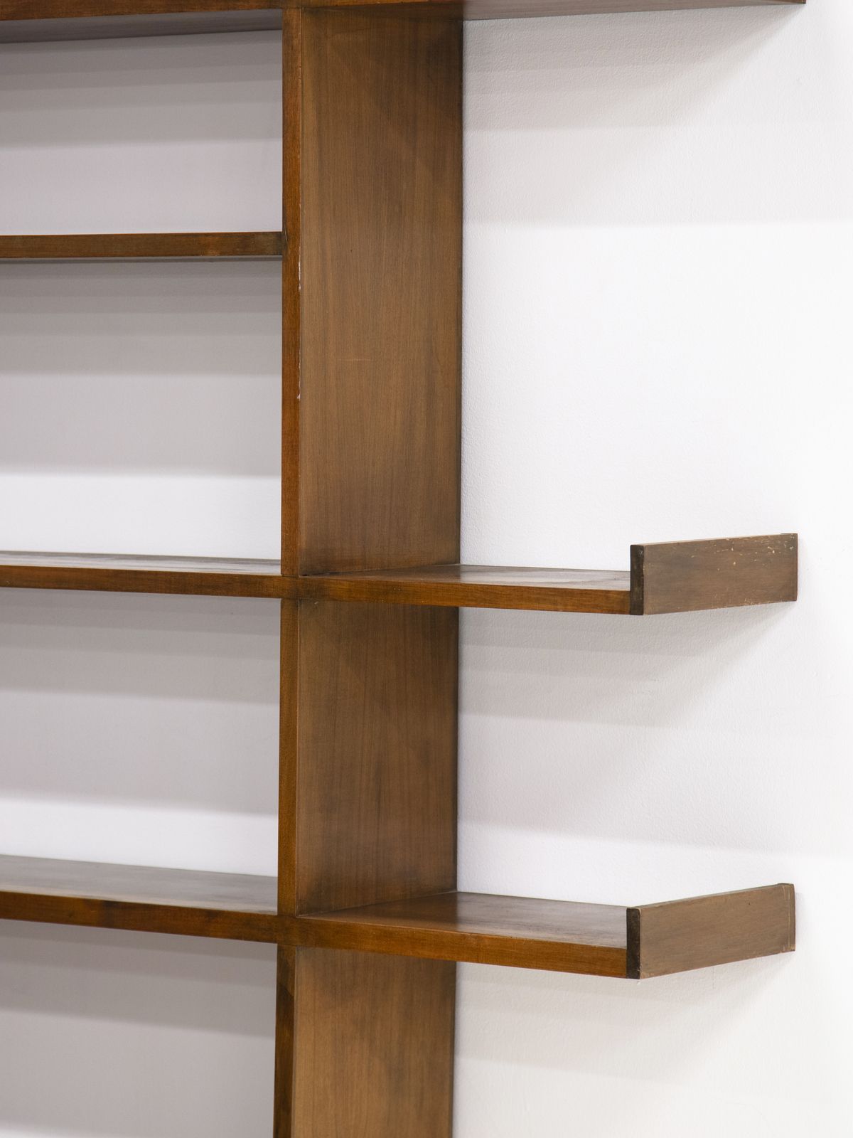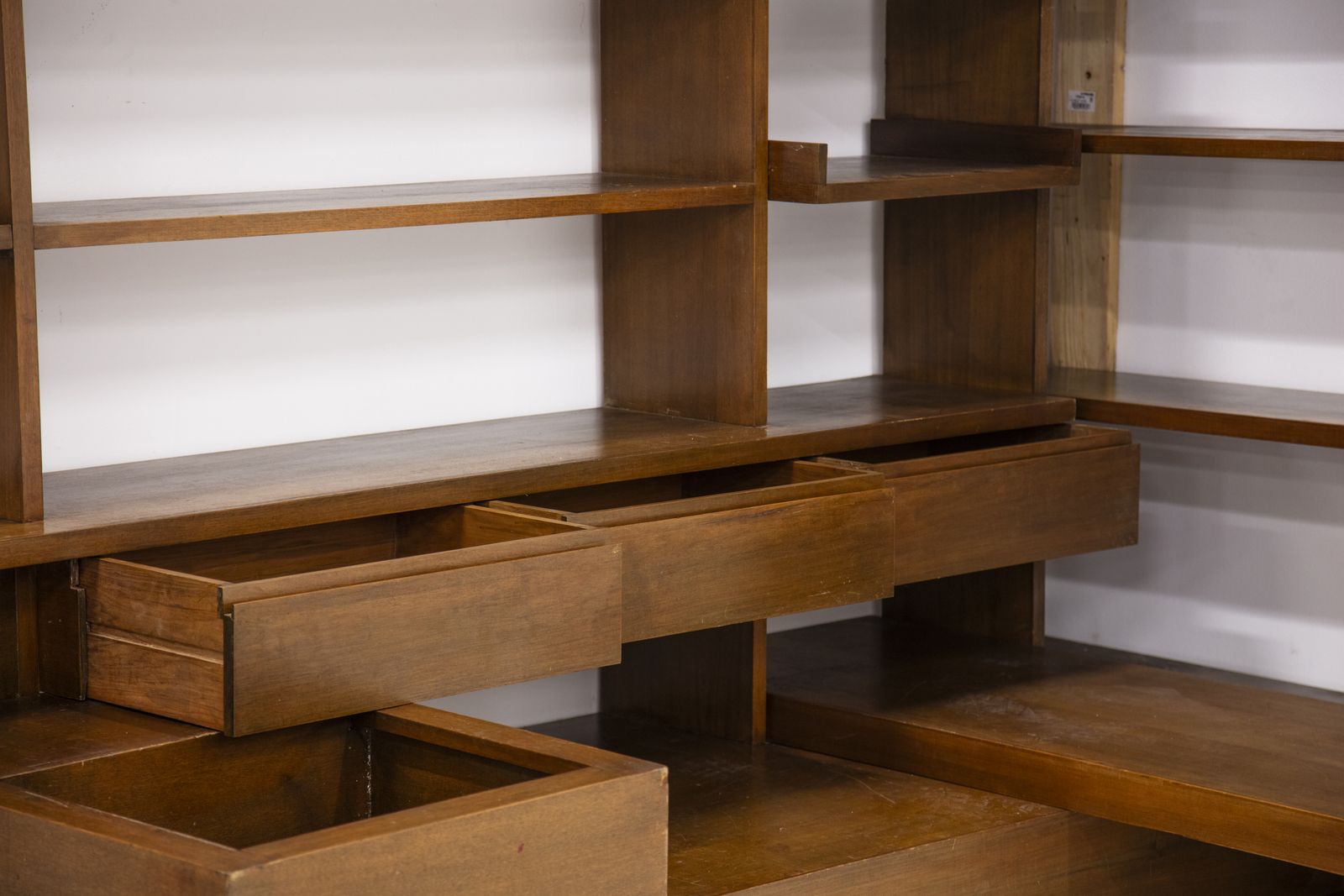 Grande libreria angolare con ripiani, stipi e cassetti