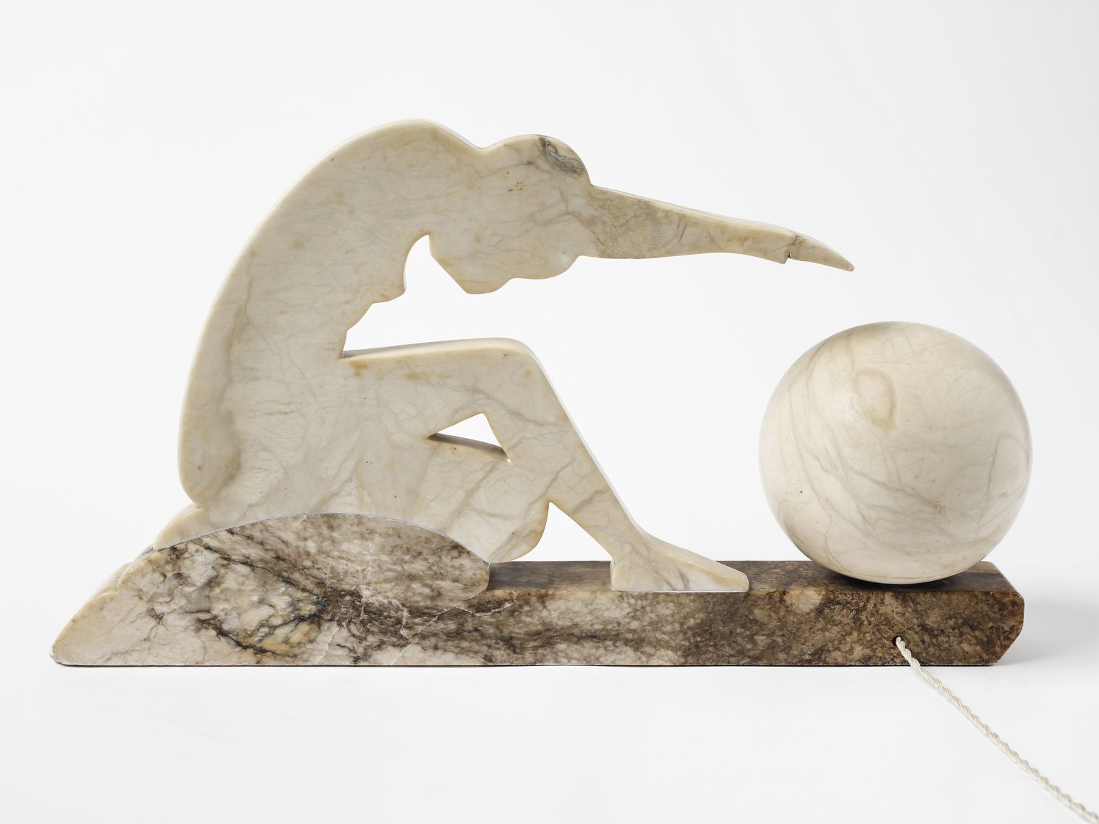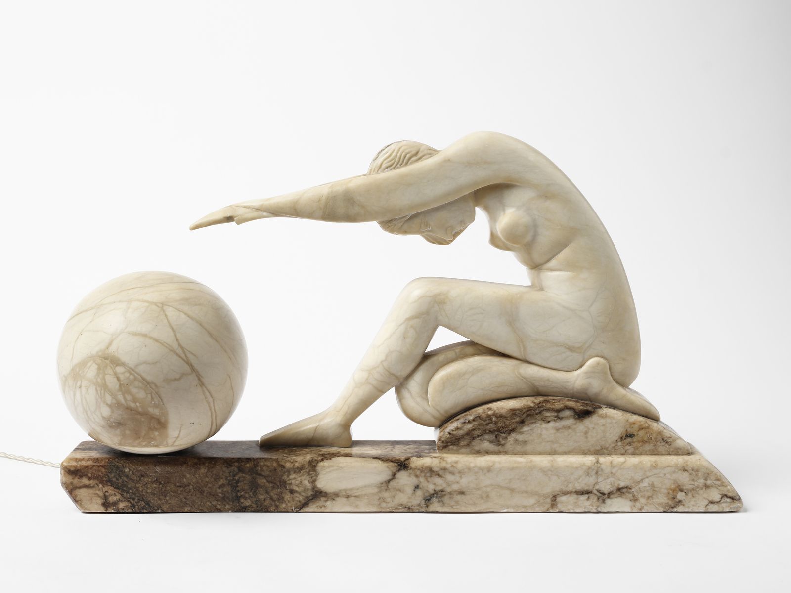Lampada scultura raffigurante nudo femminile proteso verso un globo