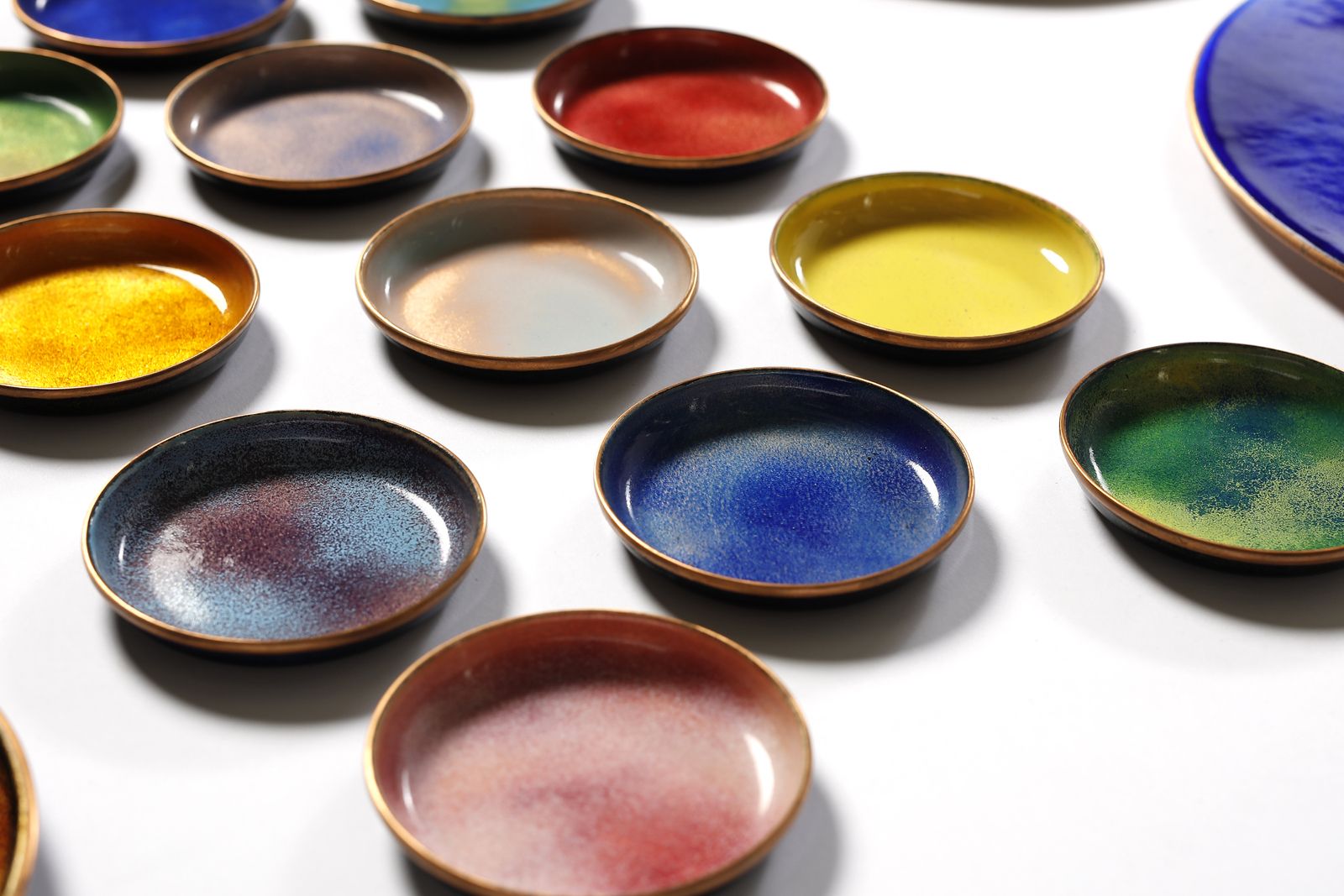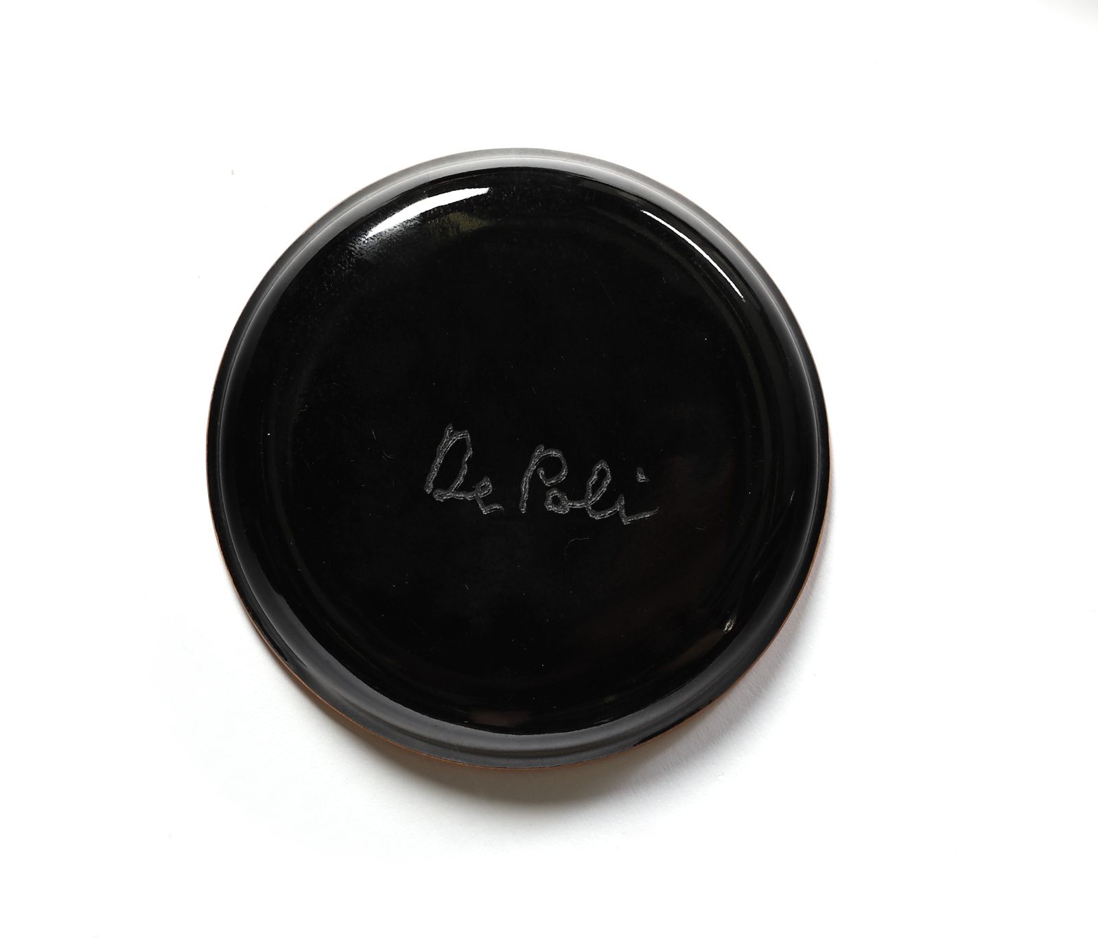 Seconda metà del XX secolo.Firmati.Dimensioni: sottopiatto 2 x 31, 5 cm. portapane 14,5 cm. sottobicchiere 9 cm. portaburro 3 x 6 cm. sottobottiglia 17,5 cm