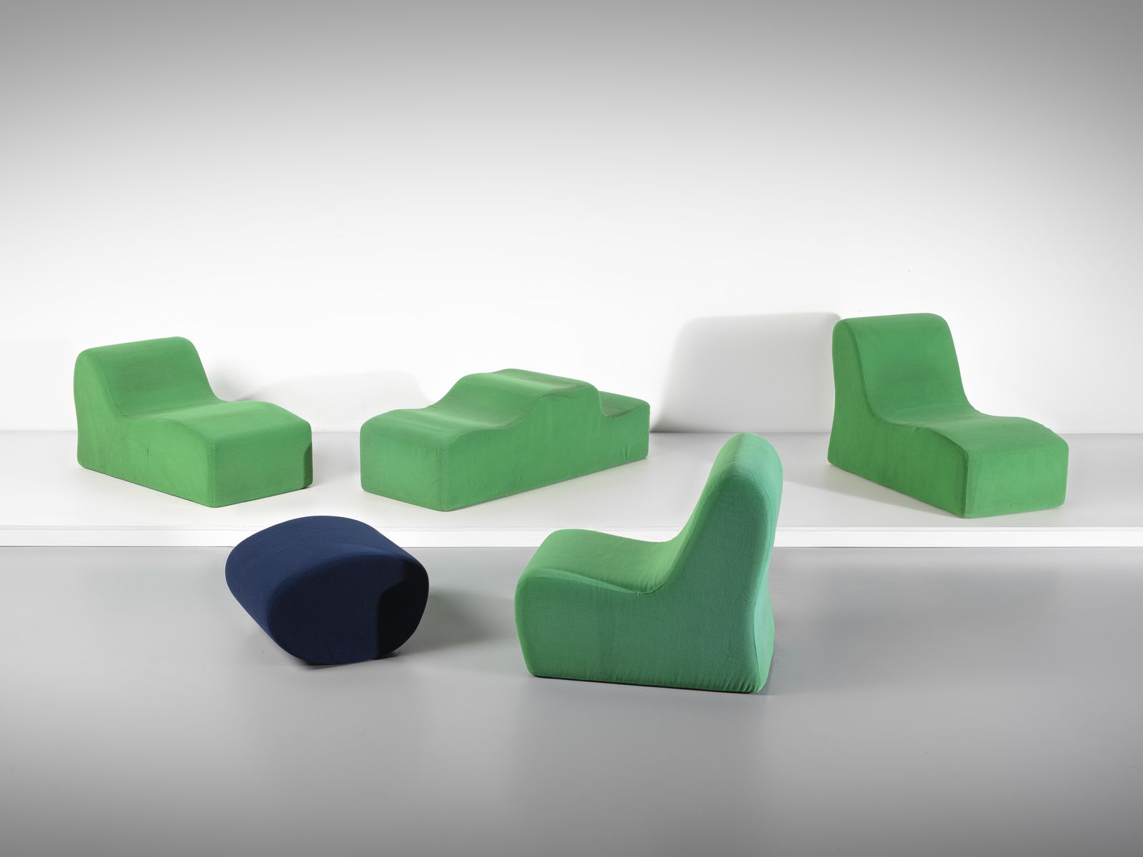 Anni Sessanta.Dimensioni: 46 x 68 x 65 cm (pouf). 49 x 159 x 65 cm (tavolino). 90,5 x 96 x 65 cm (poltrona). 87,5 x 127 x 65 cm (poltrona). 66 x 121,5 x 65 cm (poltrona)Bibliografia: Domus n. 463, giugno 1968, pp. 92/93. C. Fiell & P. Fiell, 1000 chairs, Taschen, 2021, p. 398