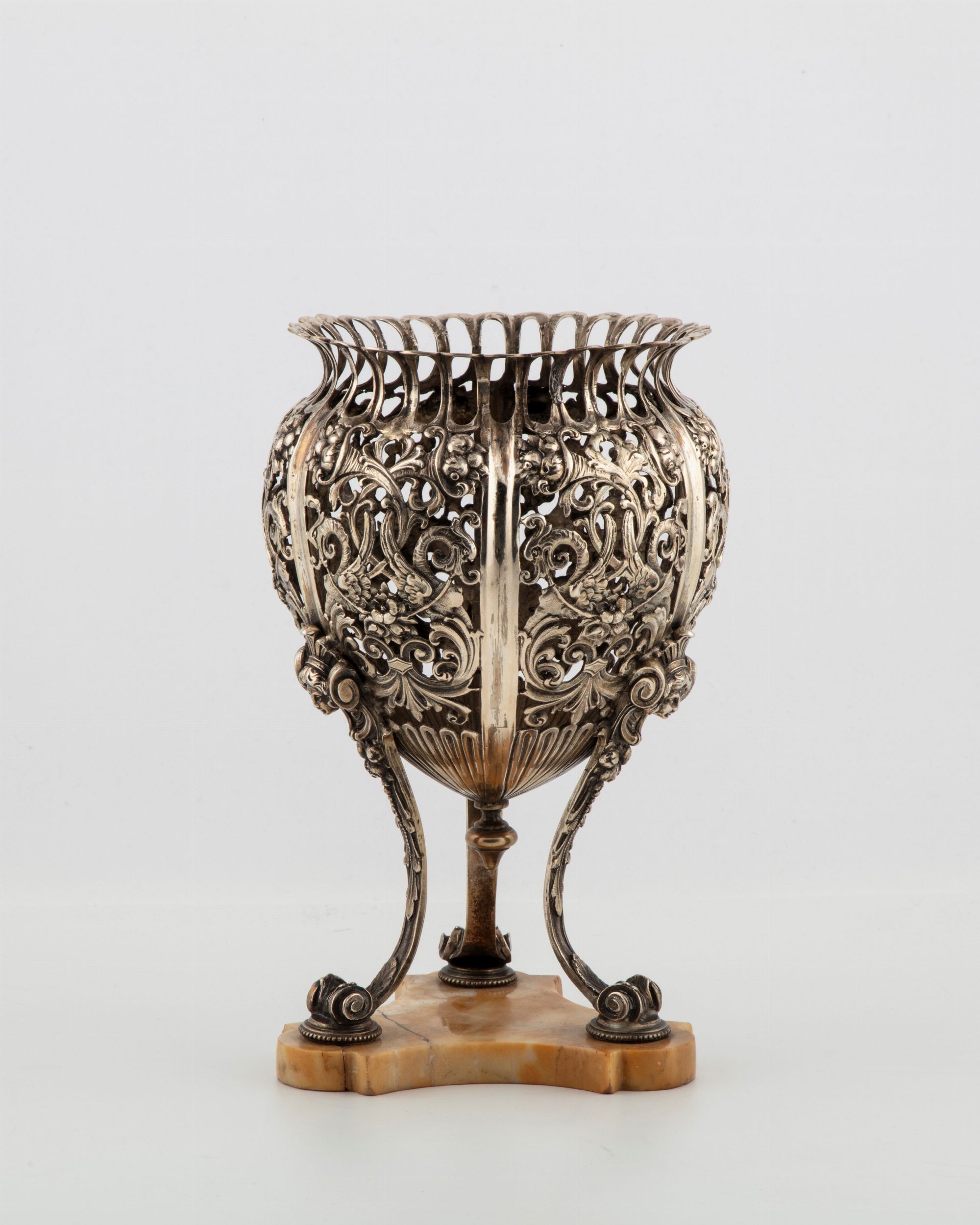 in argento, Peso lordo kg 1,092 h cm 24,2 apparentemente privo di punzonatura poggiante su tre piedini a volute terminanti in eleganti mascheroni con festoni, il corpo è finemente sbalzato e traforato con motivi floreali intrecciati e cornucopie, su base in marmo, difetti.