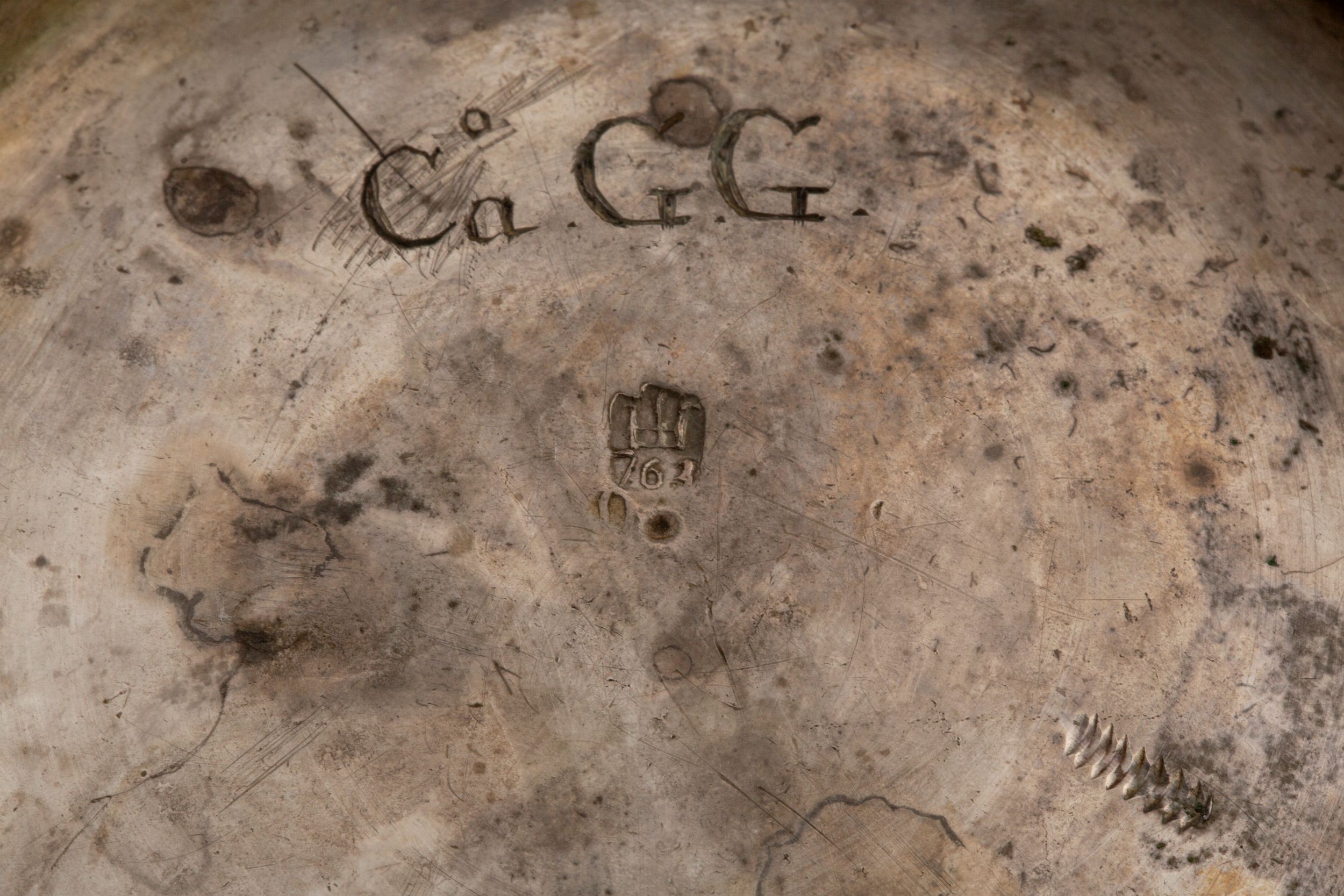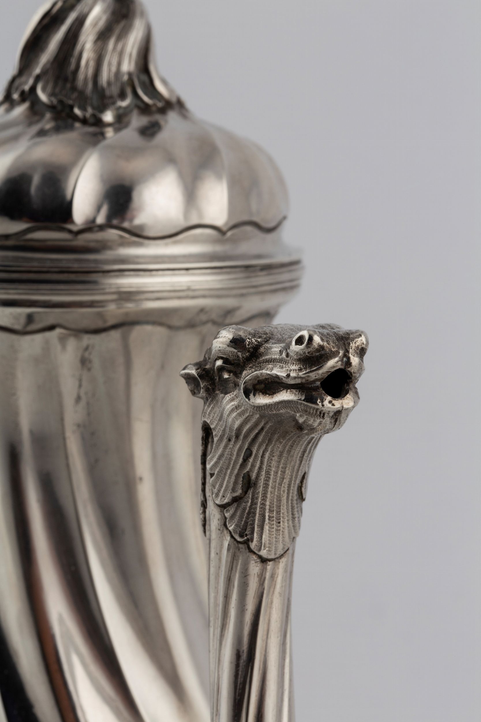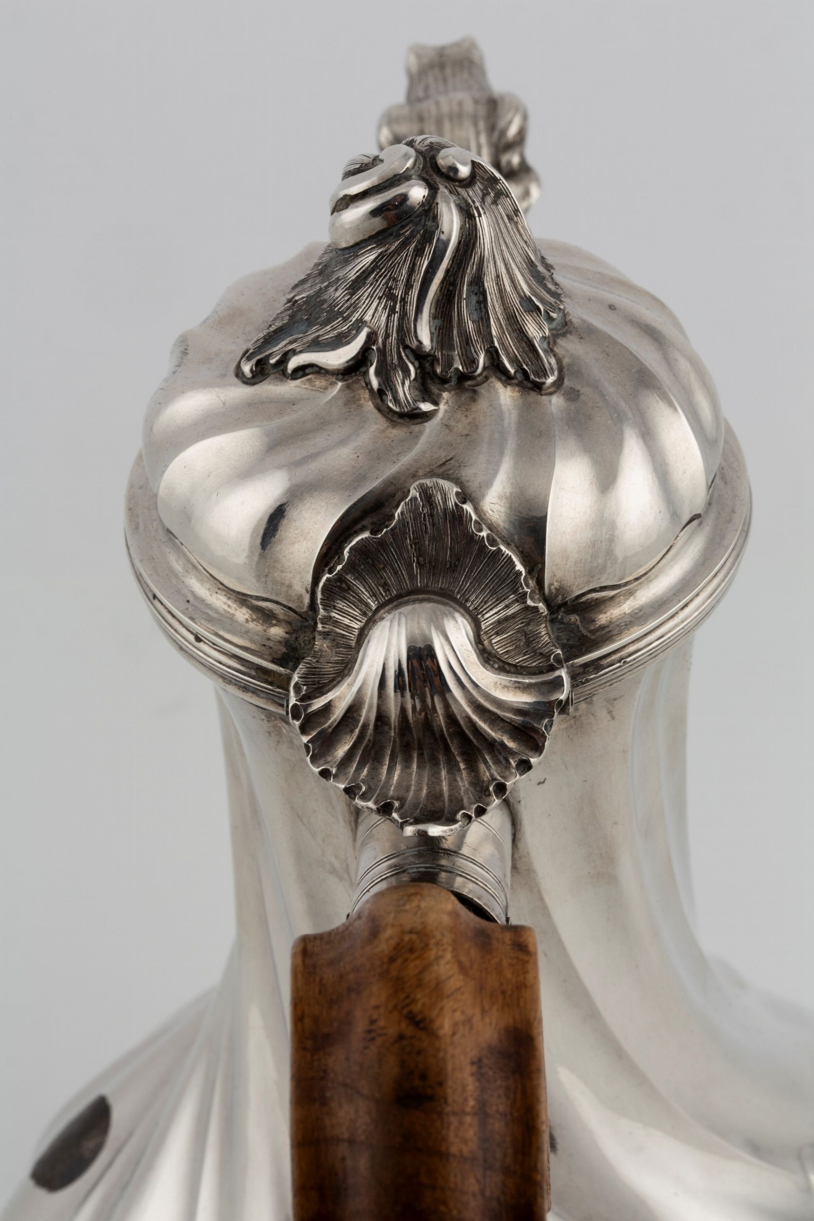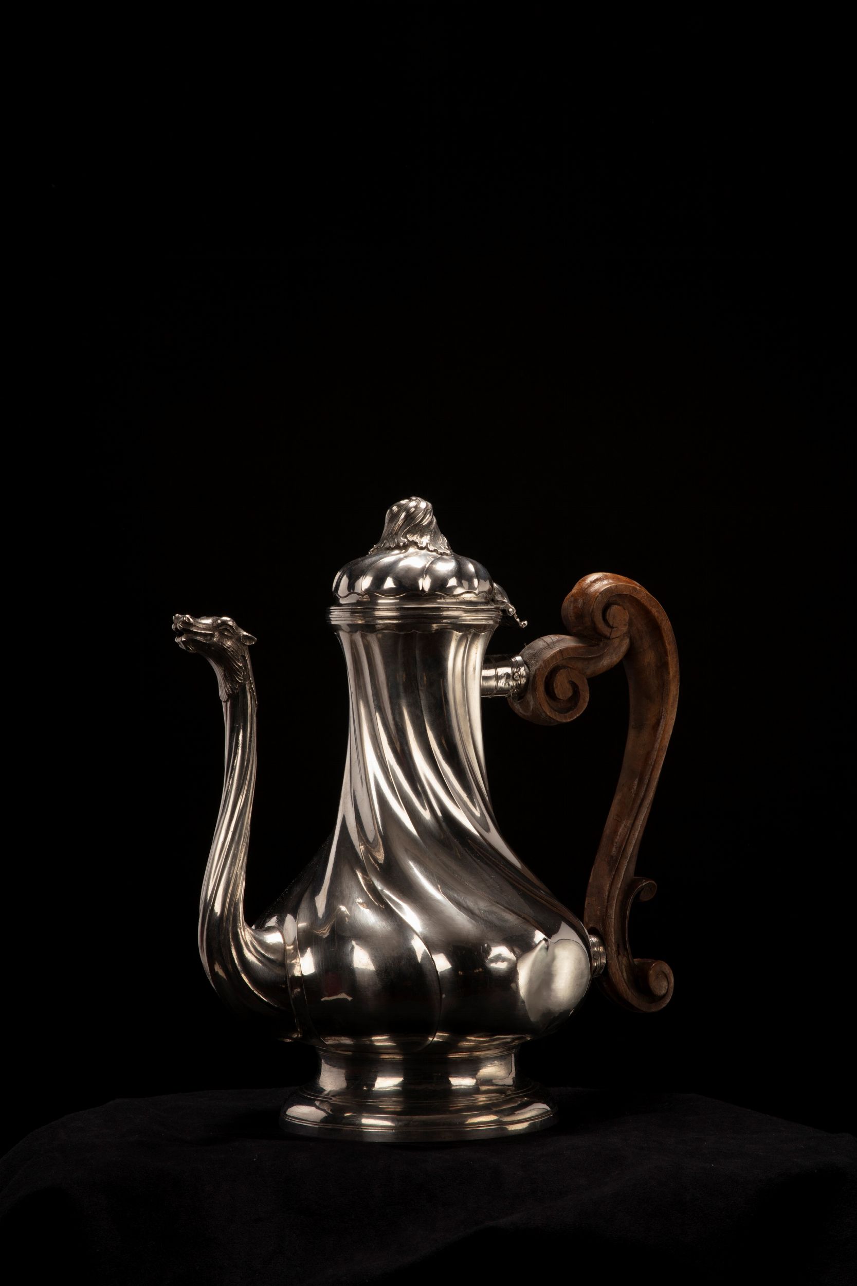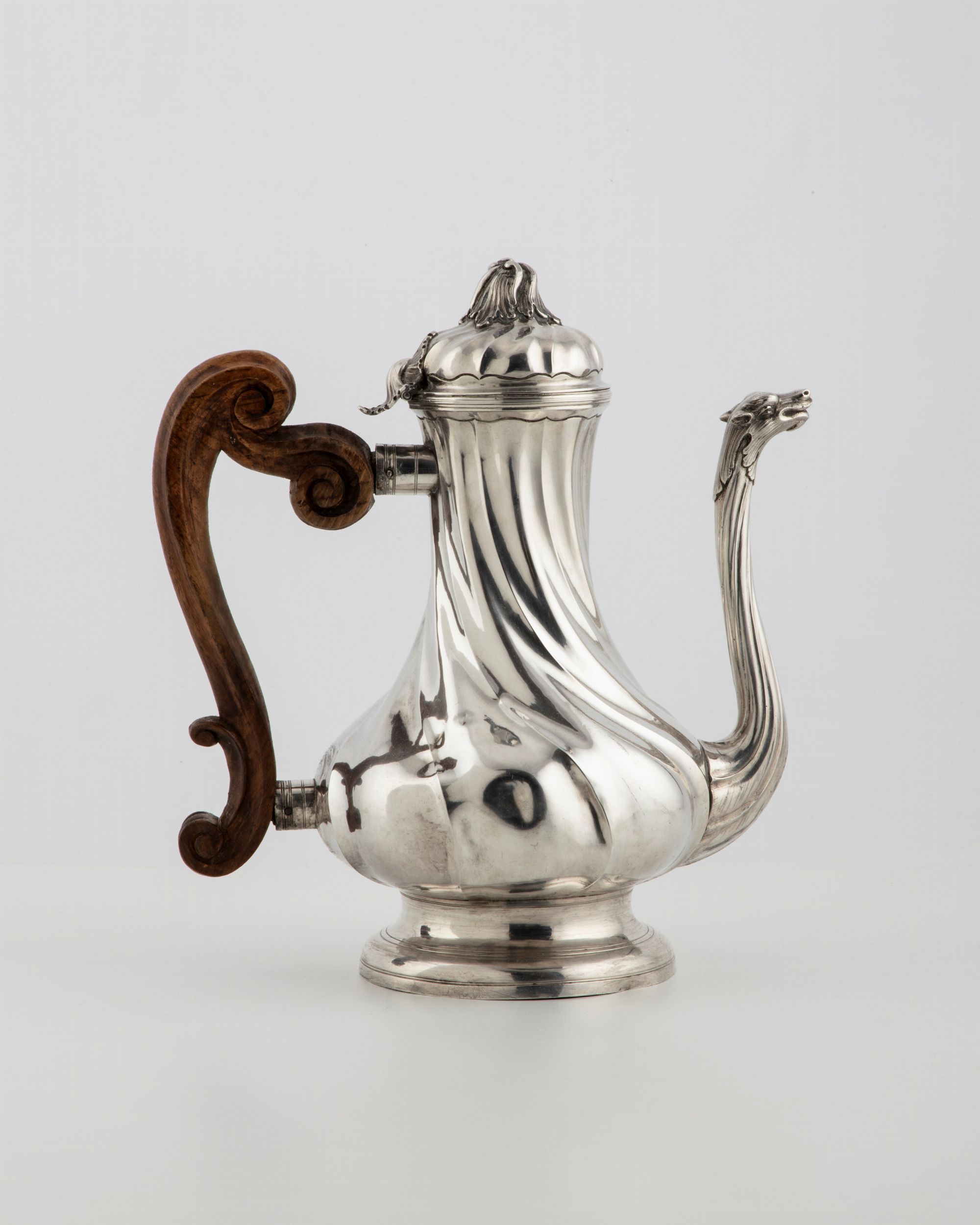 Genova, secolo XVIII punzoni della Torretta per l'anno 1761, corpo piriforme con andamento tortile, base piatta tornita, beccuccio tortile terminante con testa zoomorfa, coperchio con fiori e foglie, manico in legno a volute, difetti.