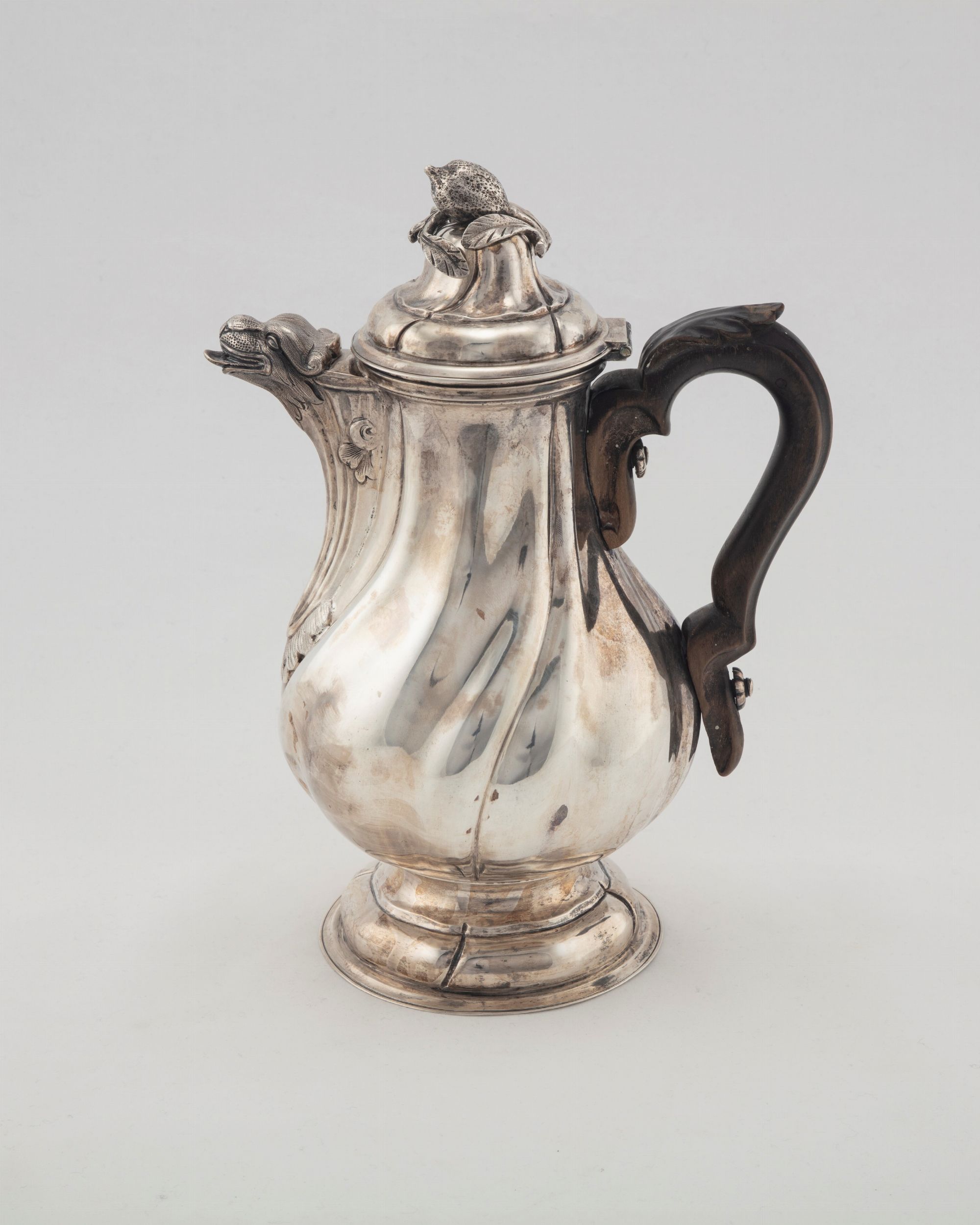 Milano, secolo XVIII/XIX Reca punzone dell'Argentiere AP con San Michele (Pessina Angelo Maria, Milano 1820-1825?), punzone dell'assaggiatore GC (Comprayre Gaetano, Zecca di Sardegna 1775...?), fusa, sbalzata e cesellata, a corpo piriforme costolato su piede circolare bombato, beccuccio zoomorfo, presa del coperchio a frutto di caffè con foglie a tutto tondo, ansa a voluta fogliata a legno ebanizzato.