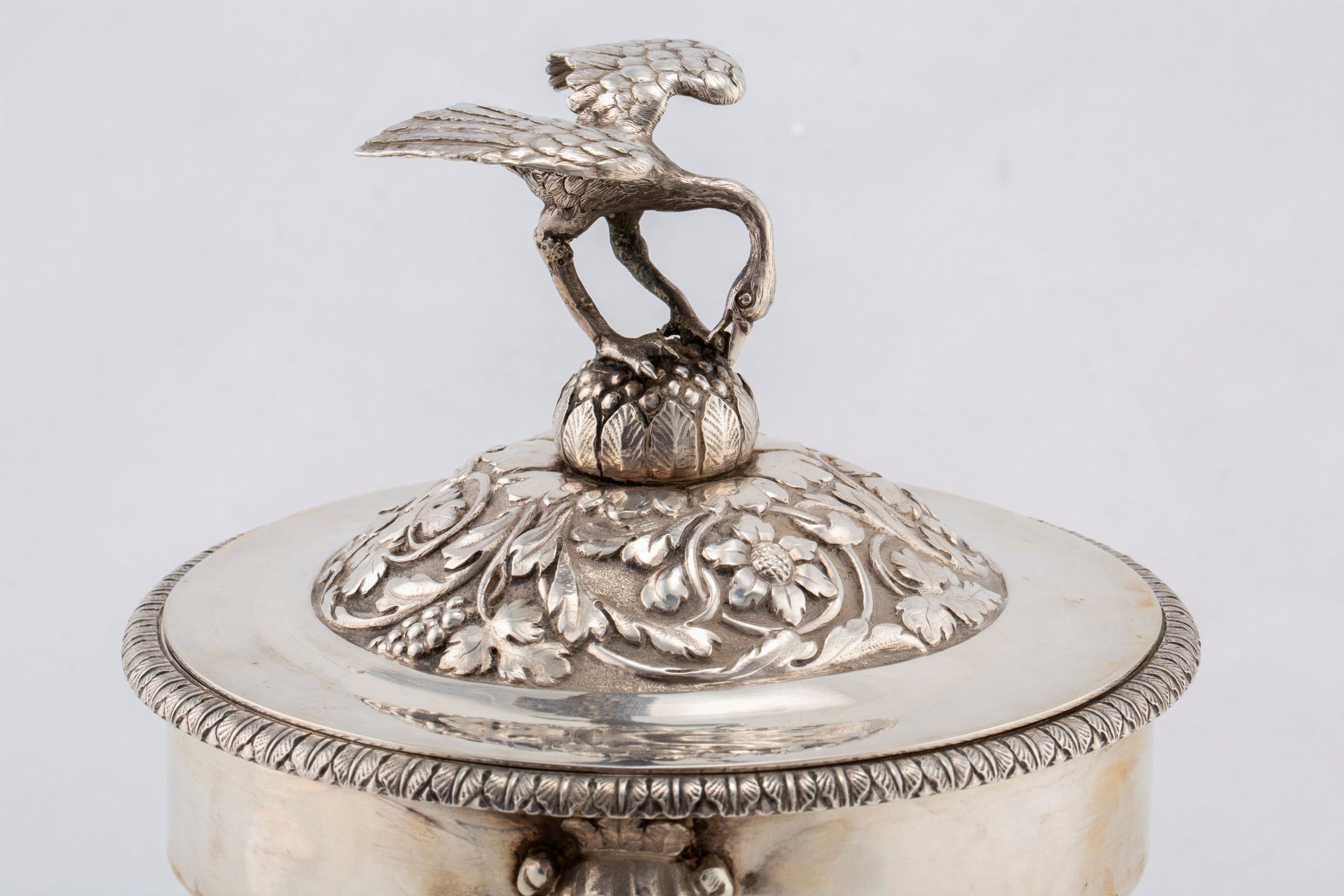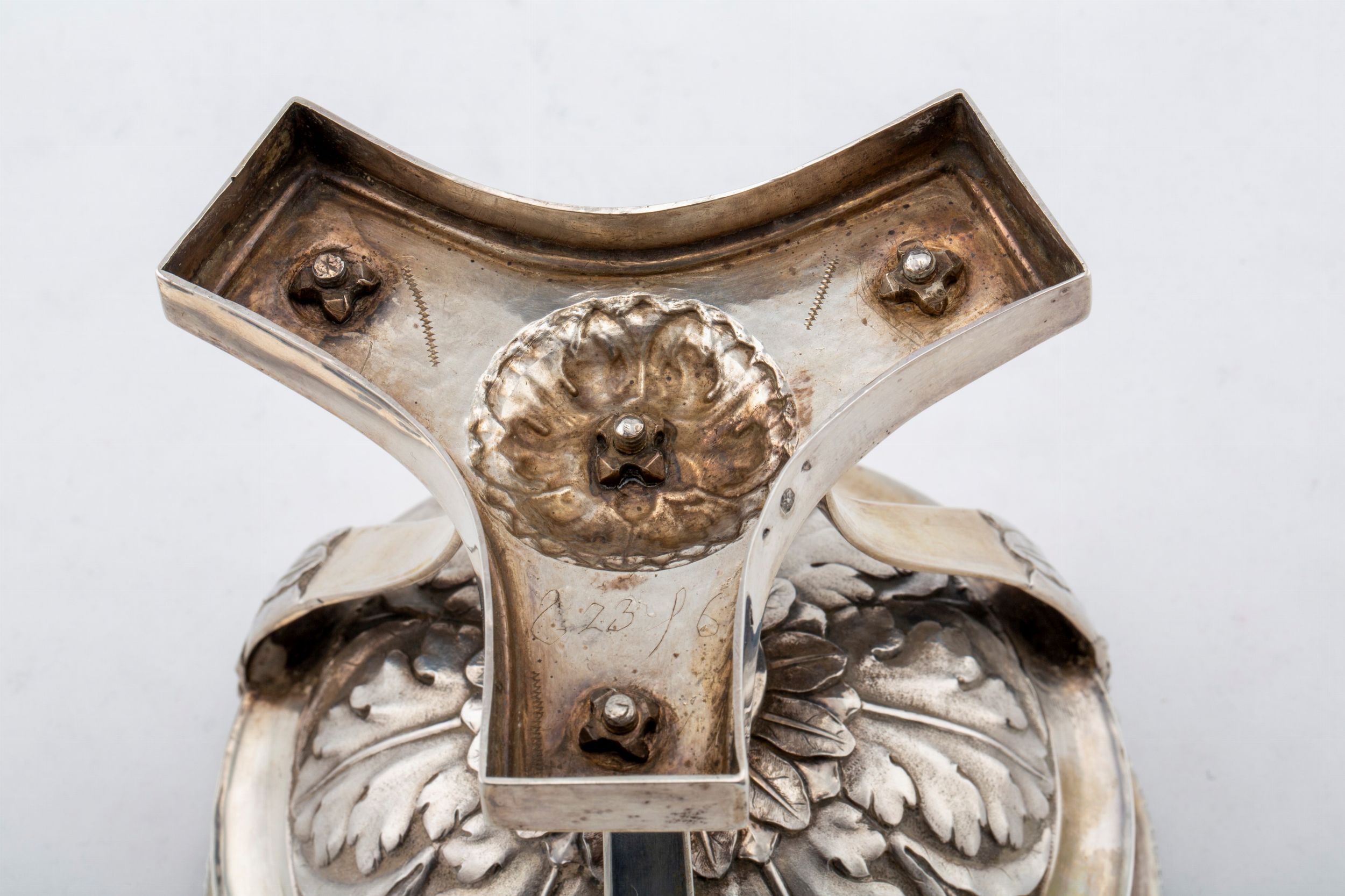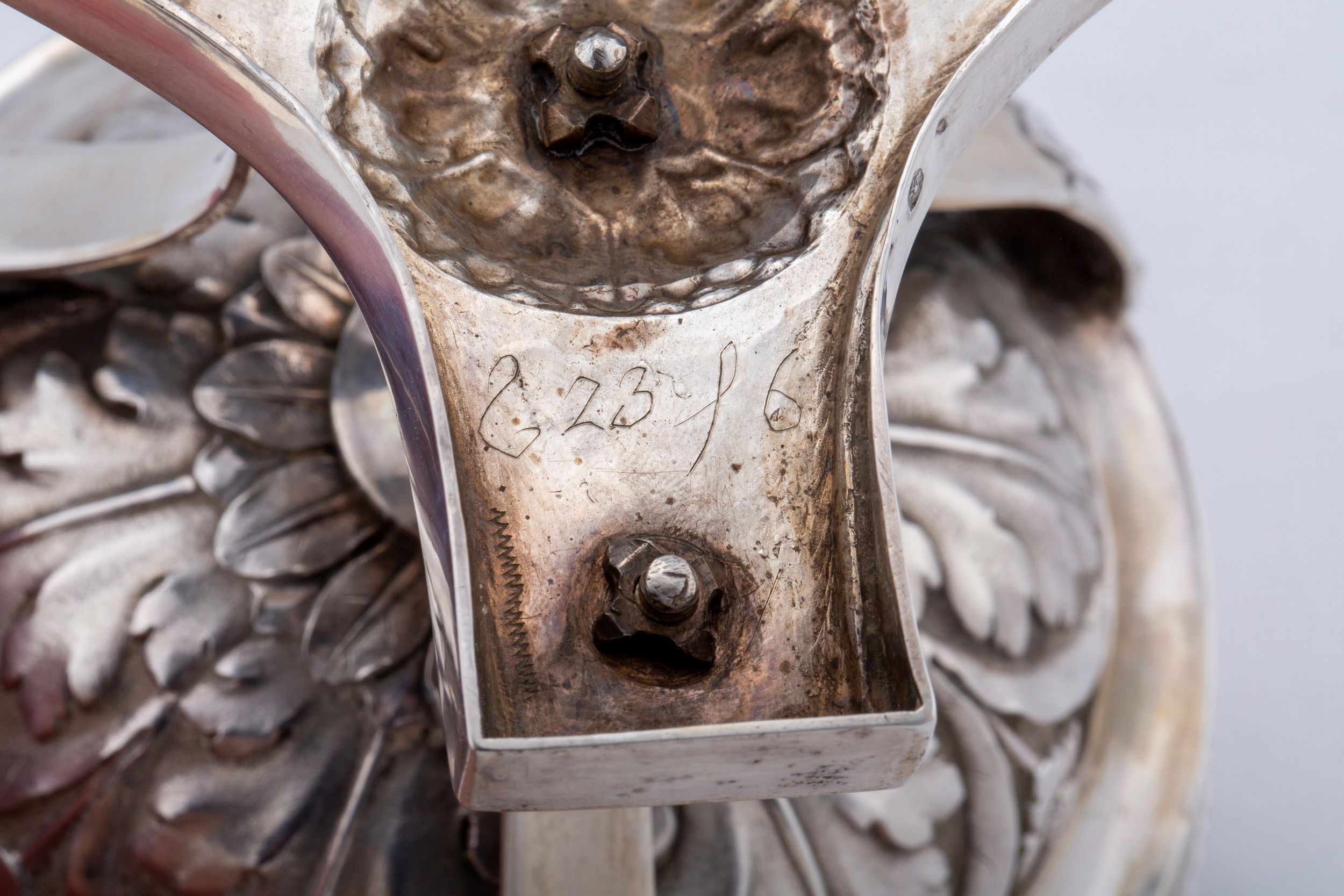 Parma e Italia, secolo XIX/XX la zuccheriera argentiere GS (non identificato) Parma 1821-1872, con base tripode, piedini ferini terminanti in mascheroni, il corpo cesellato e sbalzato con decori floreali, il bordo inciso con foglie, il coperchio sbalzato con motivi fogliacei e presa del coperchio con fenicottero (h cm 22,50); la caffettiera di epoca posteriore decorata in maniera simile (h cm 31,00).