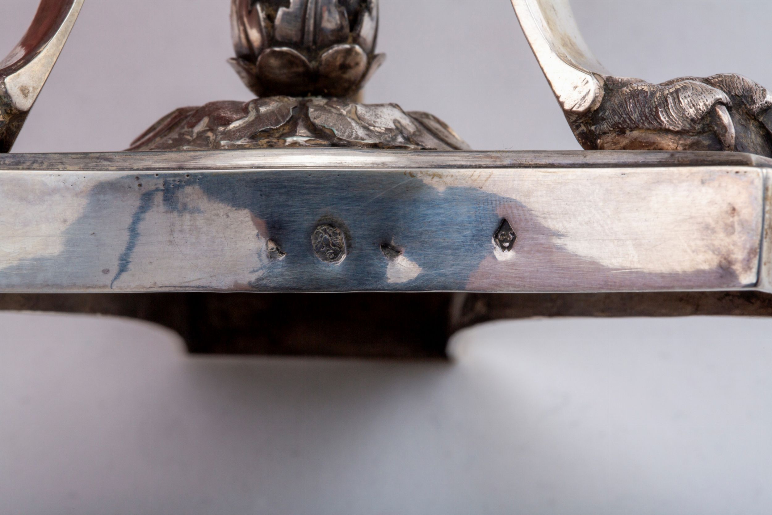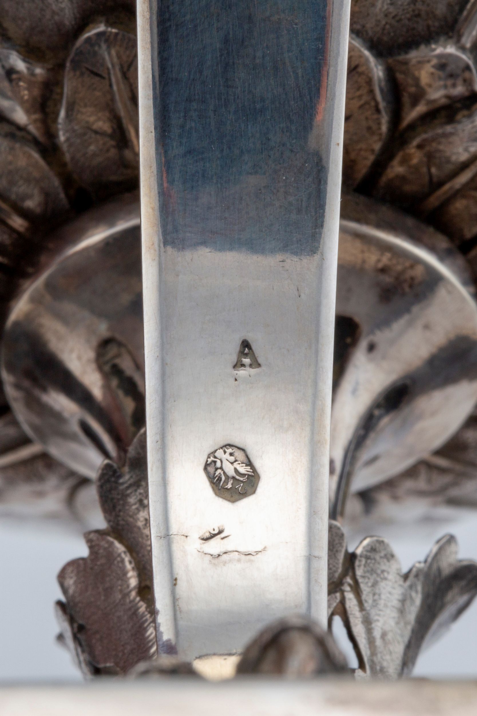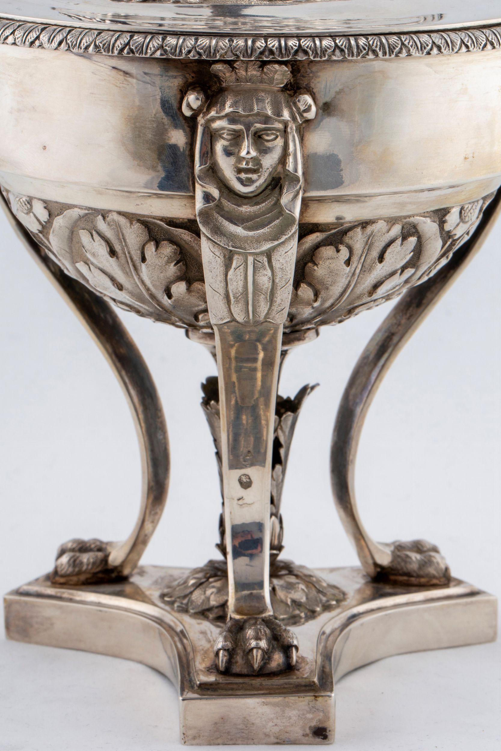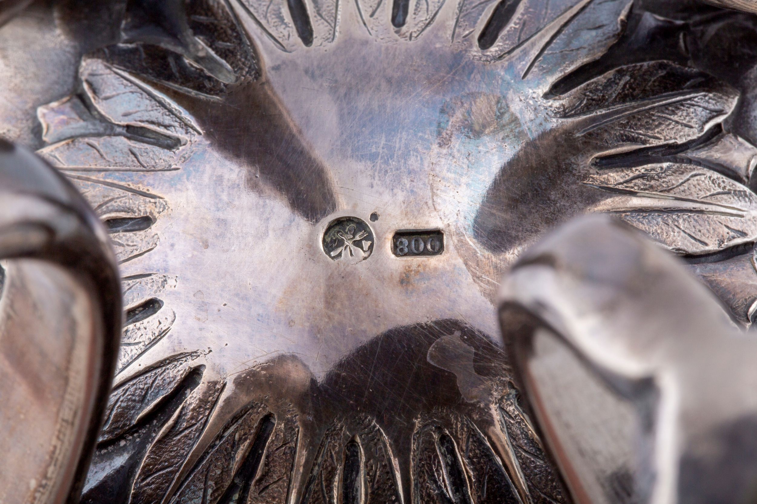 Parma e Italia, secolo XIX/XX la zuccheriera argentiere GS (non identificato) Parma 1821-1872, con base tripode, piedini ferini terminanti in mascheroni, il corpo cesellato e sbalzato con decori floreali, il bordo inciso con foglie, il coperchio sbalzato con motivi fogliacei e presa del coperchio con fenicottero (h cm 22,50); la caffettiera di epoca posteriore decorata in maniera simile (h cm 31,00).