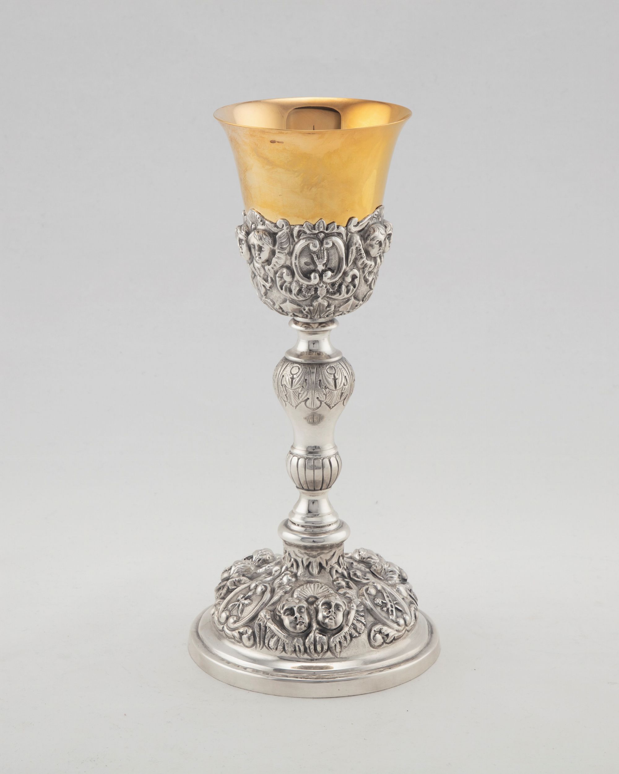 Italia, secolo XX la base del fusto e il corpo del calice finemente cesellati e sbalzati con figure di putti, stemmi e ghirlande, la coppa in vermeil.