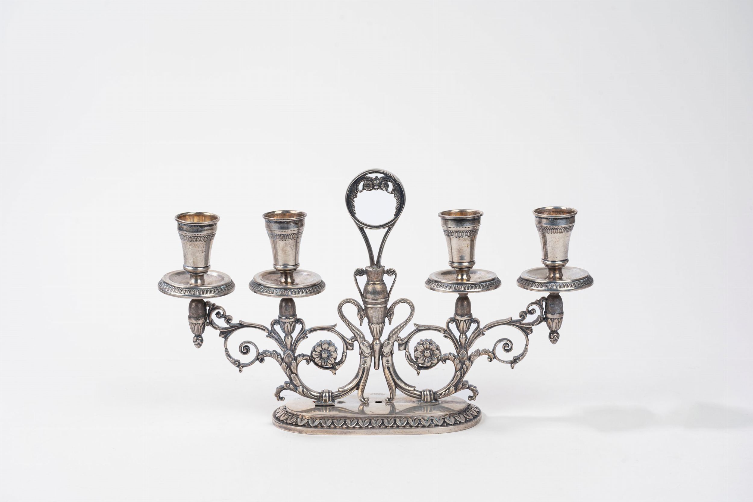 Italia, secolo XX a quattro fiamme, base ovale, corpo decorato con motivili floreali, bracci a volute, centrato da vaso sorretto da cigni, le quattro bobeches con bordo a palmette, rivenditore M. Scortecci Roma.