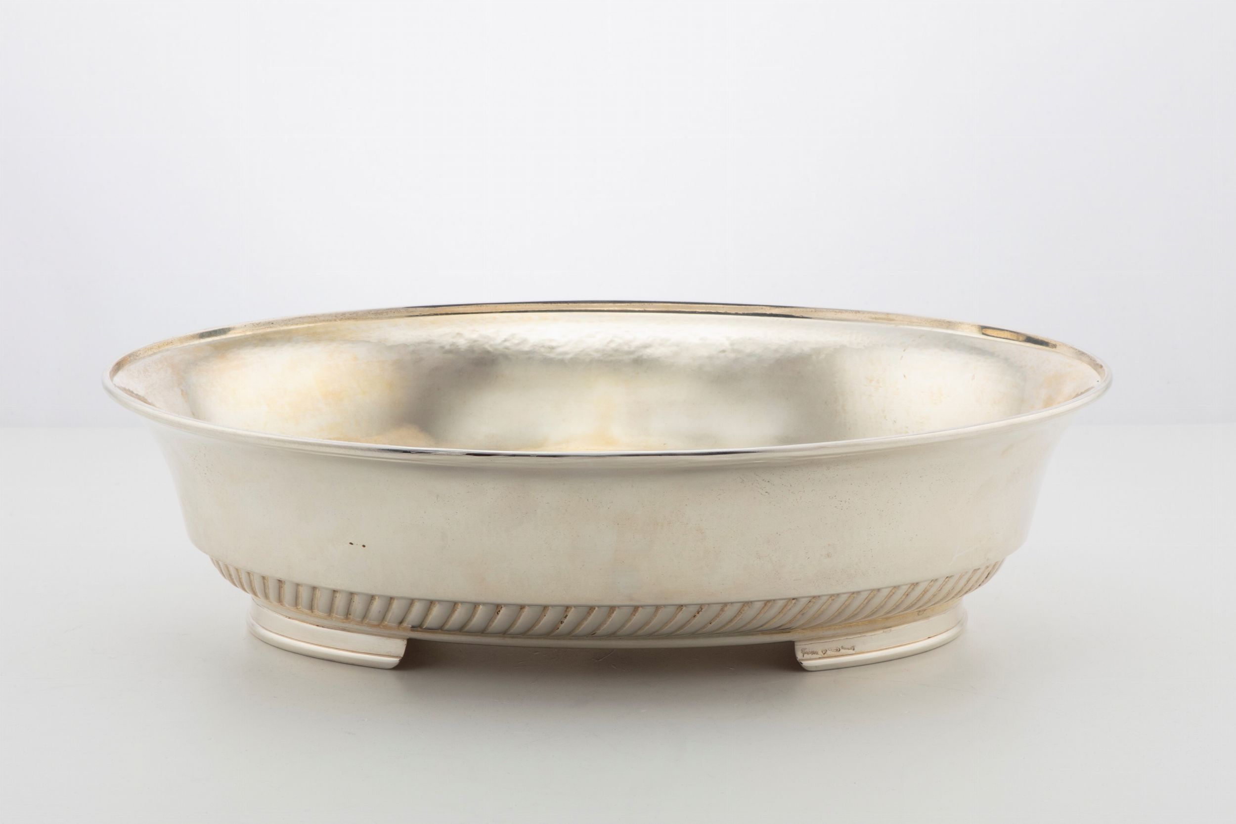 Italia, secolo XX corpo liscio, decoro sbalzato, poggiante su quattro piedini sagomati.