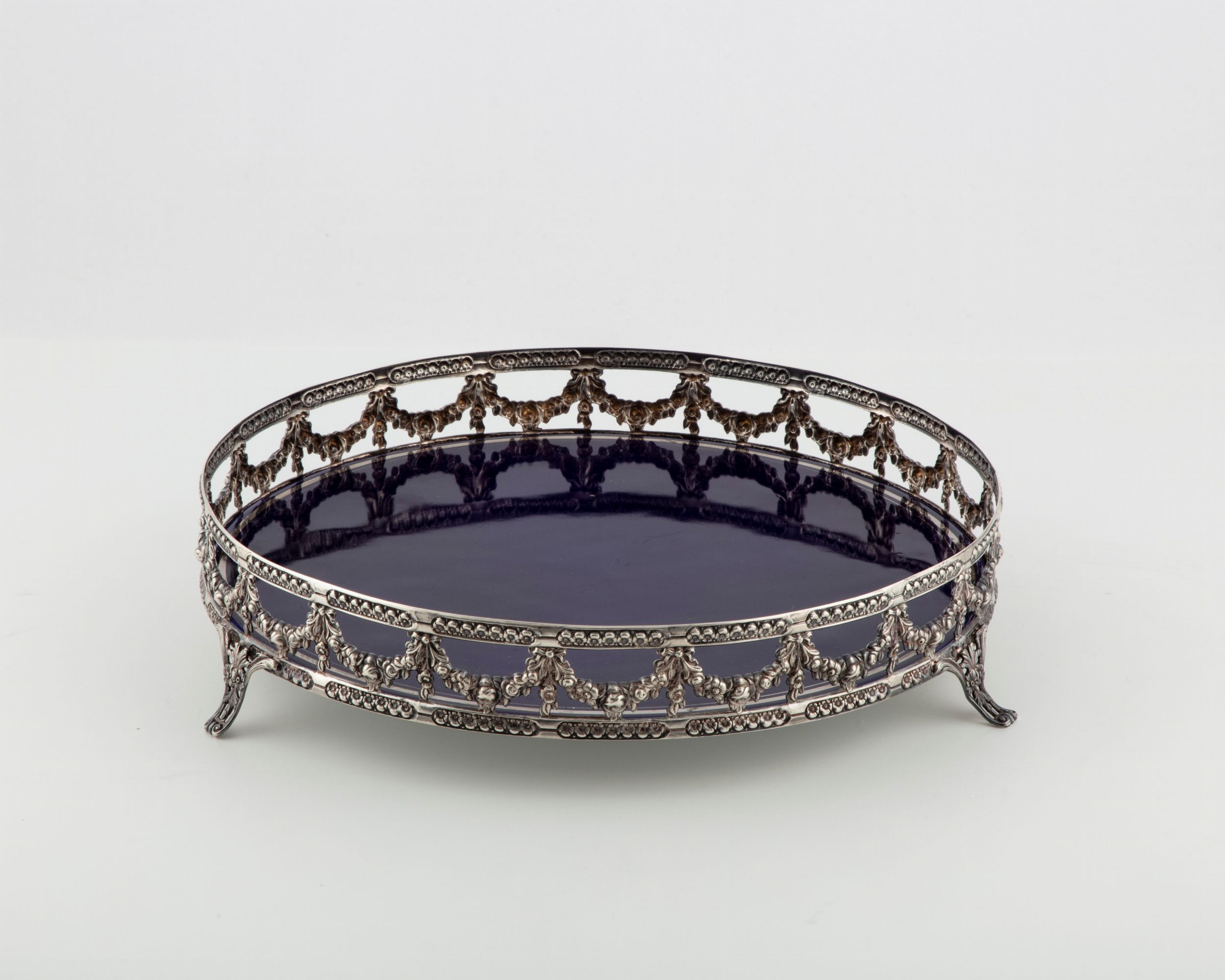 Portogallo, secolo XX sbalzato con festoni e motivi floreali, su tre piedini ferini con fiori, (all'interno piatto in porcellana blu).