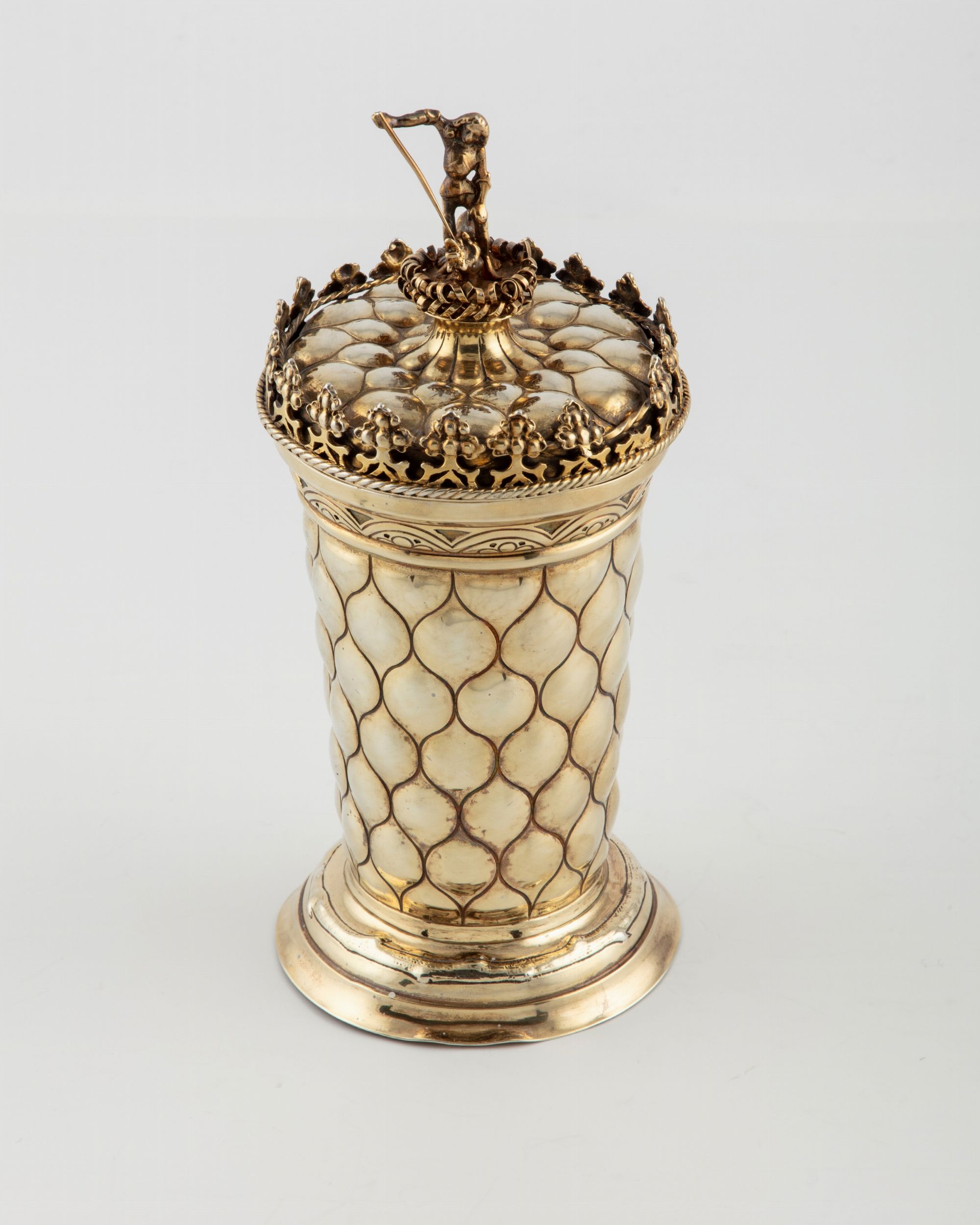 Hanau, seconda metà del secolo XIX Argentiere BM (Berthold Muller?), punzoni di esportazione per Chester 1899, in stile neogotico, riproduce un antico modello cinquecentesco tedesco, il corpo e il coperchio sono decorati con petali a rilievo, la presa del coperchio con san Giorgio che infilza il drago a tutto tondo.