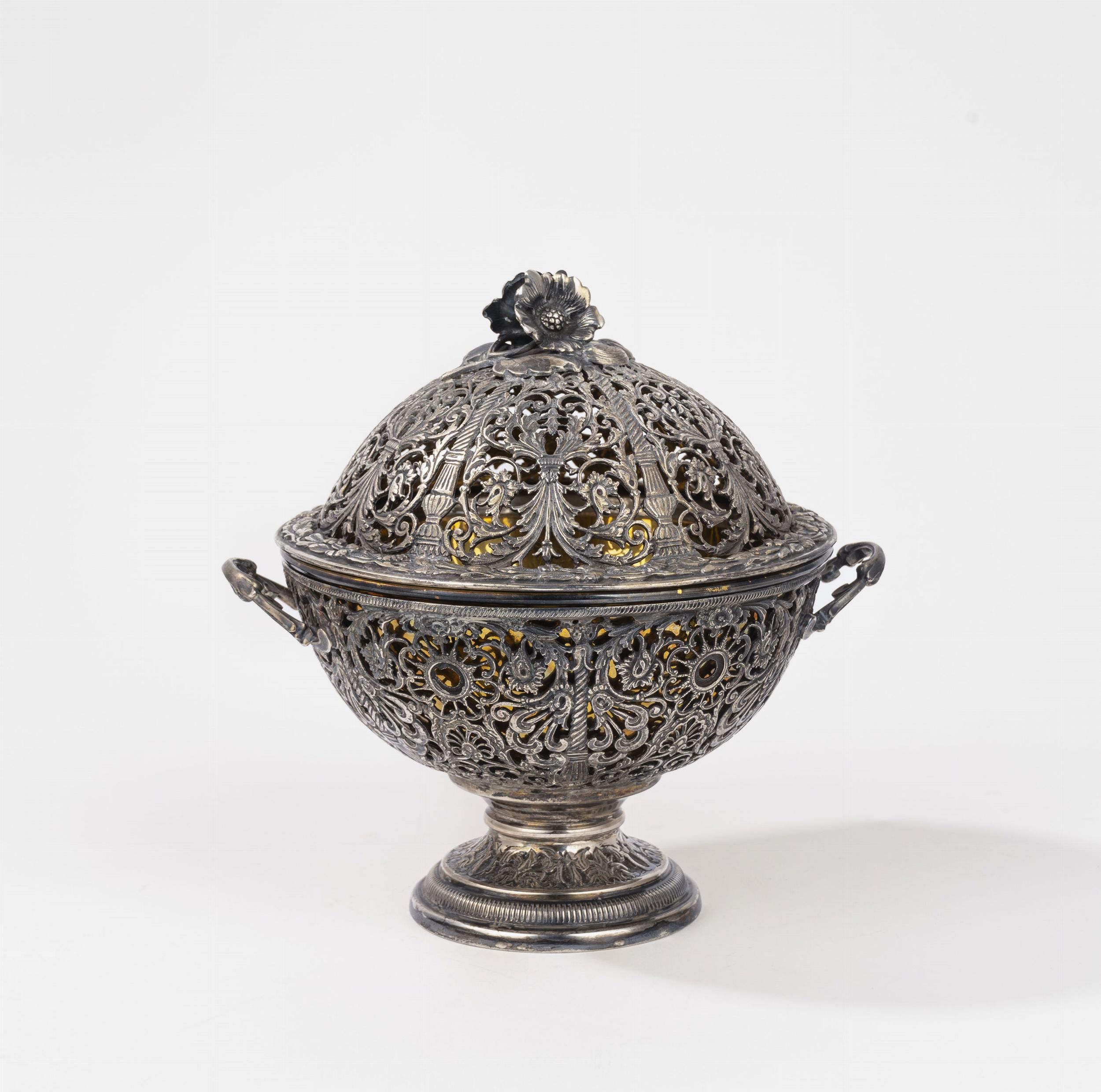 Italia, secolo XX corpo a due sezioni finemente traforate a motivi floreali e architettonici, biansato, con presa del coperchio a fiore, coppa interna in vermeil.