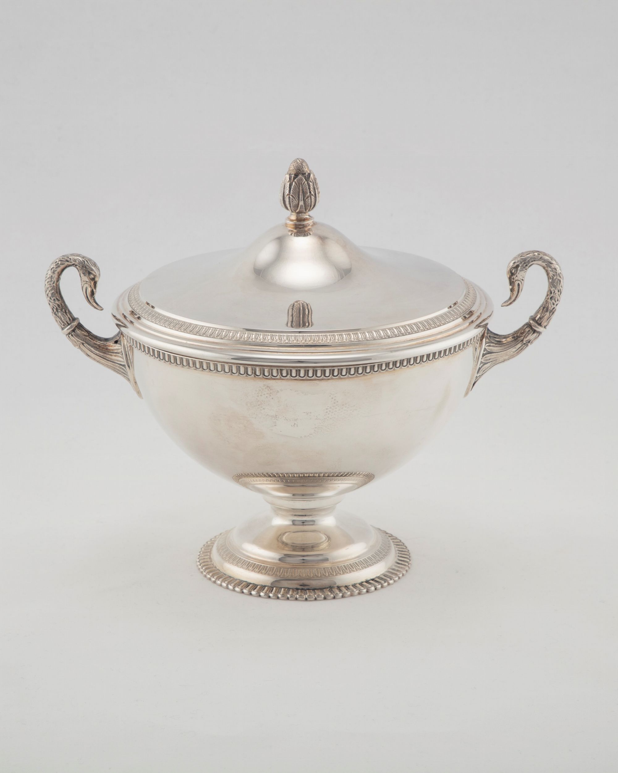 Italia, 1935/1945 reca punzoni del Fascio, biansata, base circolare con palmette, anse zoomorfe, presa del coperchio a pigna.