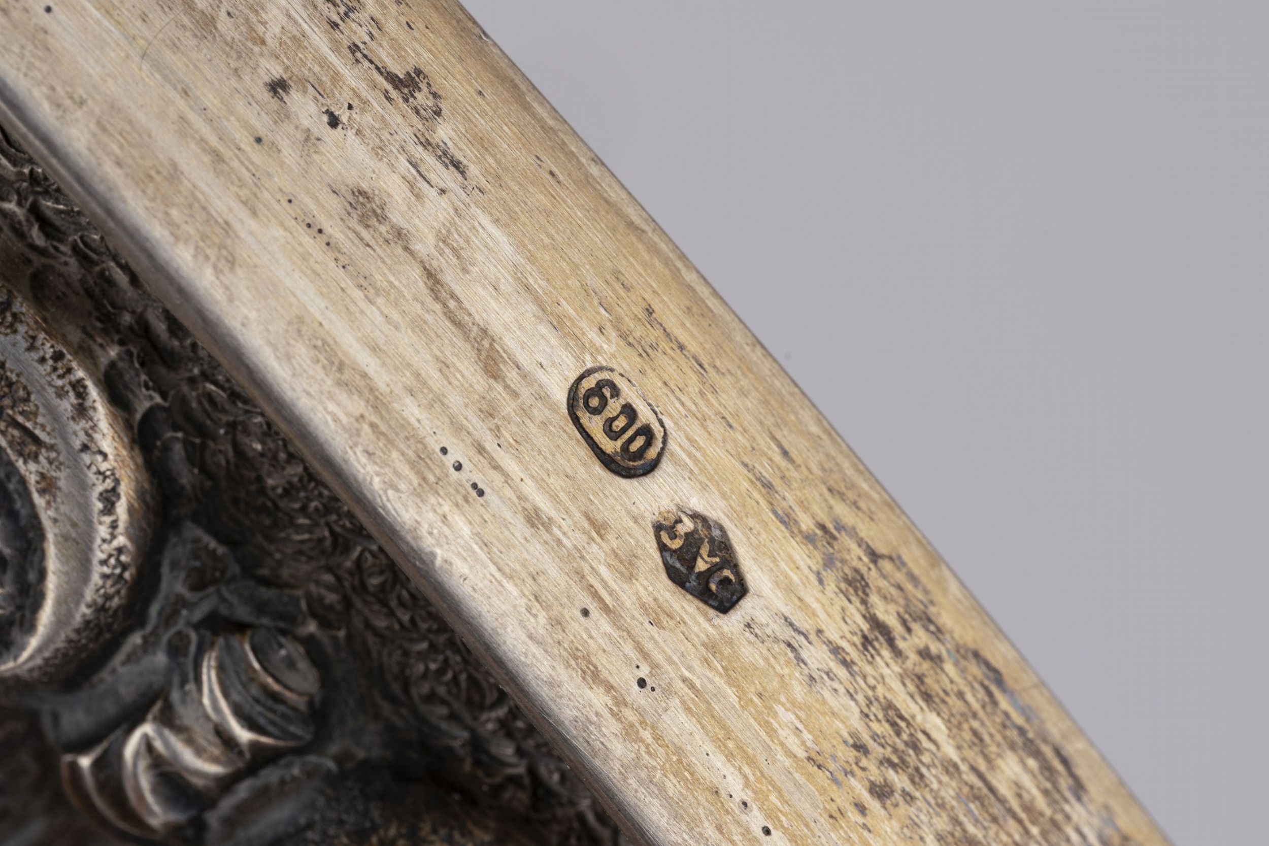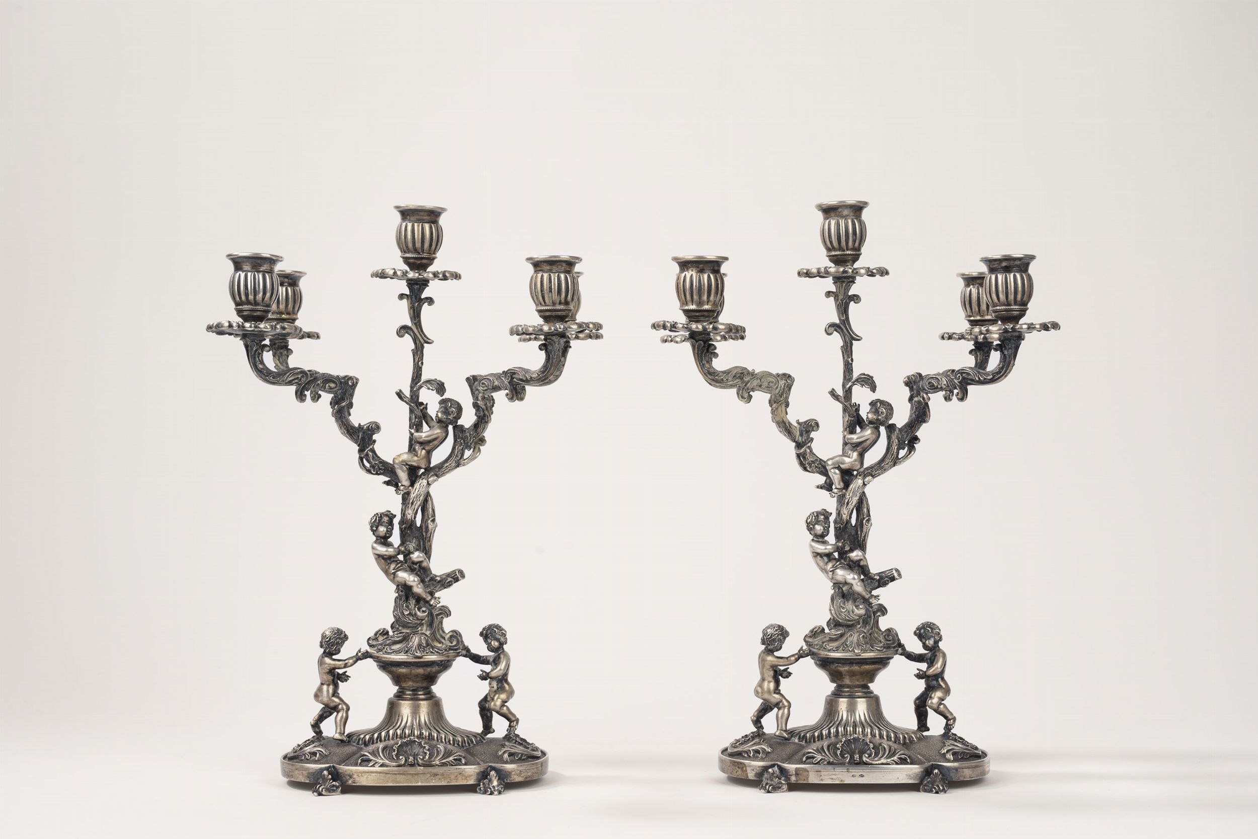 in argento, Peso lordo kg 3,758 cm 34,20 (basi appesantite) Italia, secolo XX a cinque fiamme, base polilobata sorretta da quattro piedini ferini, cesellata e sbalzata con valve di conchiglia, fusto riccamente inciso e sbalzato a tronco d'albero con putti festanti a tutto tondo, bobeches a bocciolo.