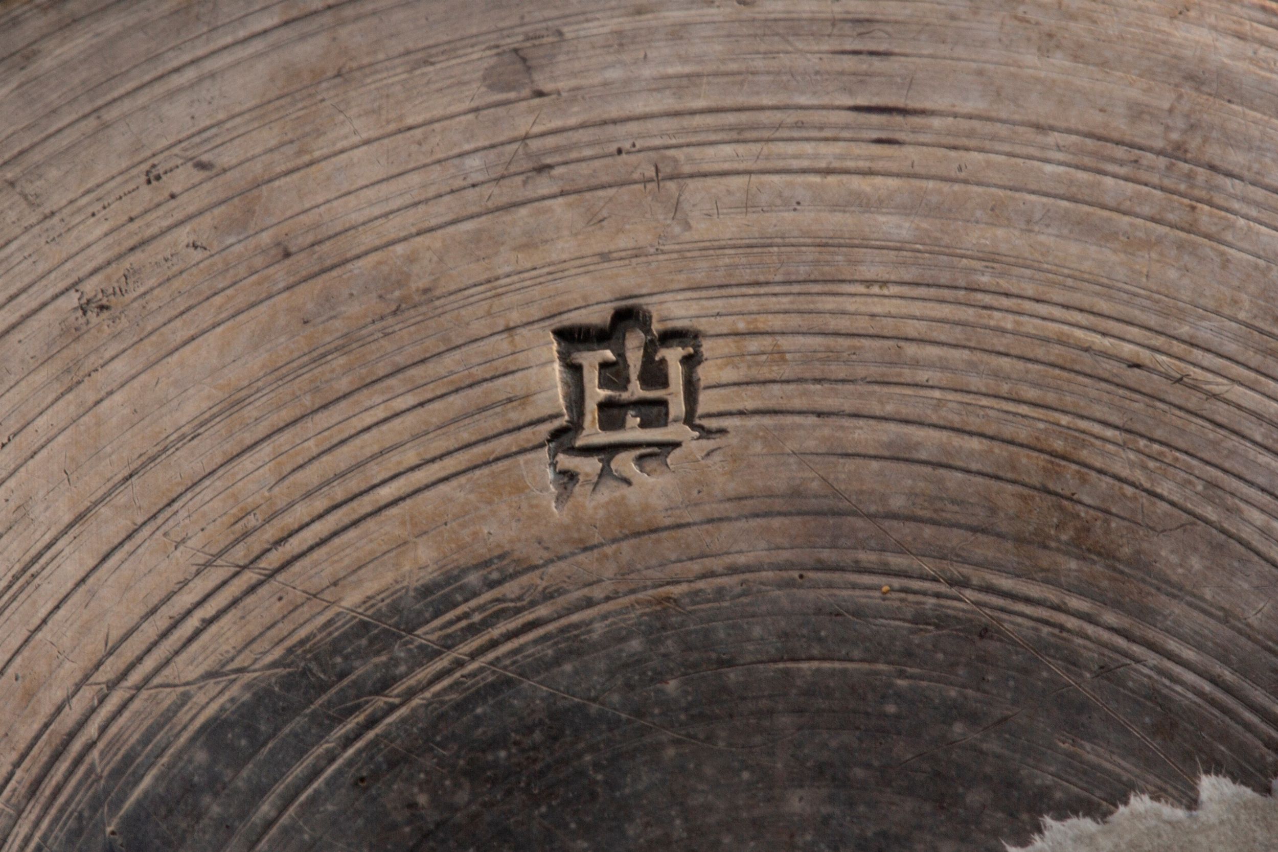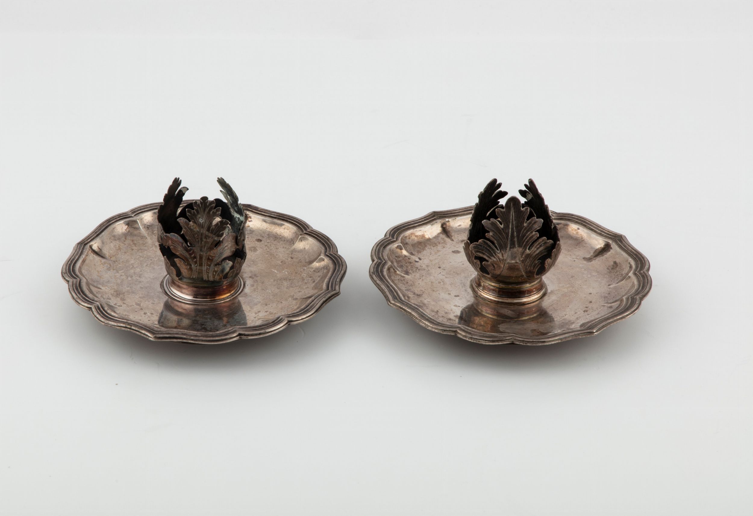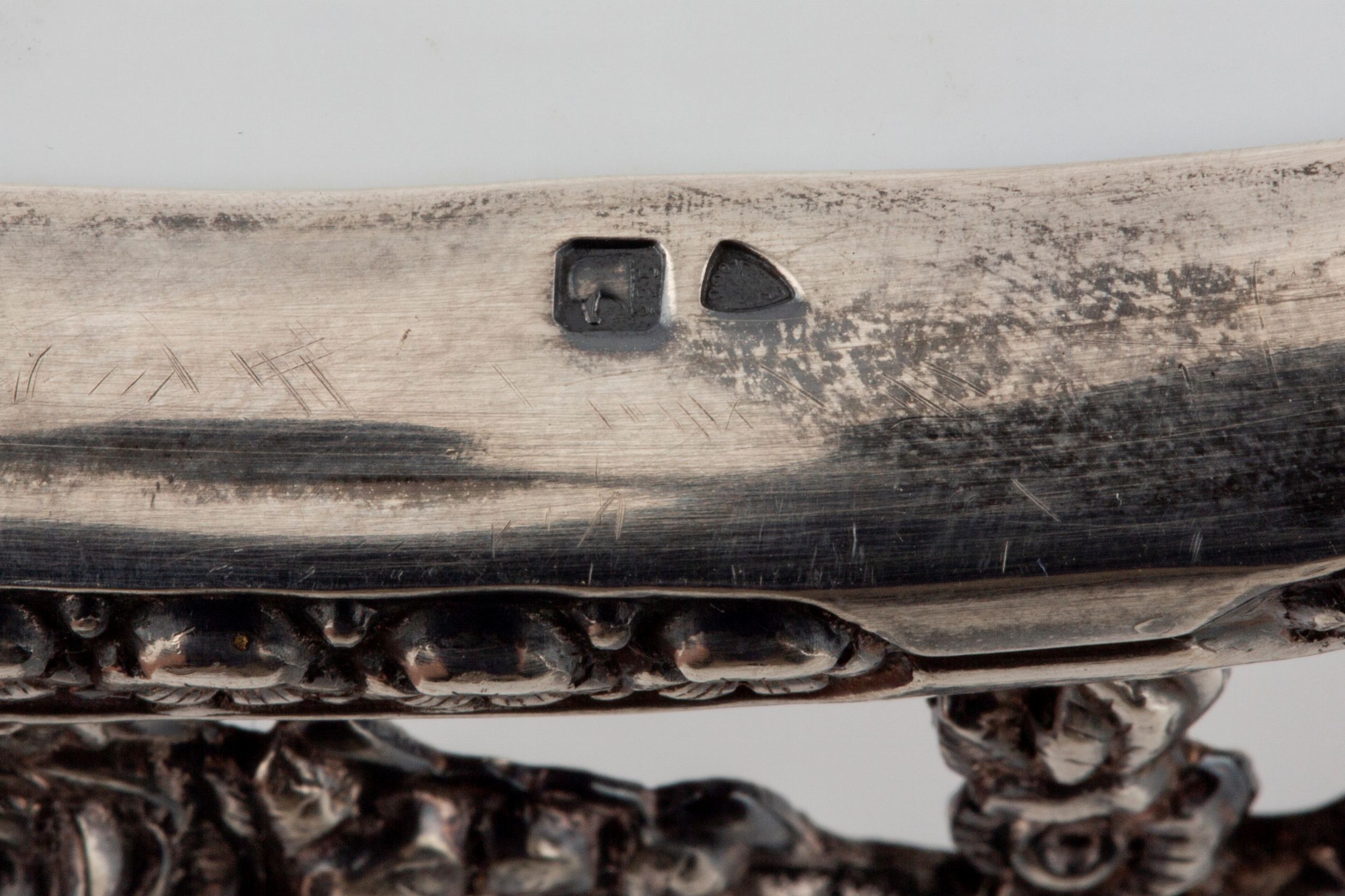 Genova, secolo XVIII punzoni della Torretta consunti, con piatto a bordo mistilineo, porta tazzine sbalzati a foggia di foglie sagomate e nervate.