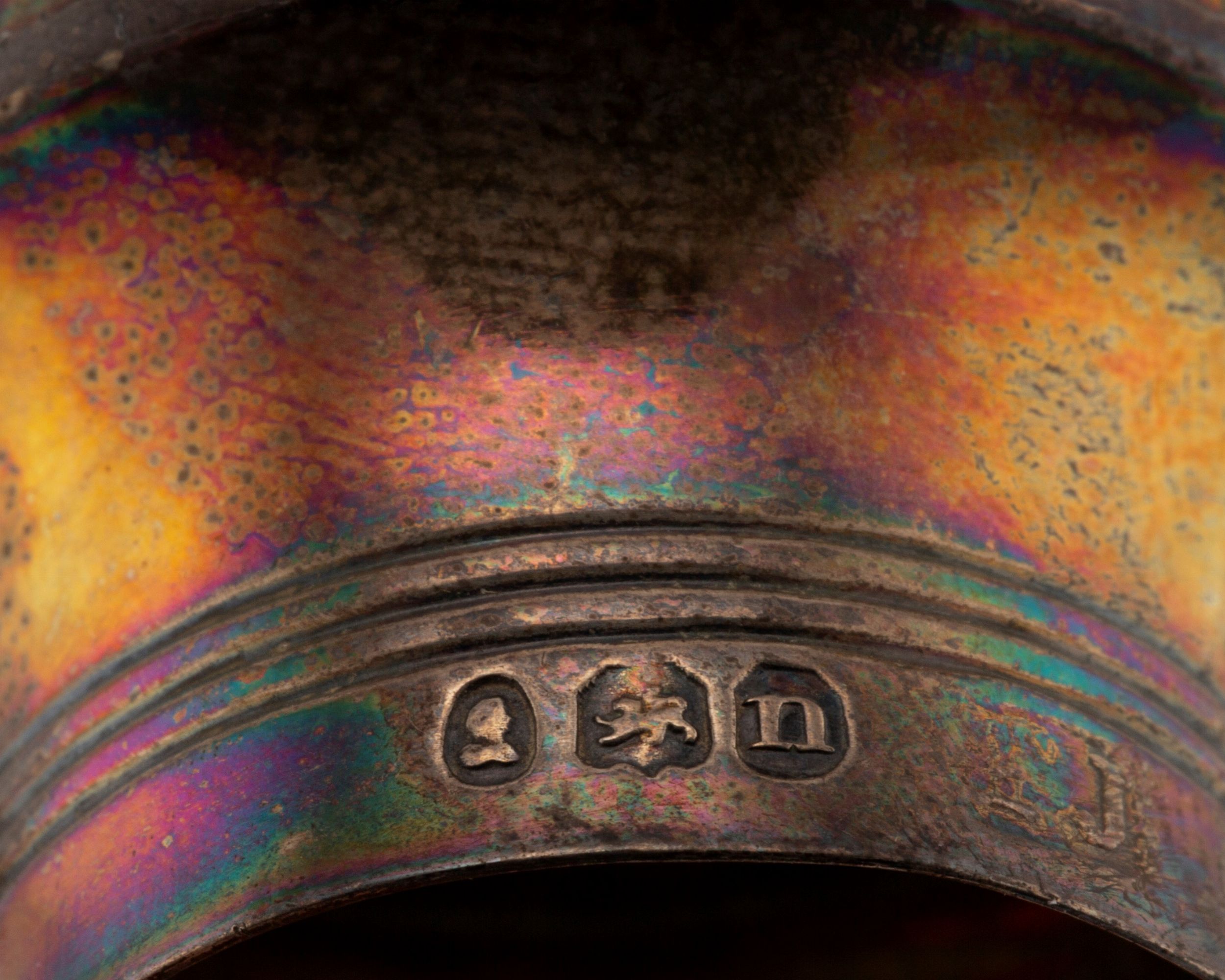 in argento, Peso g 738,00 (al netto degli inserti non in argento) h cm 25,00 x 23,50 Città di Sheffield, 1809 Argentiere RM (Richard Morton & Co?), di forma rettangolare, tappi in argento con punzoni argentiere TJ, difetti (una bottiglietta in cristallo rotta).