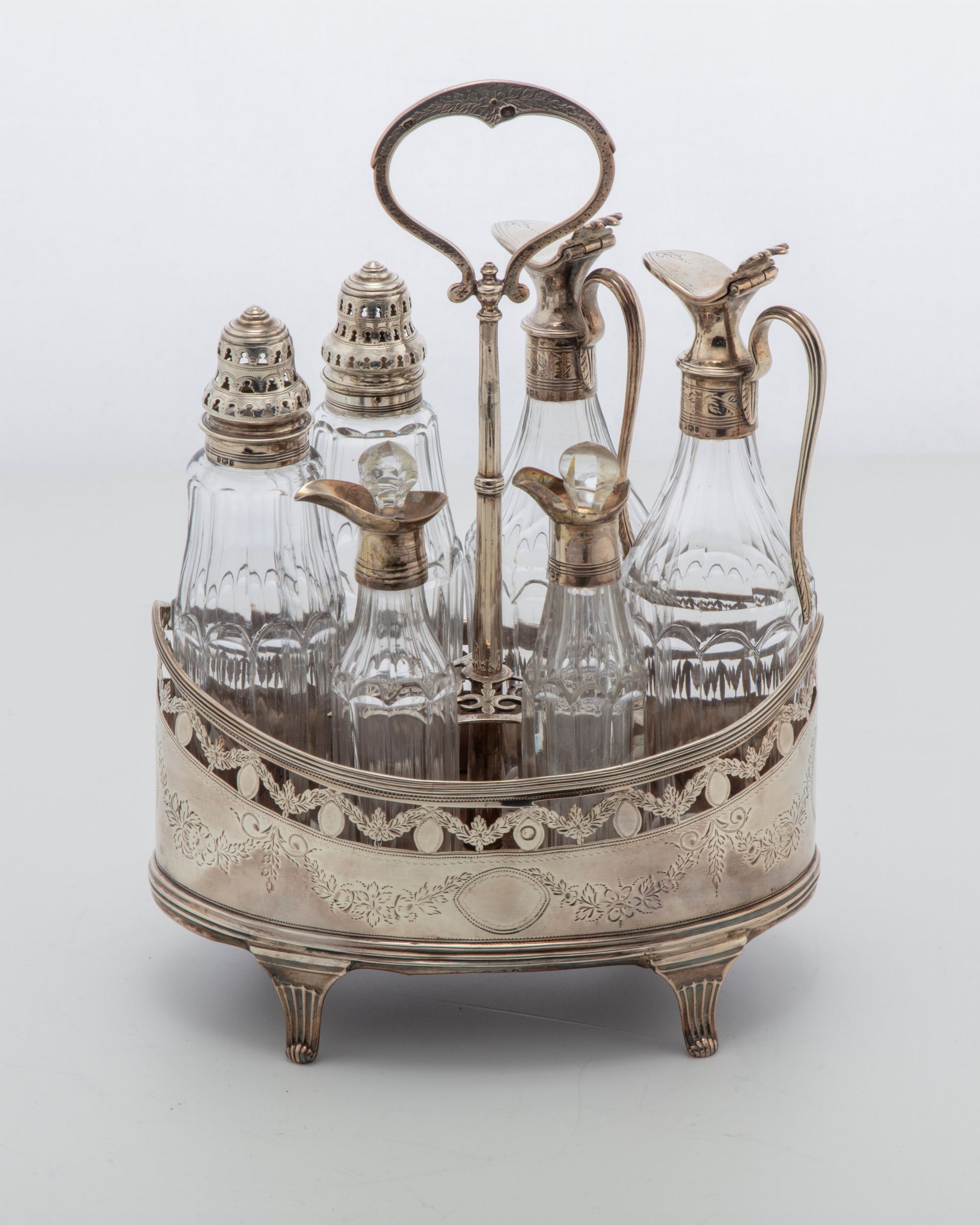 in argento e cristallo, Peso lordo kg 1,456 Londra, 1813 Punzoni dell'argentiere PBAB (Peter & Ann Bateman?), di forma ovale, poggiante su quattro piedini scanalati, inciso con festoni e fiori sul corpo, presa ad anello, sei ampolle in cristallo con tappi in argento.