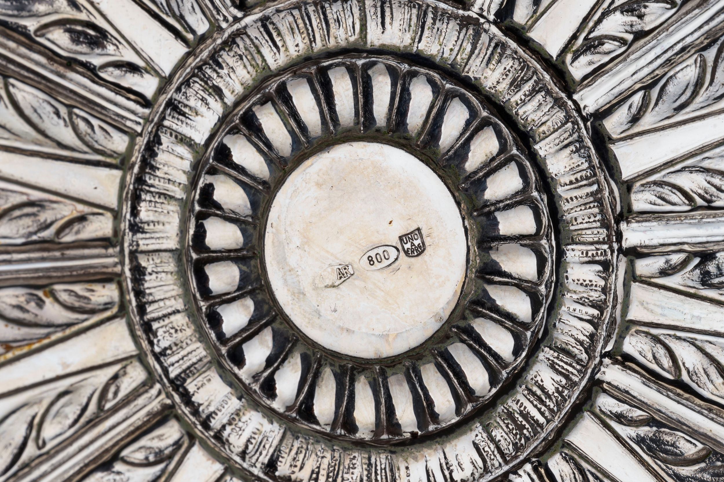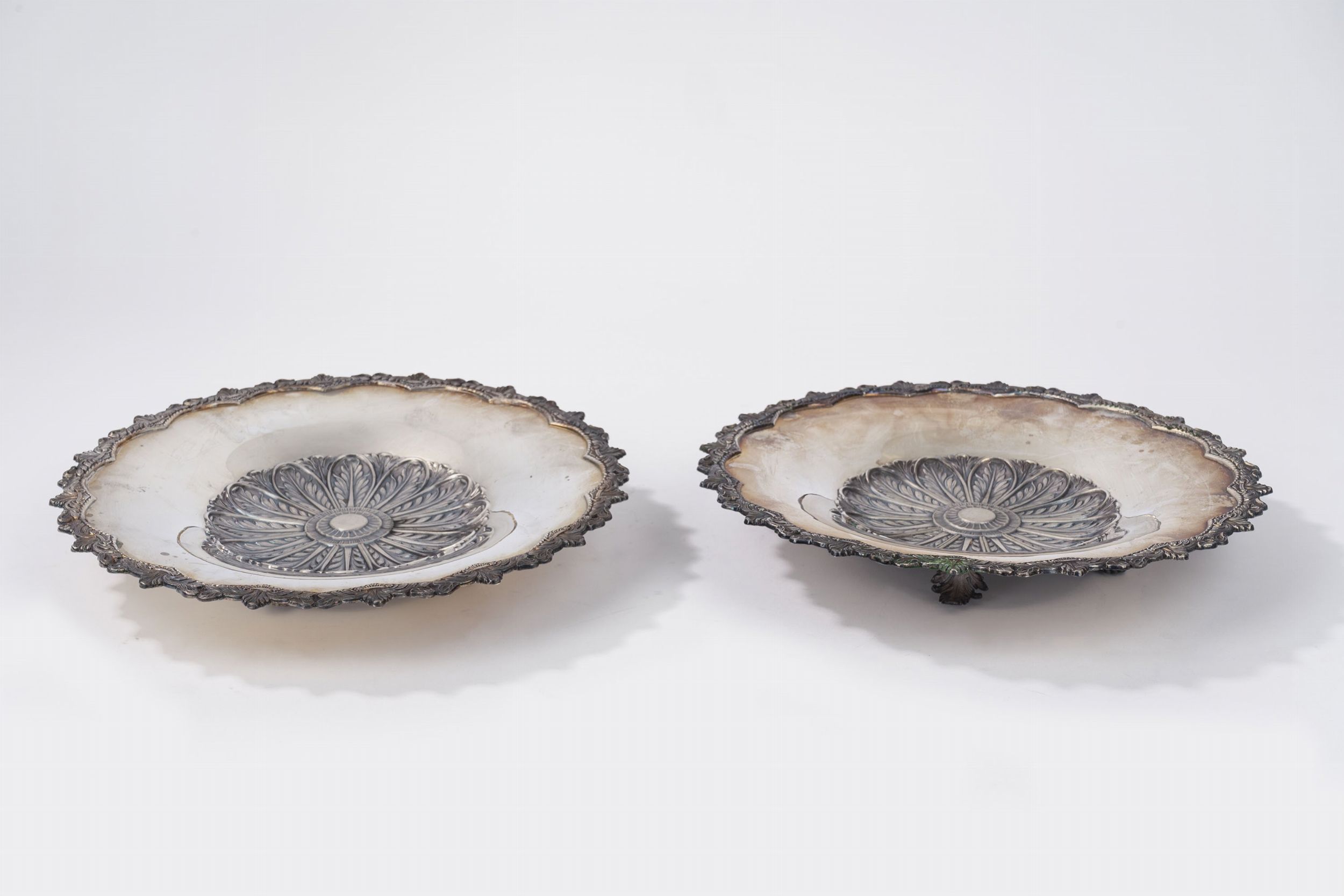 Italia, secolo XX di forma circolare, con quattro piedini a foglia, finemente sbalzate e cesellate sul bordo e al centro con motivi fogliacei.