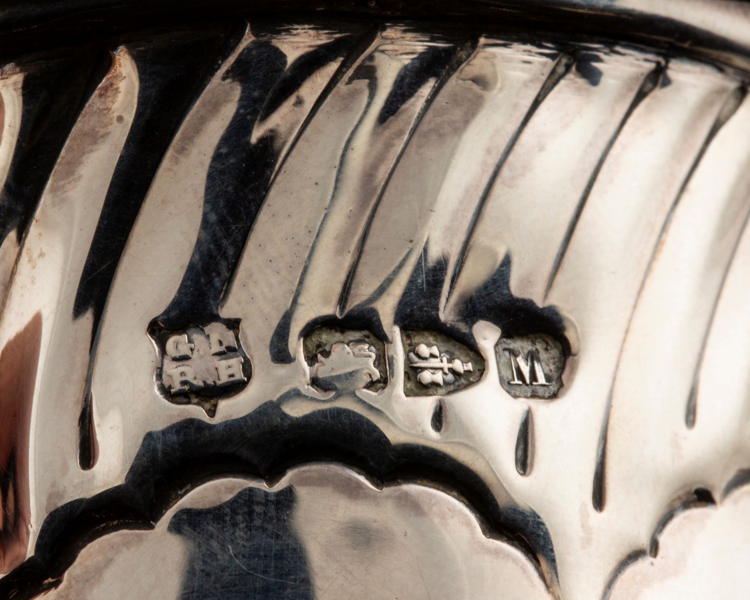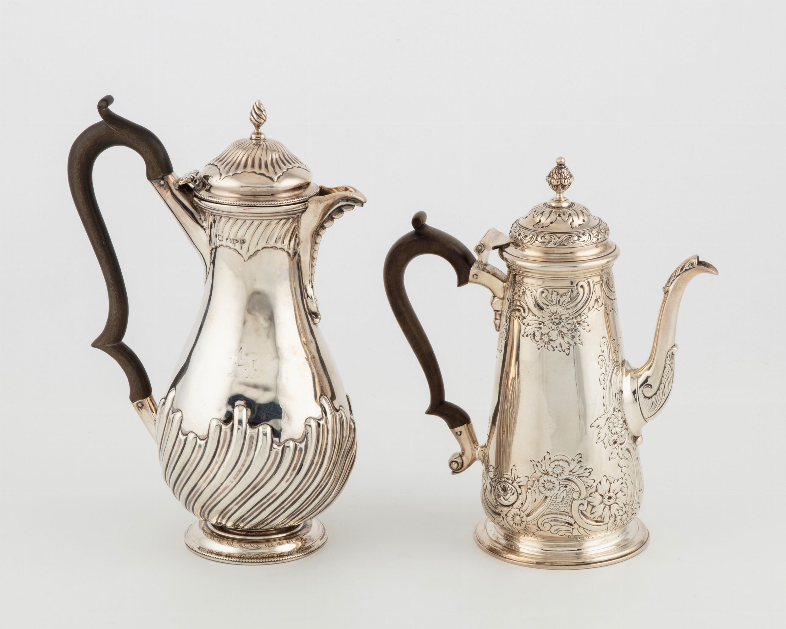 Inghilterra, fine secolo XIX una dal corpo piriforme, argentiere GNRH (George Nathan & Ridley Hayes?) Chester, 1895, motivo a torchon e presa del coperchio a fiore (h cm 24,50); l'altra sbalzata sul corpo e sul coperchio con decori floreali (h cm 21,20), (manici in legno).