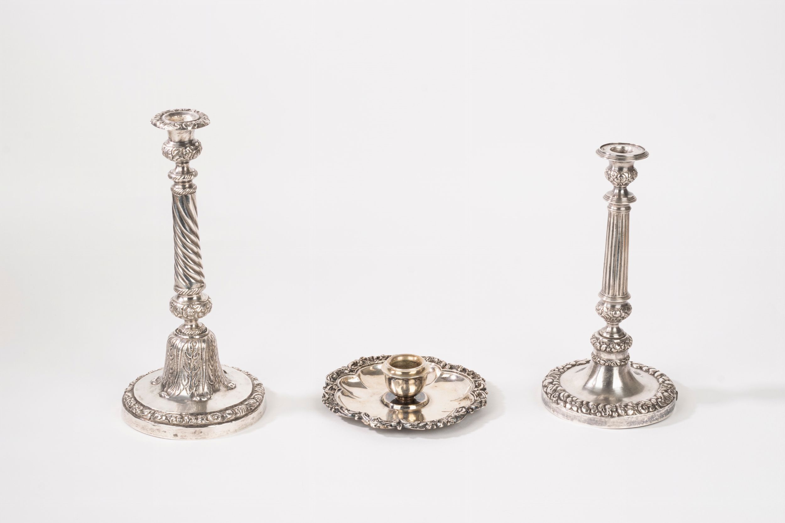 Regno delle due Sicilie, Napoli, 1832-1872 un candeliere con fusto tortile decorato con motivi vegetali, il portacandele a motivi floreali, un candeliere con fusto scanalato decorato a motivi floreali, sbalzati.