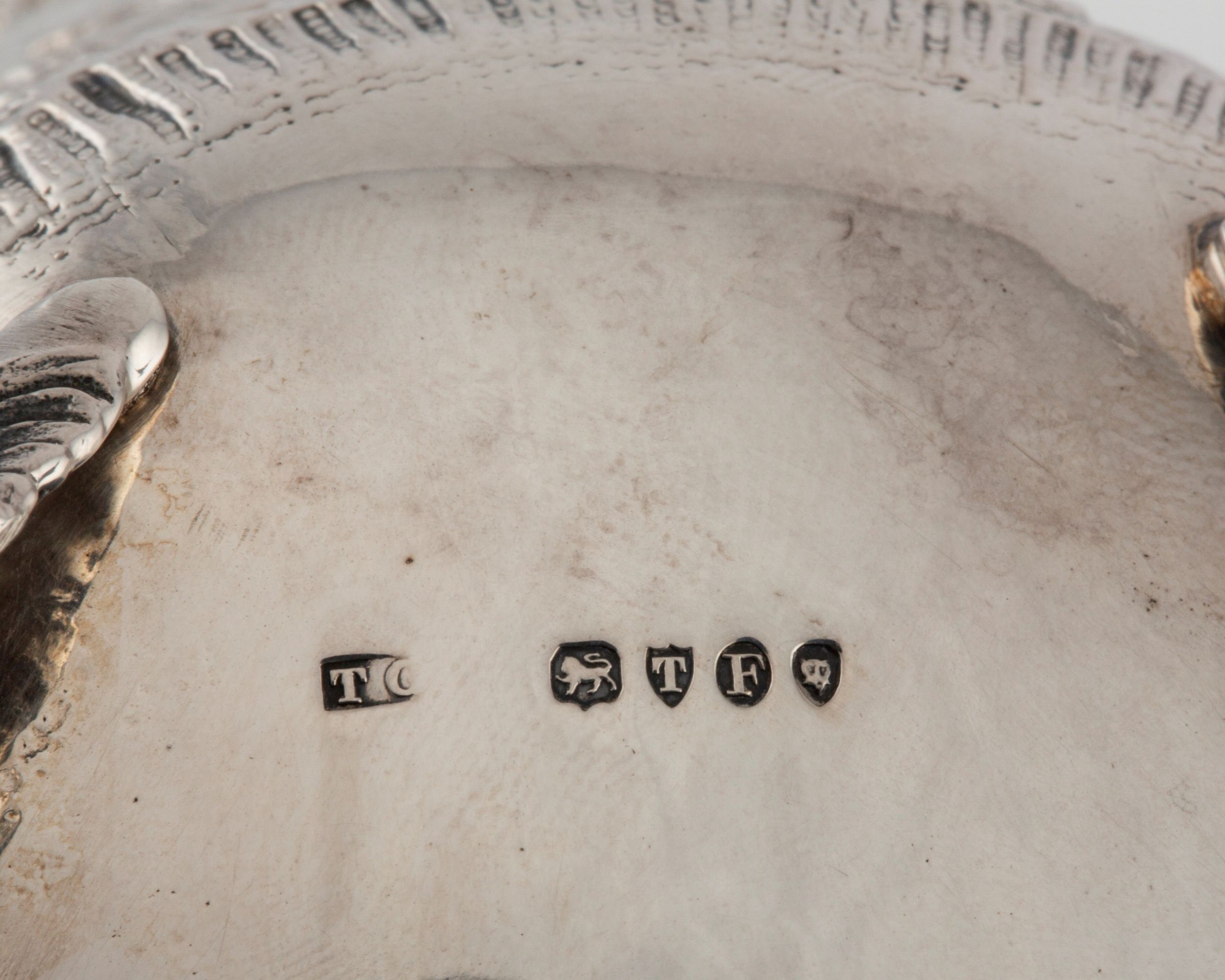 Germania, secolo XX uno biansato, traforato e sbalzato, decorato a riserve con scena galante, poggiante su quattro piedini con putti, punzoni di Hanau, inizio secolo XX e inglesi di esportazione (l cm 17,00); la più grande baccellata e poggiante su quattro piedini.