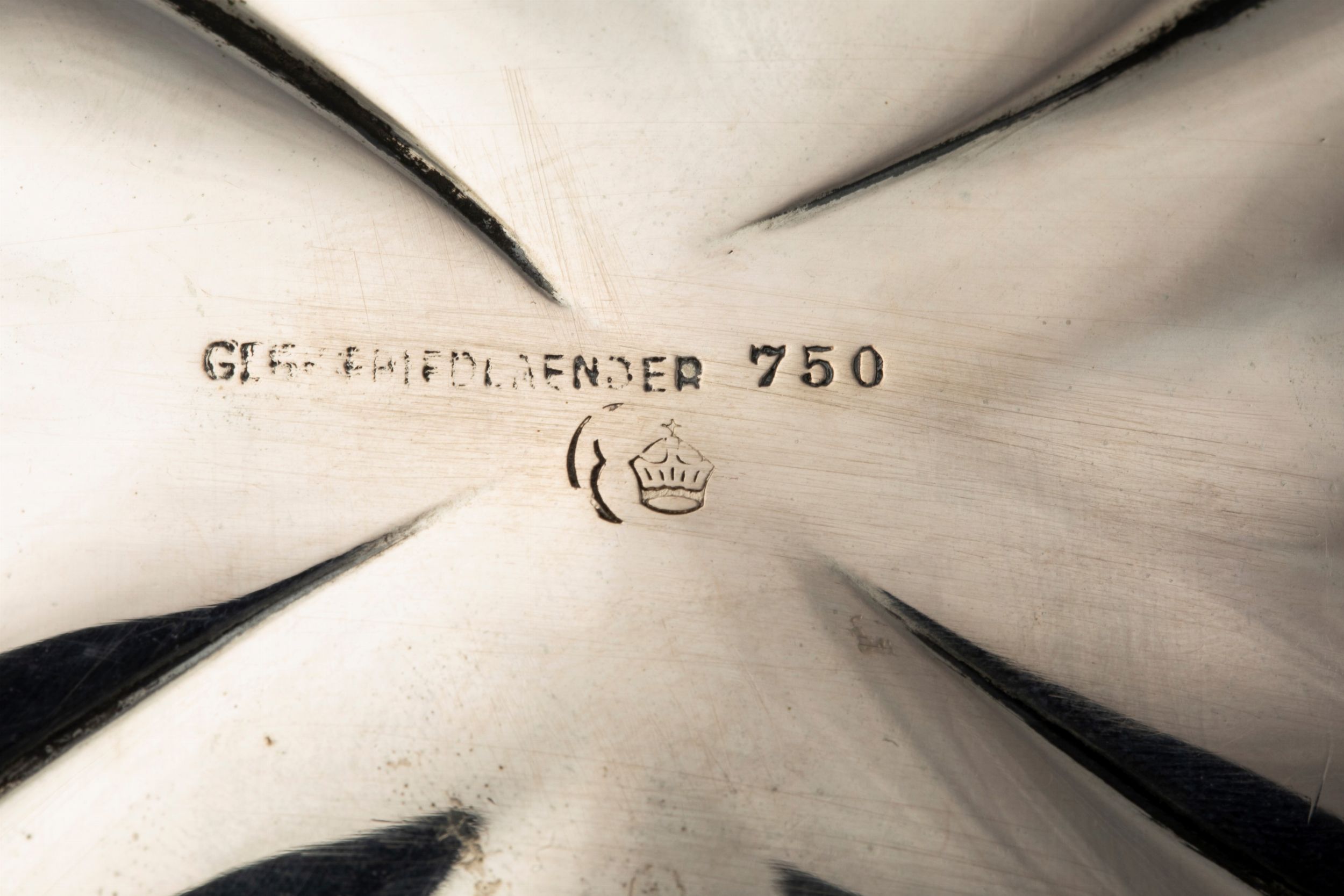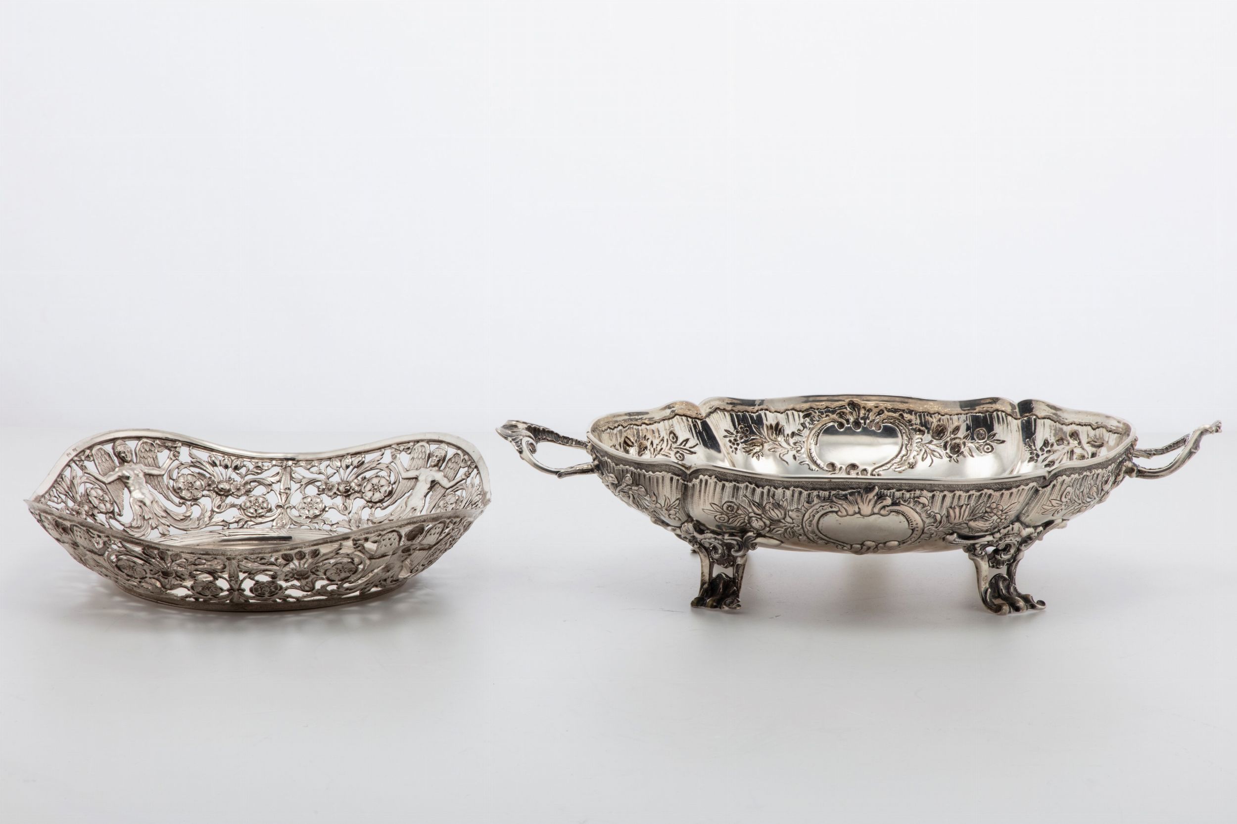 Germania, secolo XIX uno ovale poggiante su piedini ferini, biansato, sbalzato con motivi fogliacei (l cm 36,00 x 20,00) e uno traforato e sbalzato con motivi floreali e angeli (d cm 23,00).