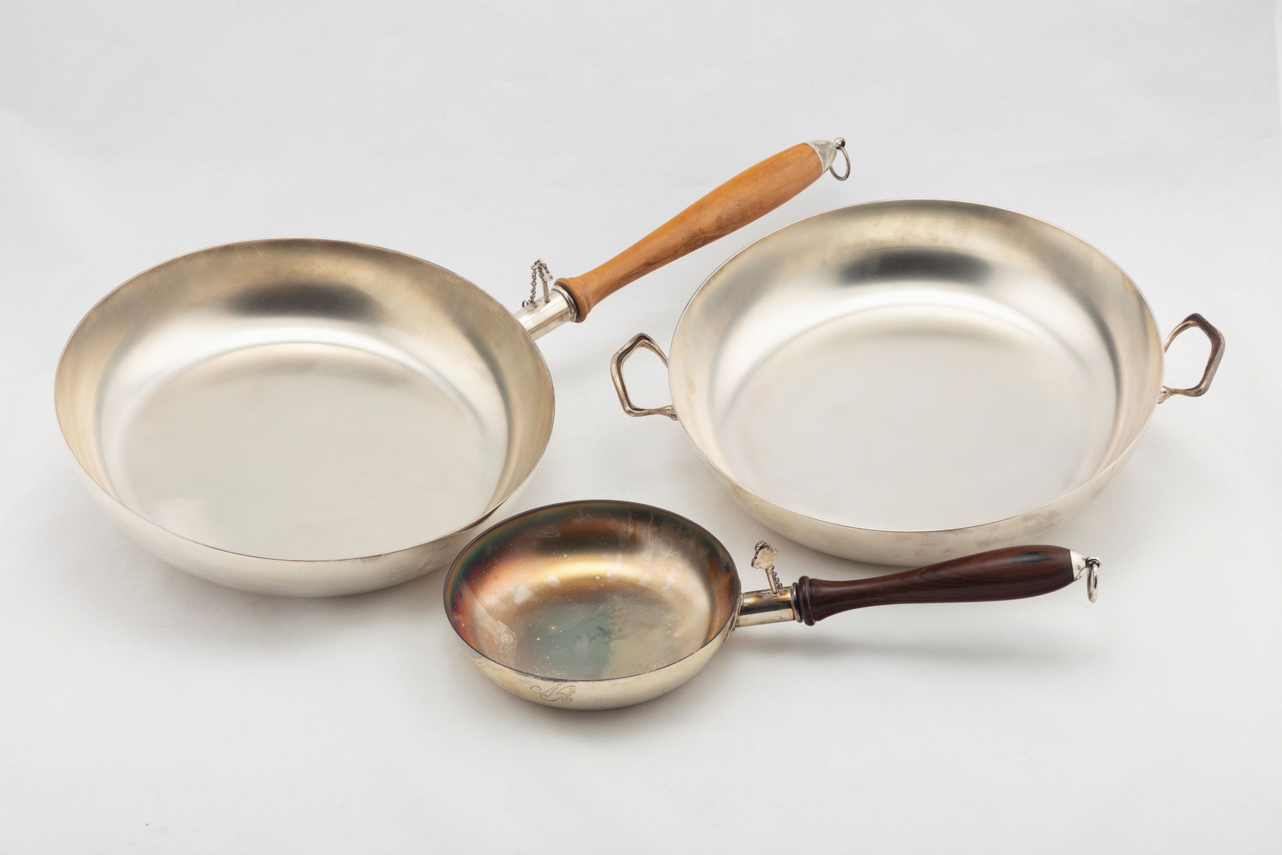 Italia, secolo XX monogrammate AN; le padelle a profilo liscio (d cm 31,50 e 17,10) con manici in legno; il tegame con due manici (d cm 38,20), manici amovibili.