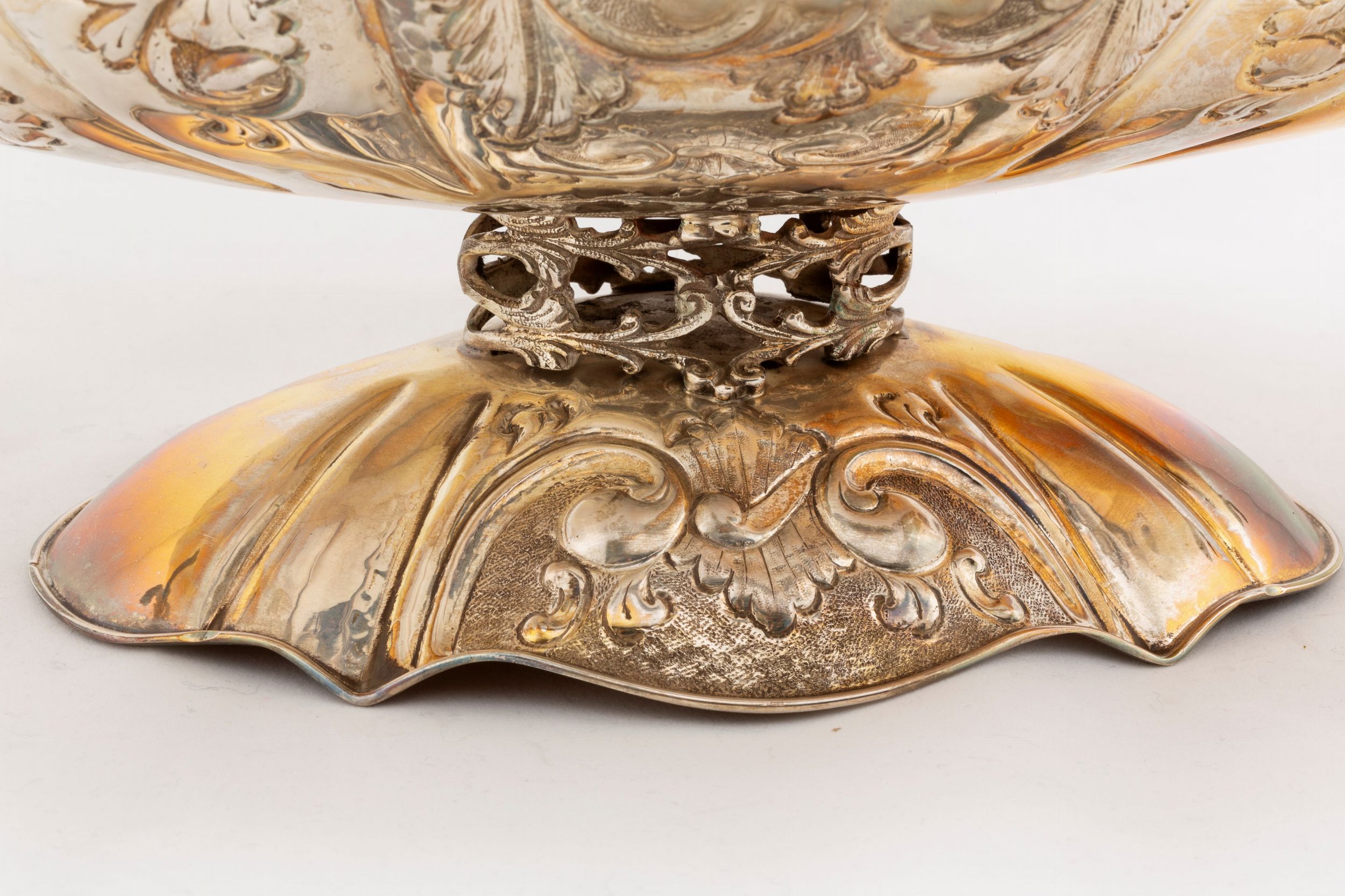 Italia, secolo XX bacellata e sbalzata con decori floreali, anse a volute fogliacee, base polilobata cesellata e sbalzata.
