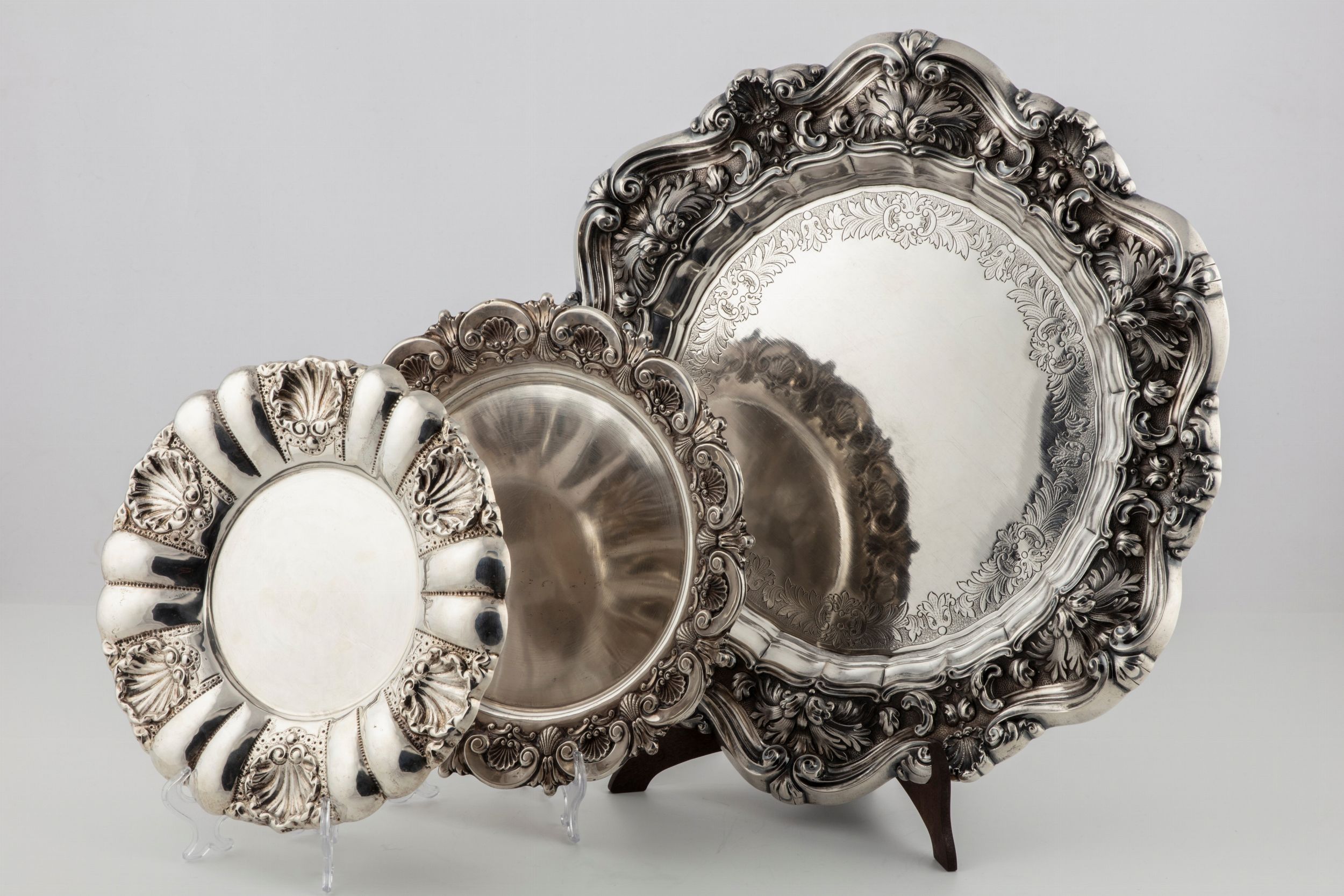 Porto, secolo XX il vassoio di forma circolare, profilo mistilineo, finemente sbalzato e cesellato con motivi fogliacei e conchiglie e inciso con motivi fogliacei; i due piatti bordo a volute con decori sbalzati a rilievo con conchiglie.