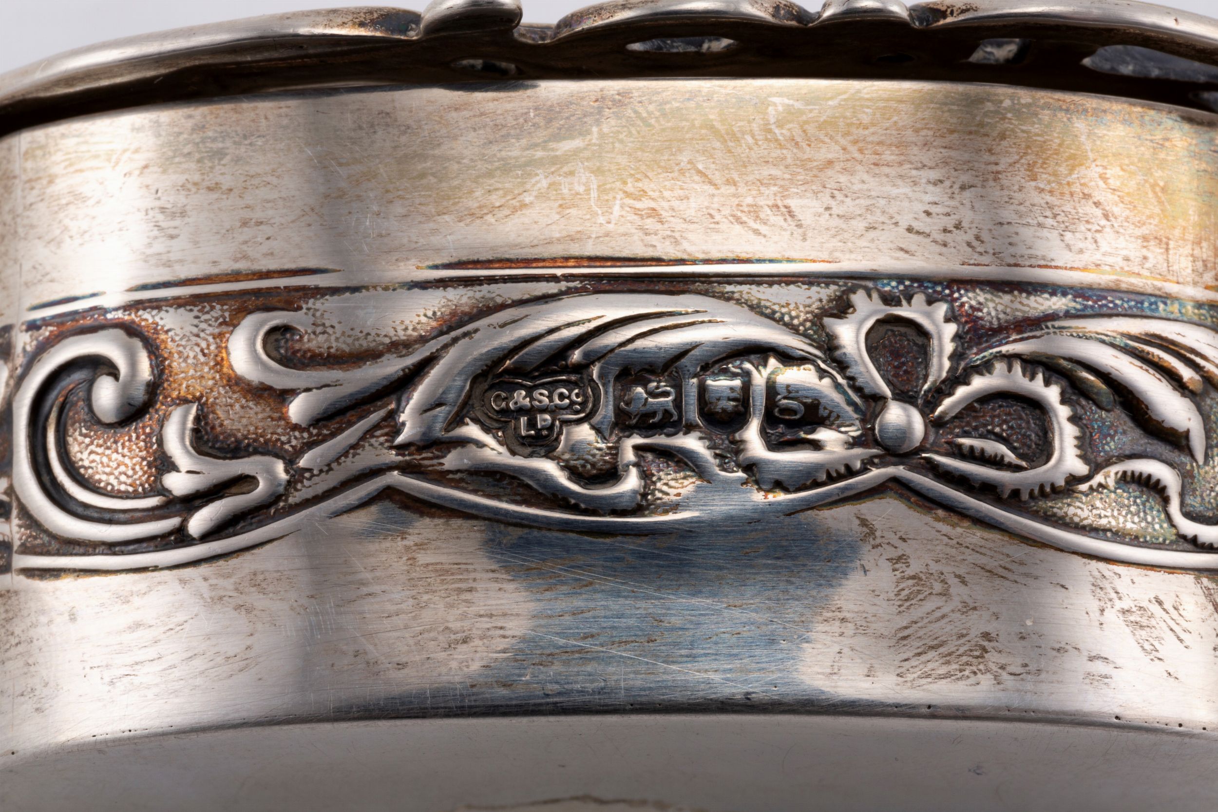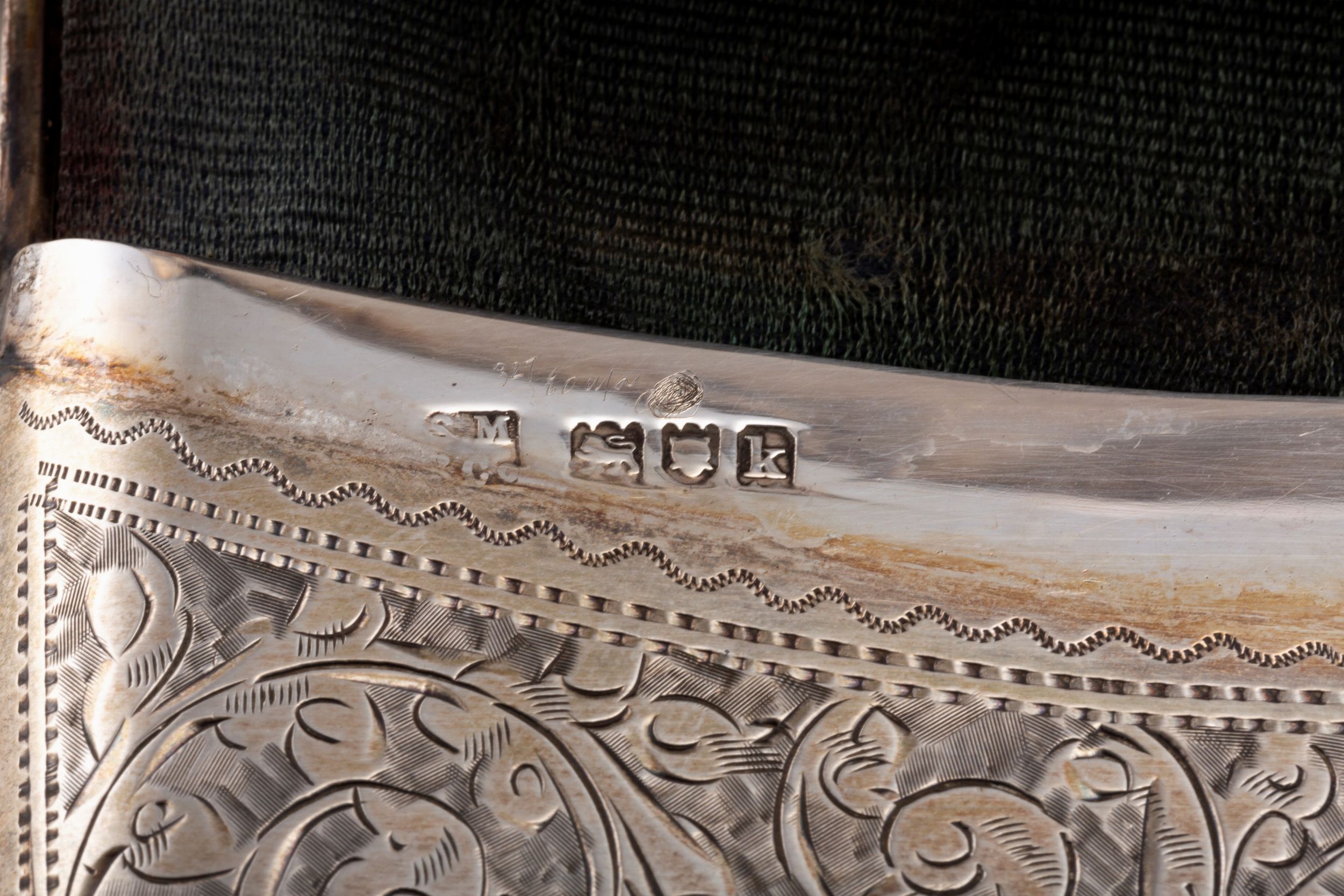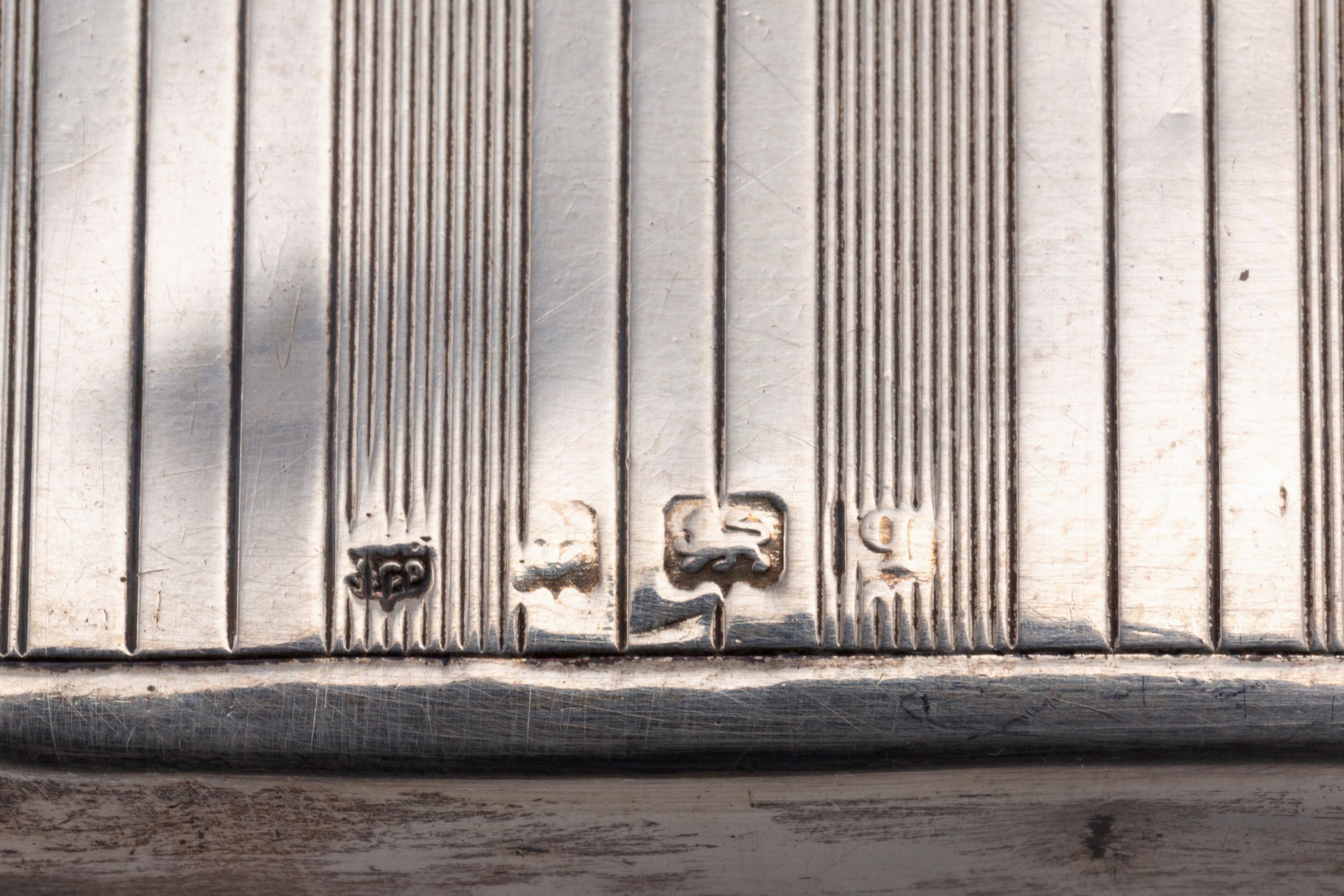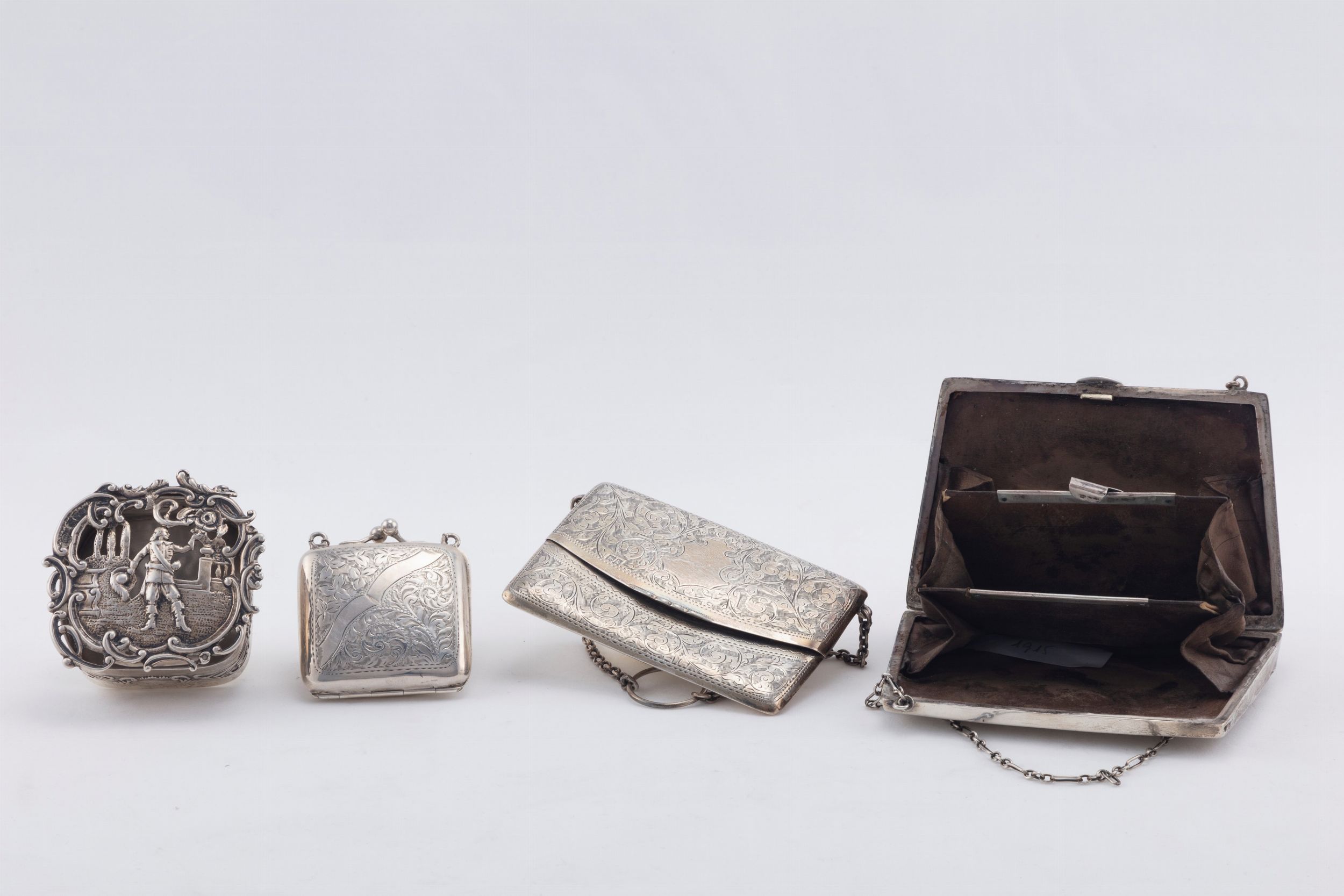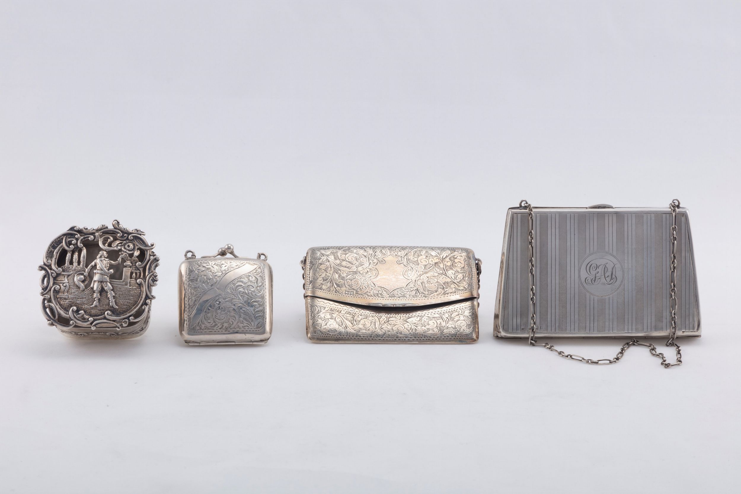 Londra, secolo XX composto da un porta biglietti di forma rettangolare finemente inciso con decori fogliacei e stemma (l cm 10,50), un porta biglietti zigrinato centrato da monogramma (l cm 12,00), un portamonete inciso con decori floreali e fascia (l cm 5,50), una scatolina sbalzata con figura galante in giardino (l cm 6,50), difetti.