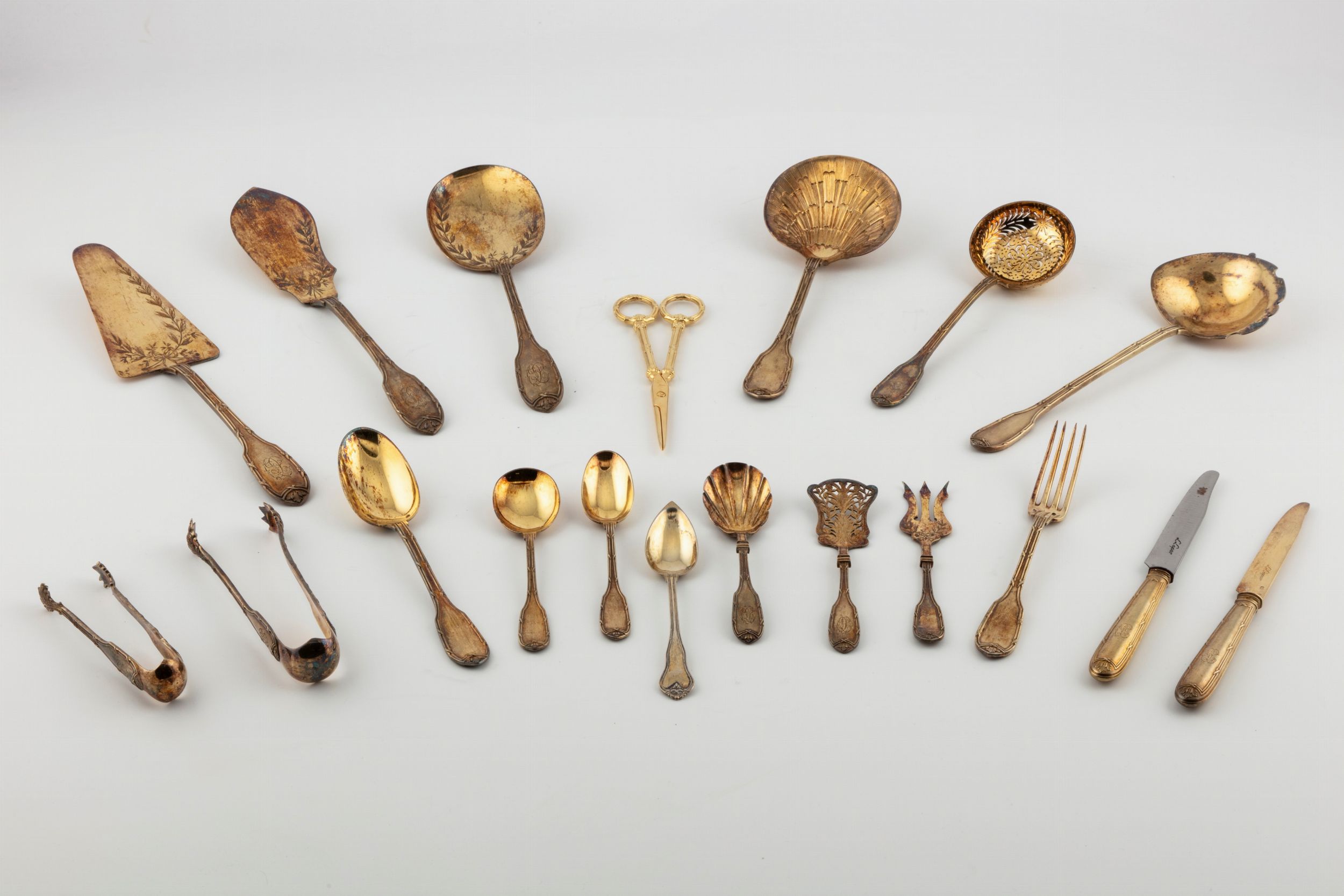 in argento 950 e vermeil, Peso netto kg 9,060 (kg 12,455 compresi dei coltelli e delle forbici)