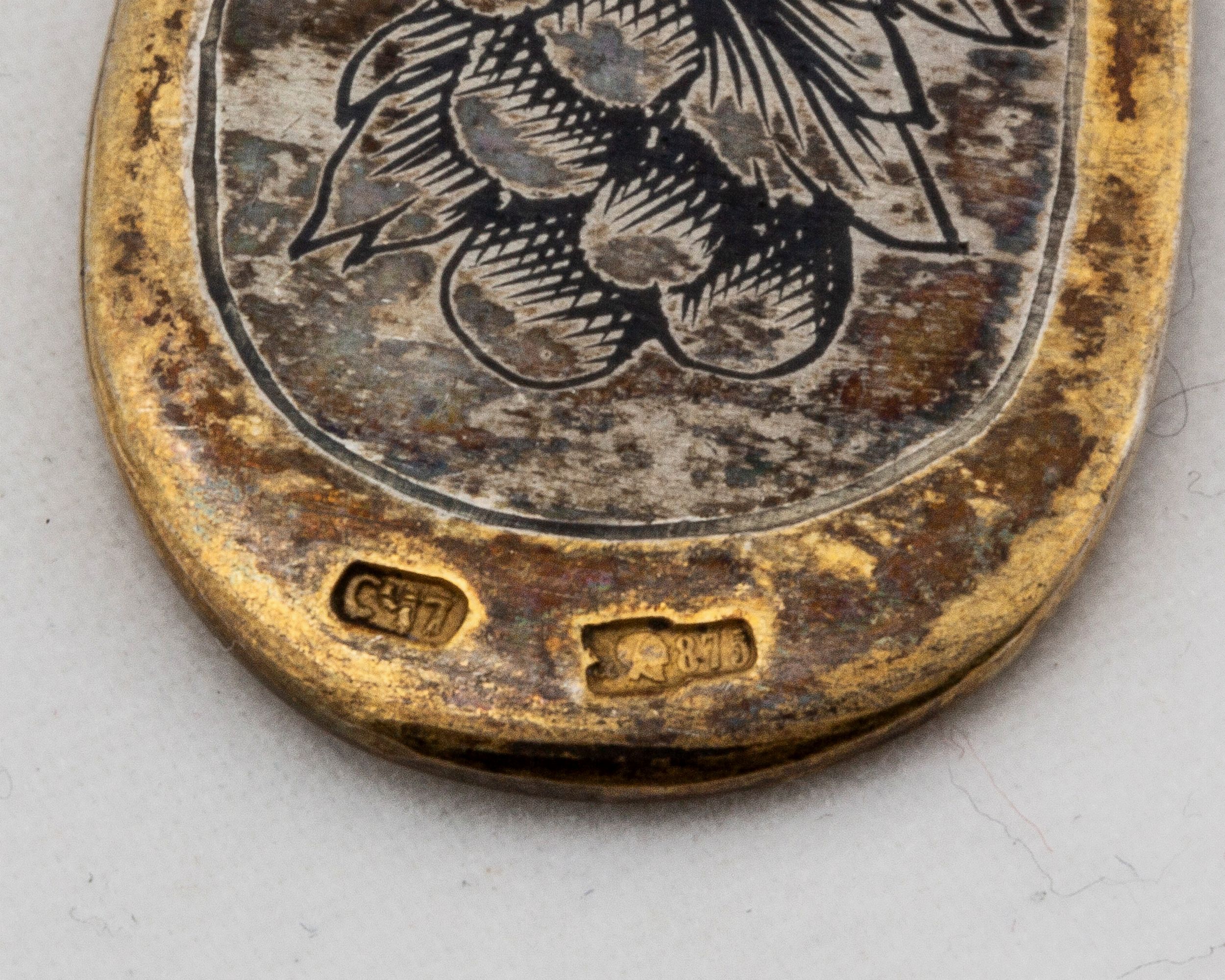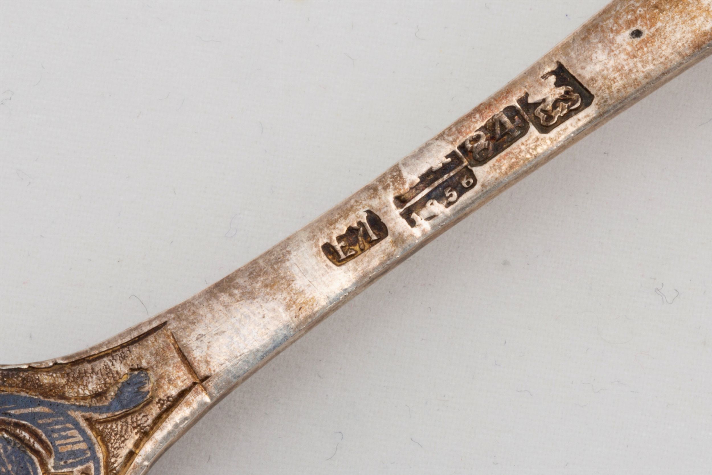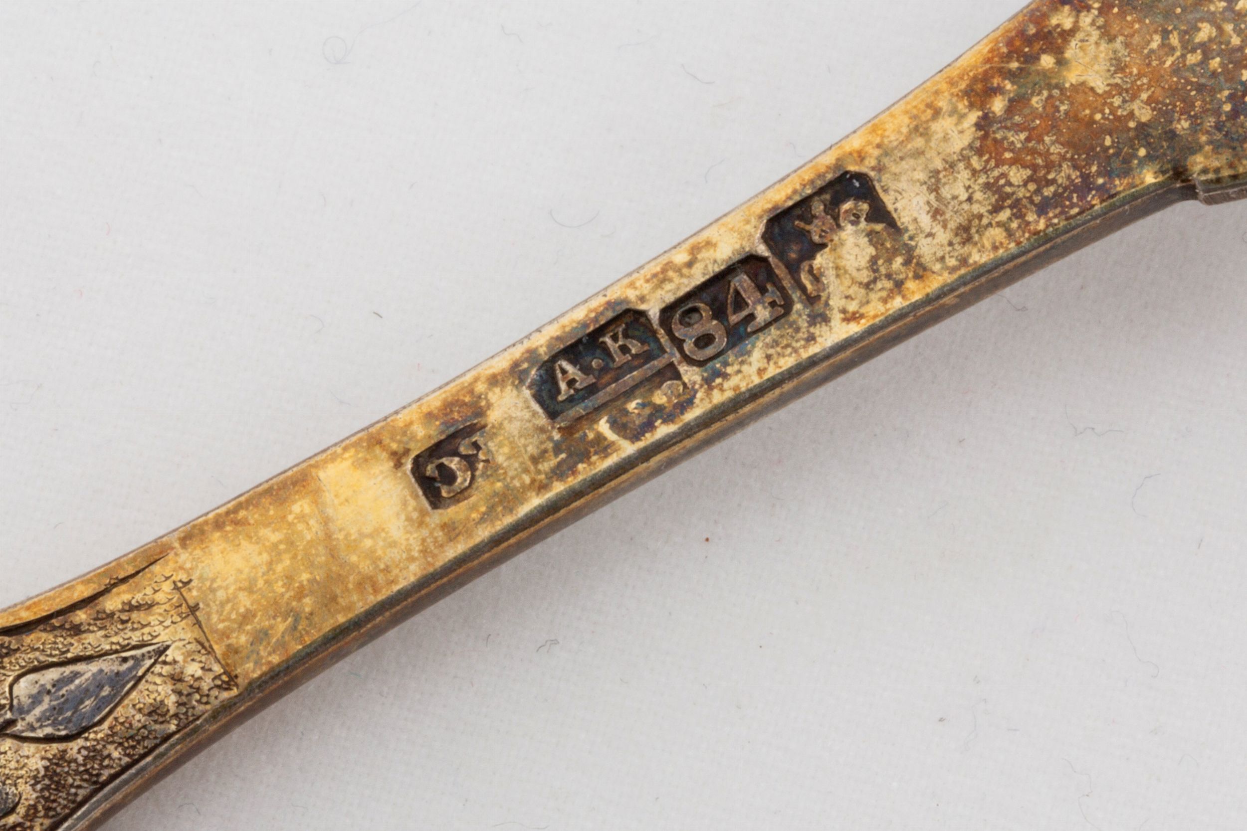 in argento niellato e vermeil, Peso g 356,00 l cm 15,50 Russia, secolo XIX/XX due cucchiai niellati e decorati con motivi floreali, punzoni della città di Mosca seconda metà del secolo XIX, saggiatore A-K 1856; sei cucchiai niellati con festoni, fiori e frutta, punzoni dell'argentiere consunti e non identificati.
